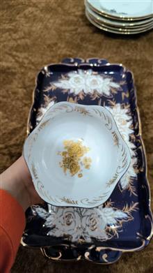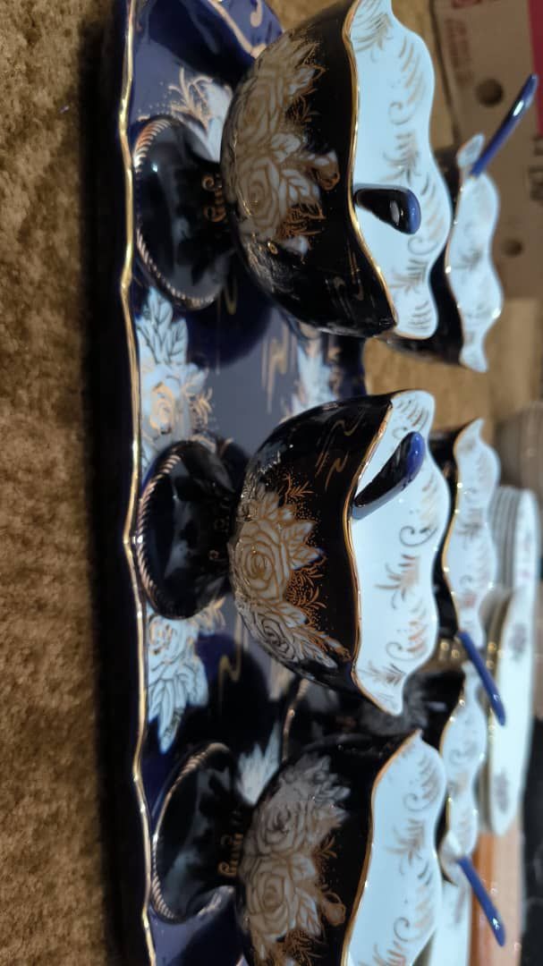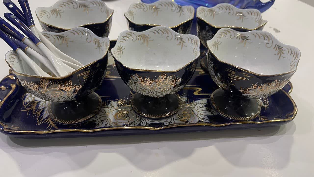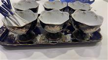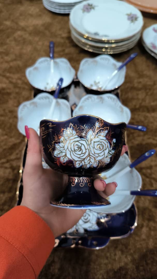 یک دست بستنی خوری گل برجسته مارک چک با قاشق و سینی زیر آن همگی نو و ابنخورده هستن