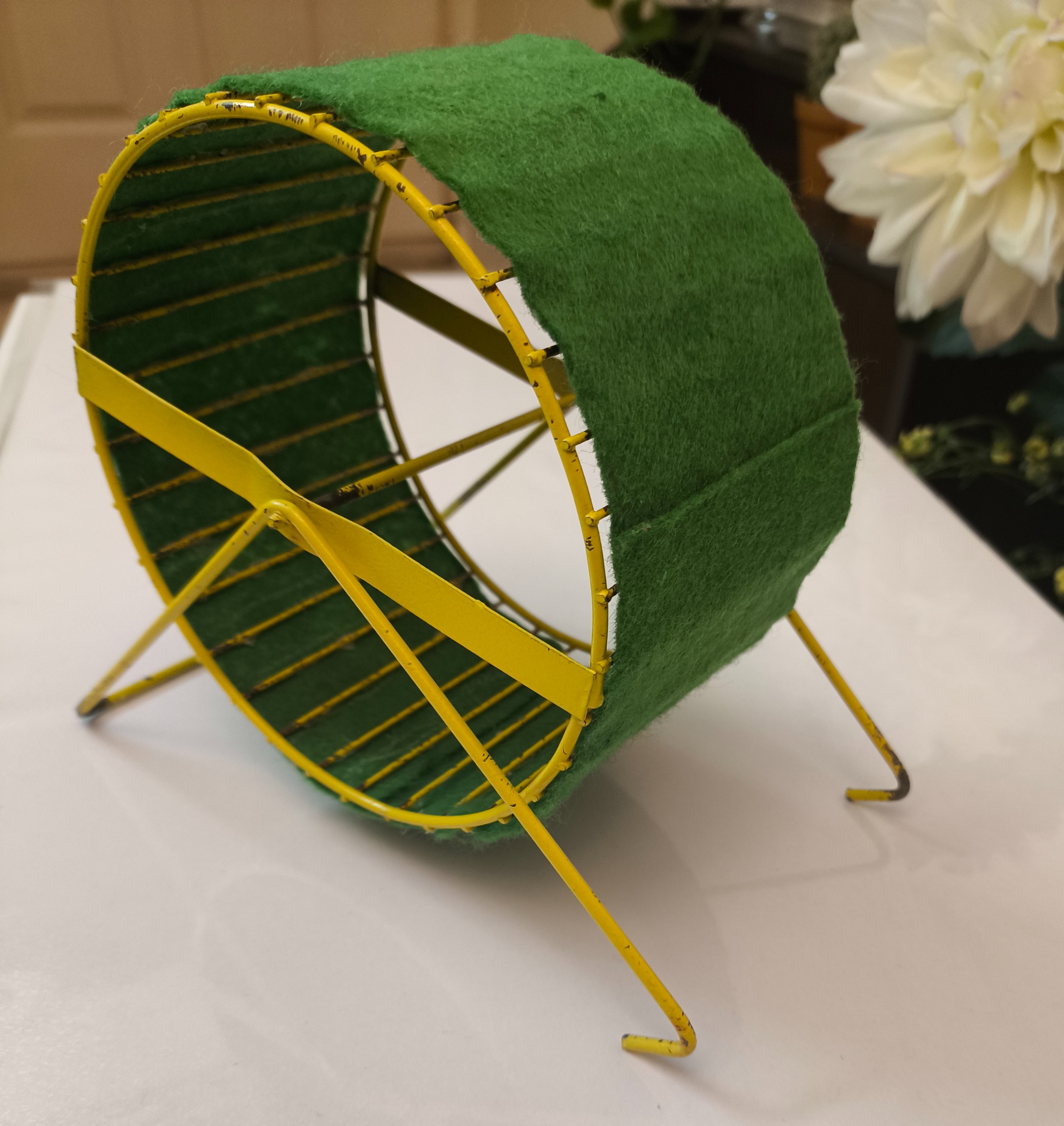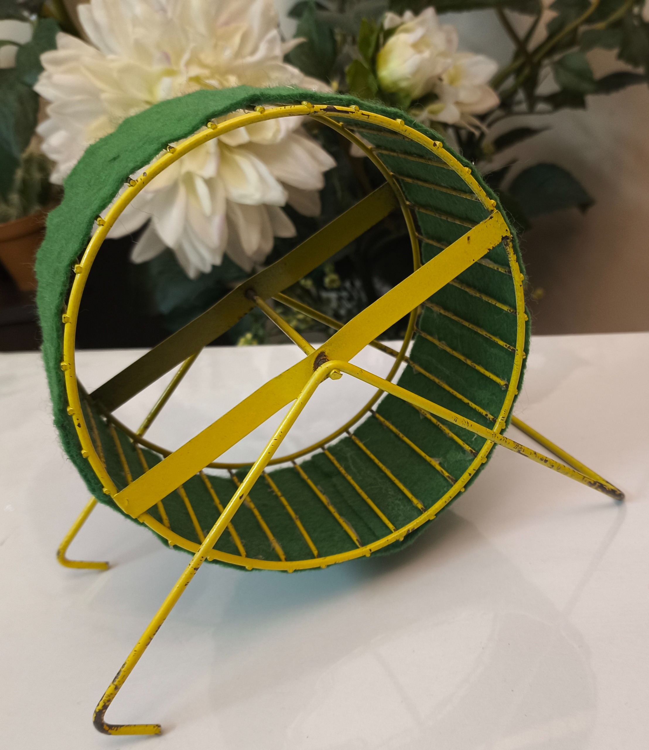 - پارچه نمدی سبز رنگ روی چرخ و فلک چسبانده شده تا همستر احساس بهتری داشته باشد و پایش بین میله ها گیر نکند.