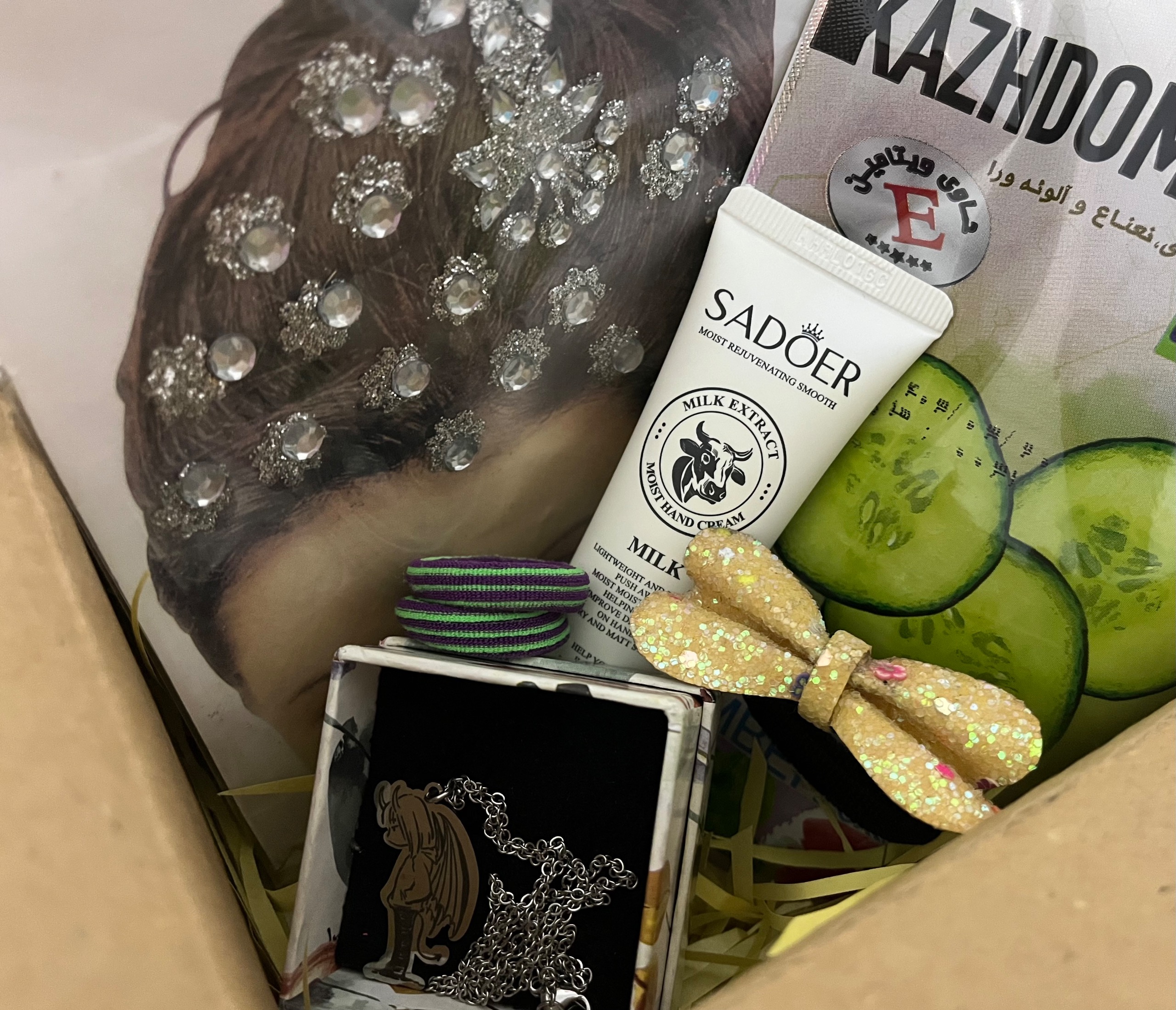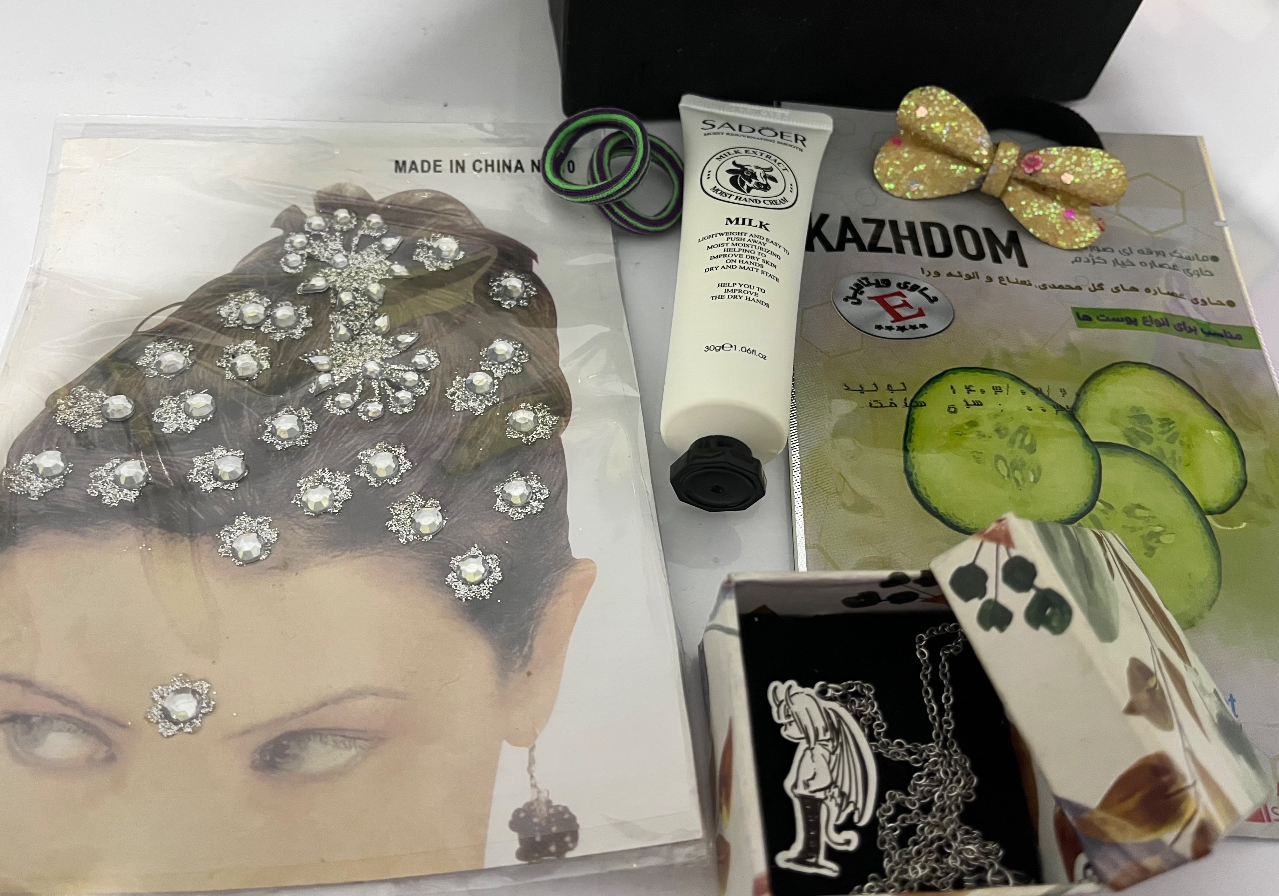 گردنبند، ماسک صورت، کرم دست، برچسب مو، یک کش مو گلدار