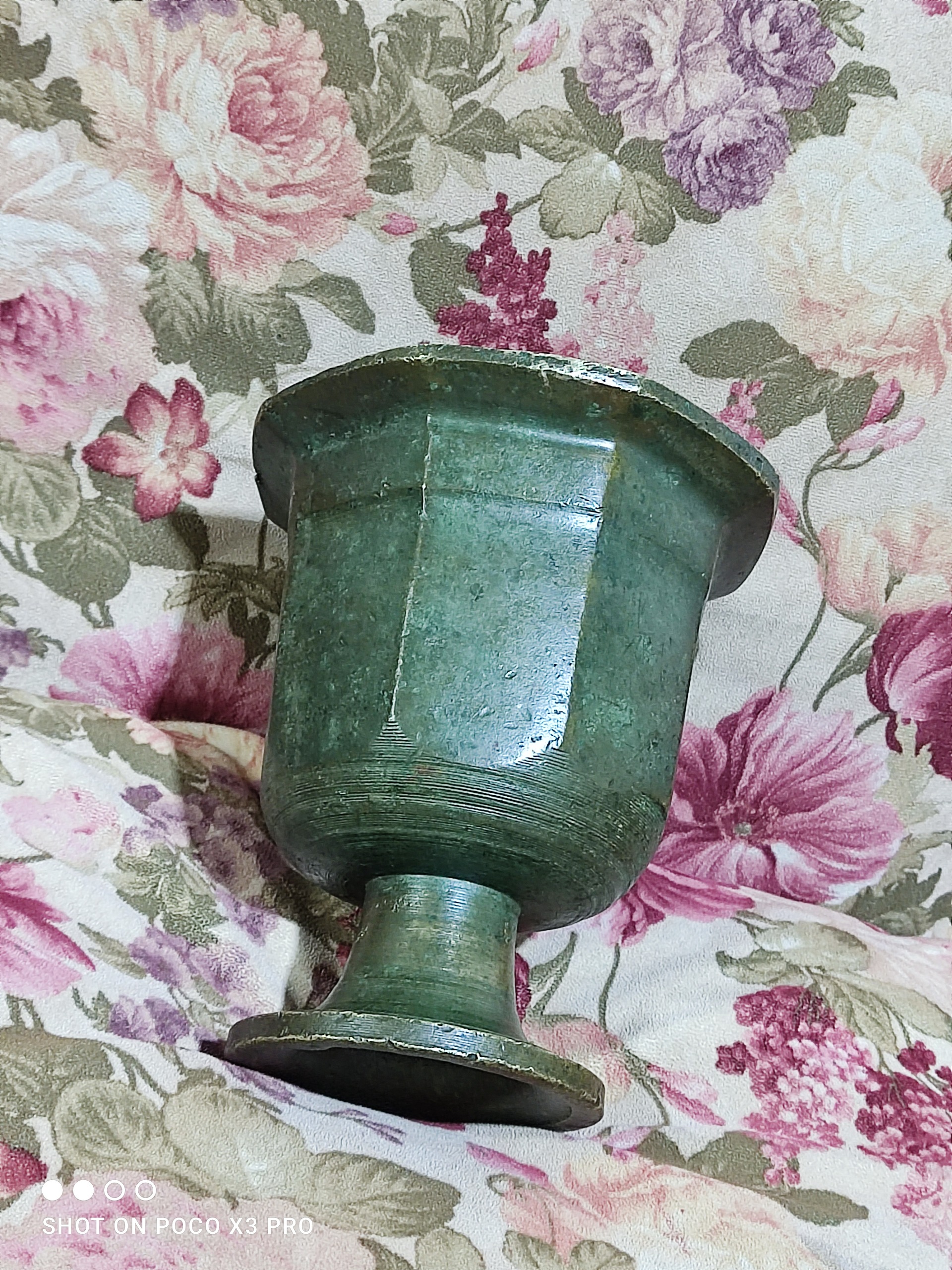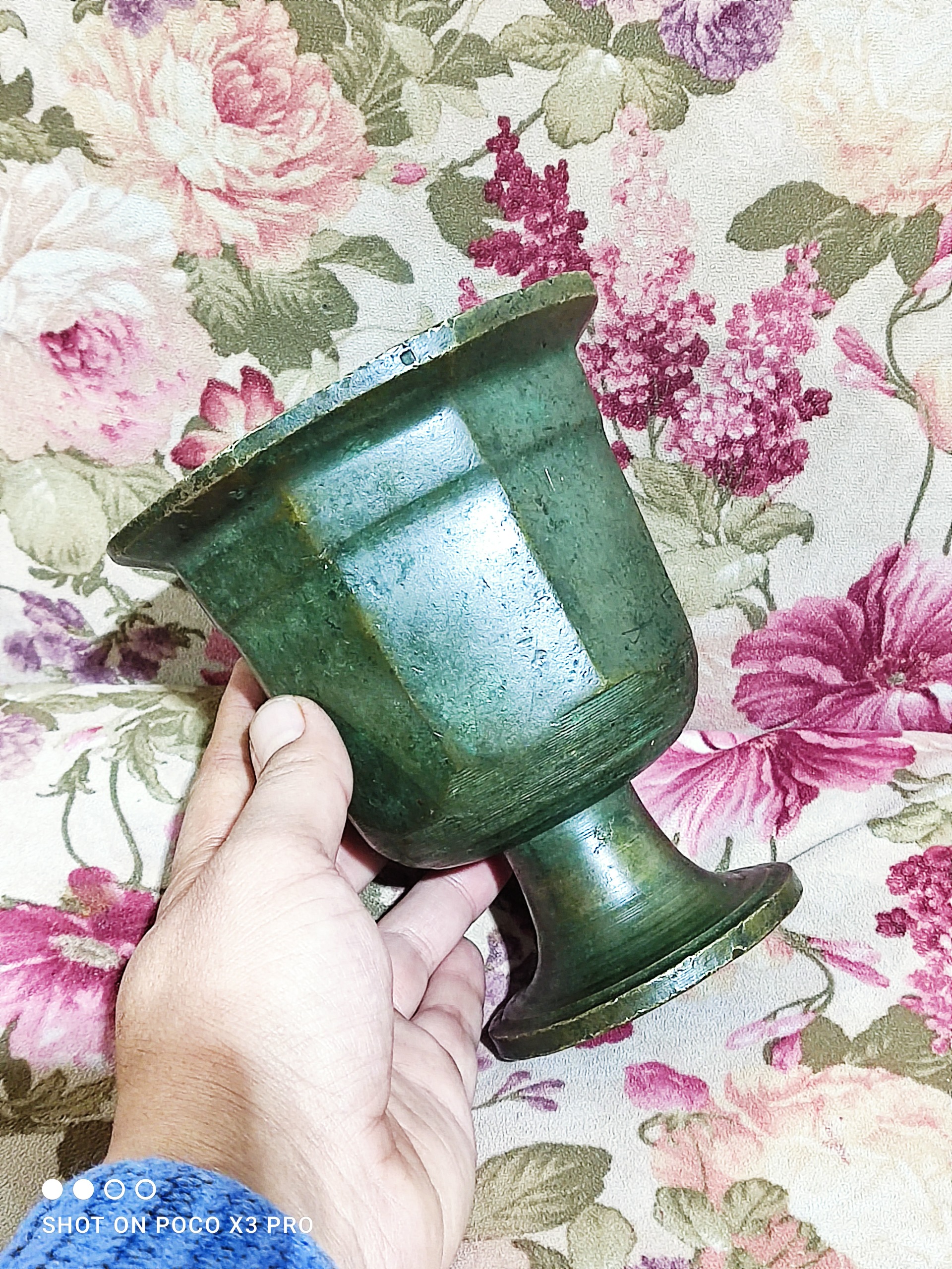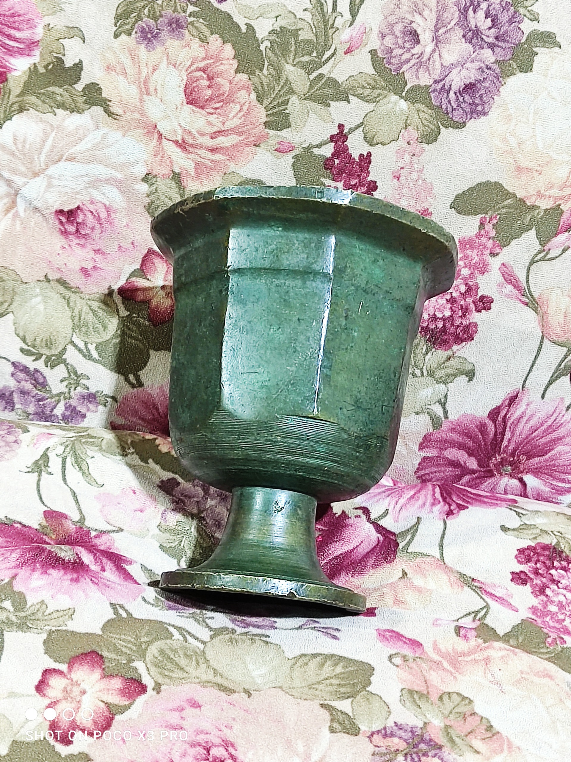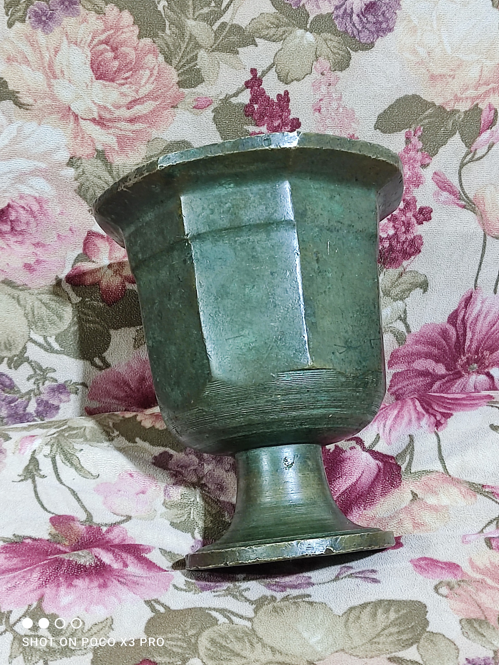 یک عدد هاون برنجی گلدونی بسیار بسیار کهنه و زیرخاکی سالم و تمیز و بکر مطابق تصاویر دو کیلویی وزنشه فعلا دسته نداره قدمت این هاون روسی بالای صد سال میشه 14 سانت سایز دهنشه و ارتفاعشم 15/5 سانت کاملا دستساز و آنتیک