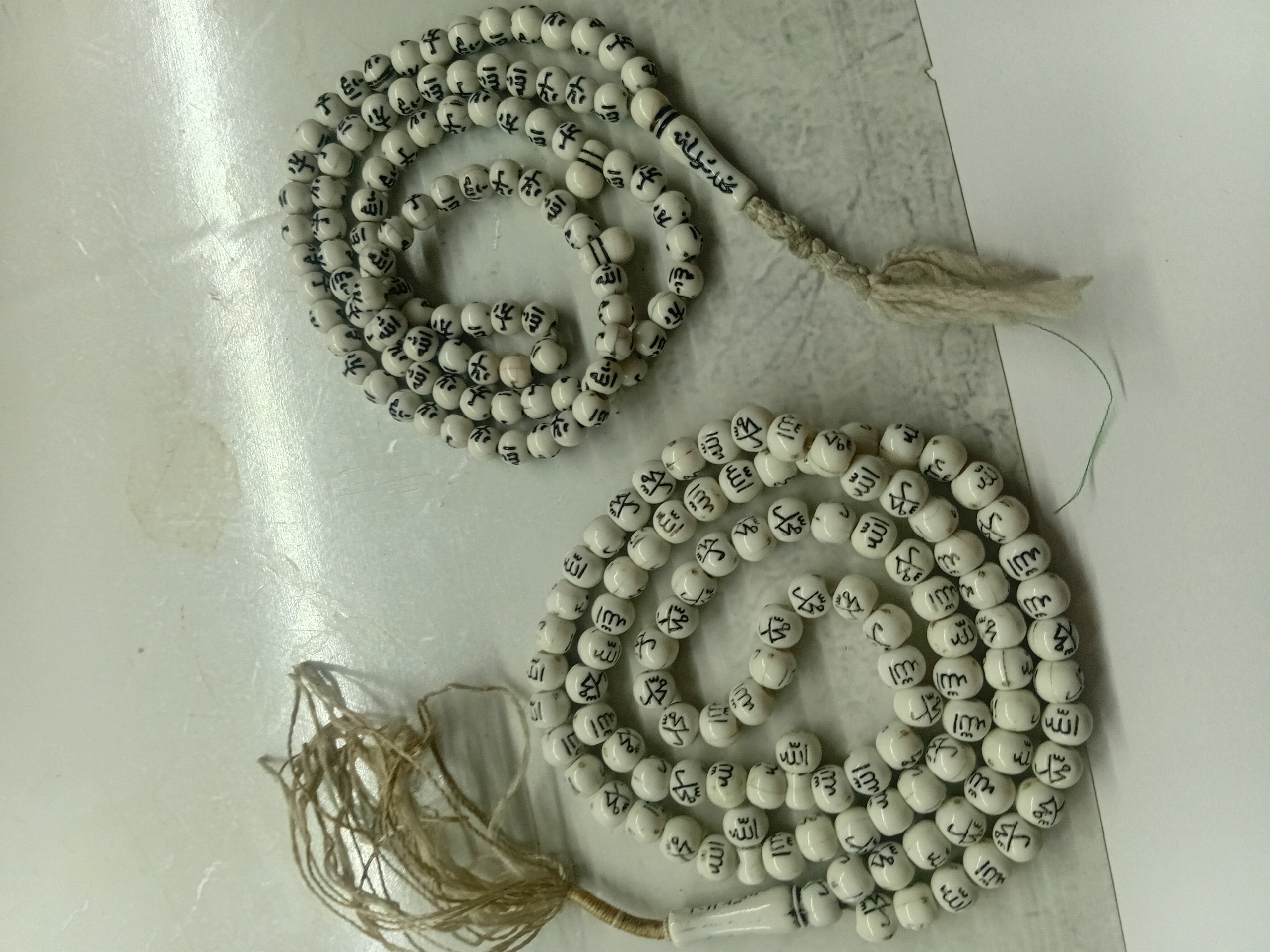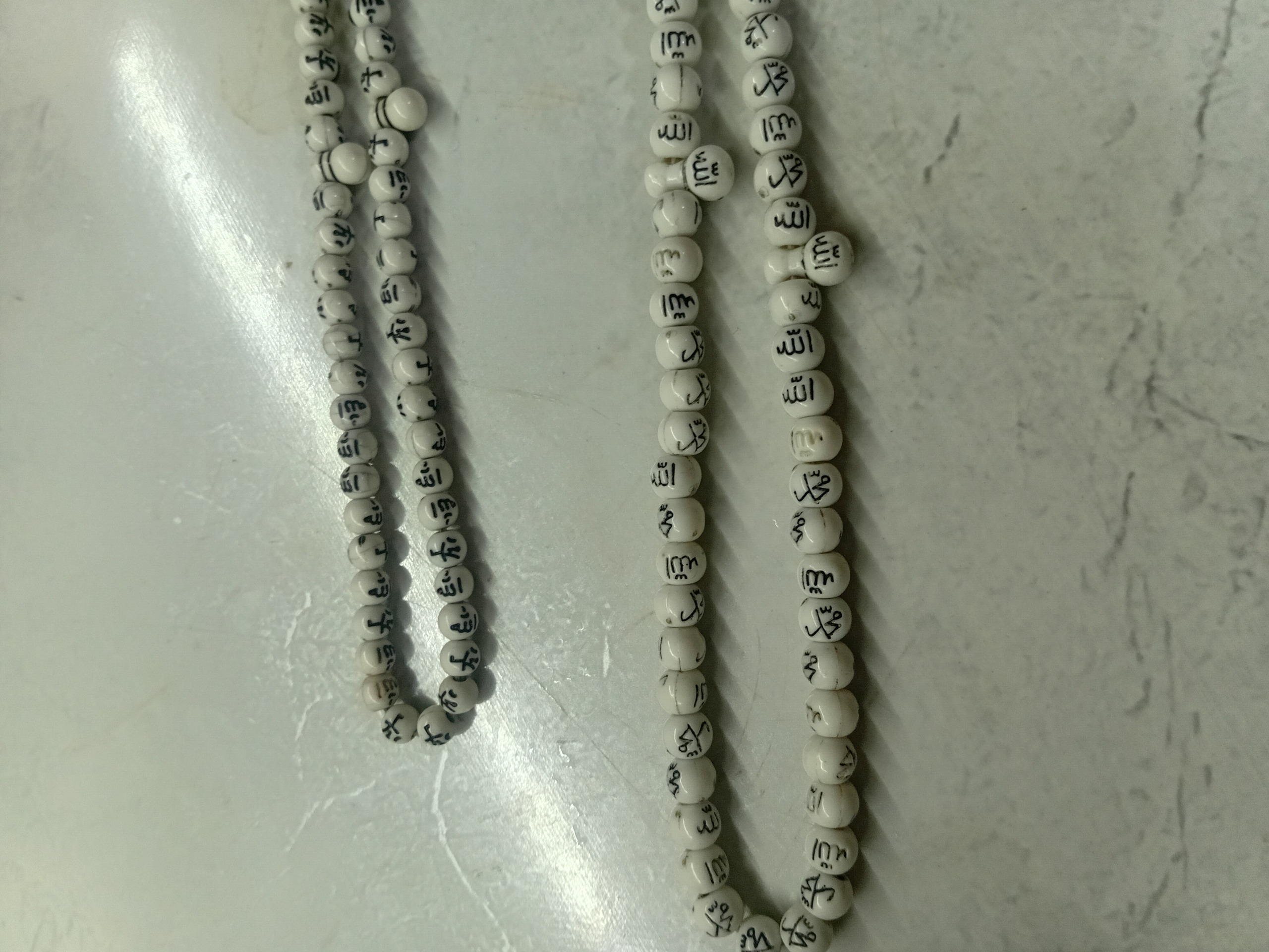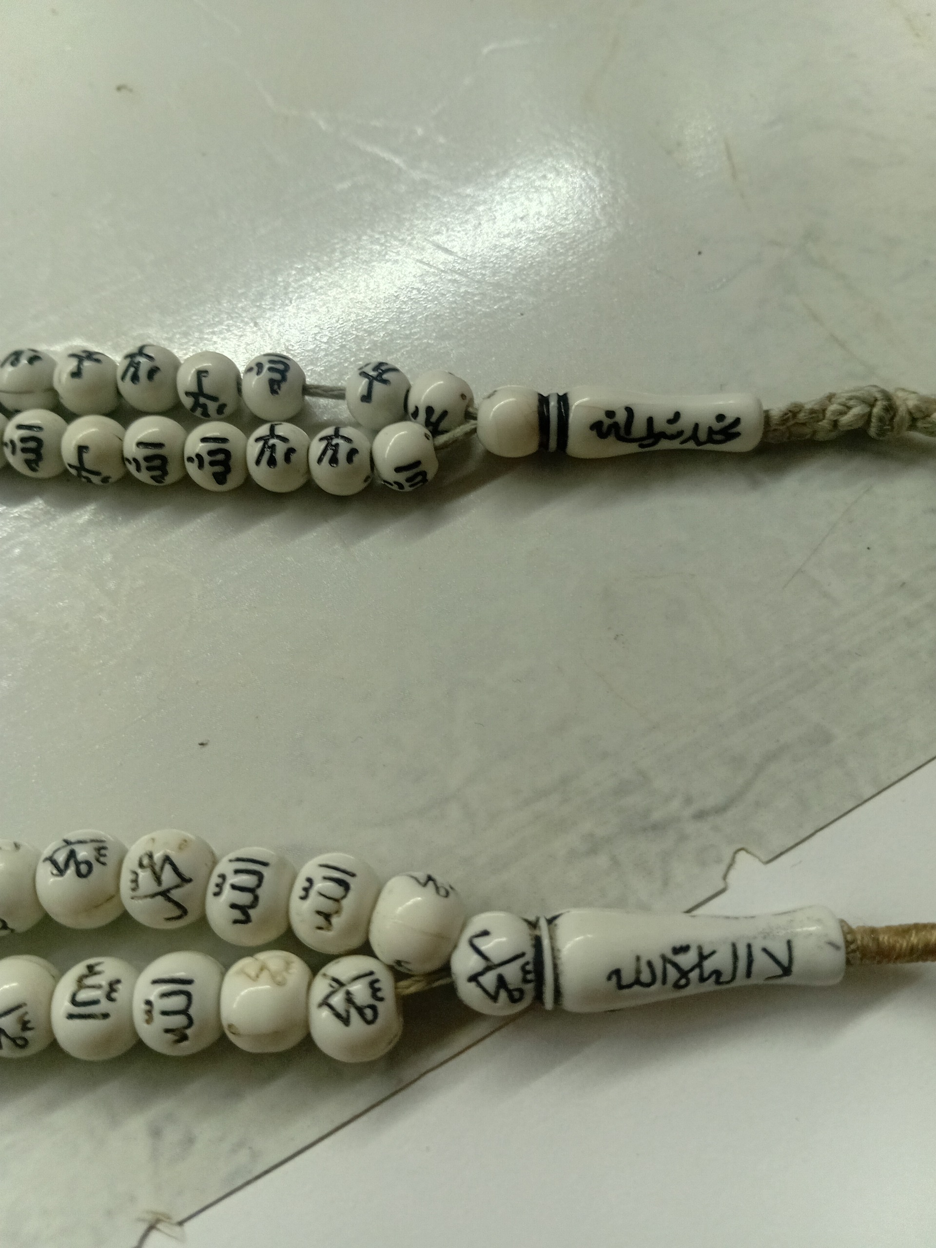 "الله"و "محمد" که هر دانه تسبیح در دوطرفش نوشته شده.