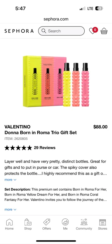 عطر از فروشگاه سفورا در کانادا خریداری شده یک عدد از پک سه عددی خارج از سایت فروش رفته 2عدد آن با نازلترین قیمت پیشنهادی این فروشگاه آگهی گردید،کیفیت فوق العادت عالی،در صورتی که همراه با روغن بدون بو(وازلین) روی بدن پاف گردد ساعتها ماندگاری و خط بو دارد،قیمت در سایت آمازون 90 دلار برای 3عدد