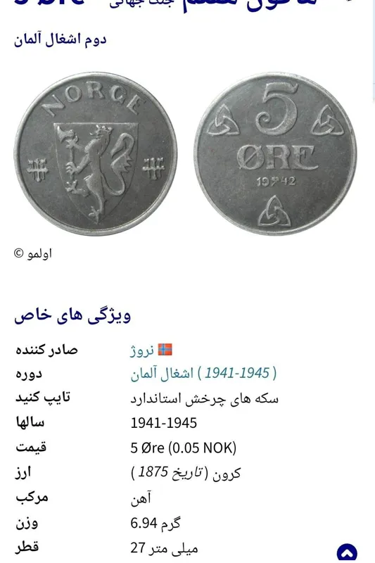 سکه کمیاب 5 اور نروژ اشغال آلمان نازی جنگ دوم