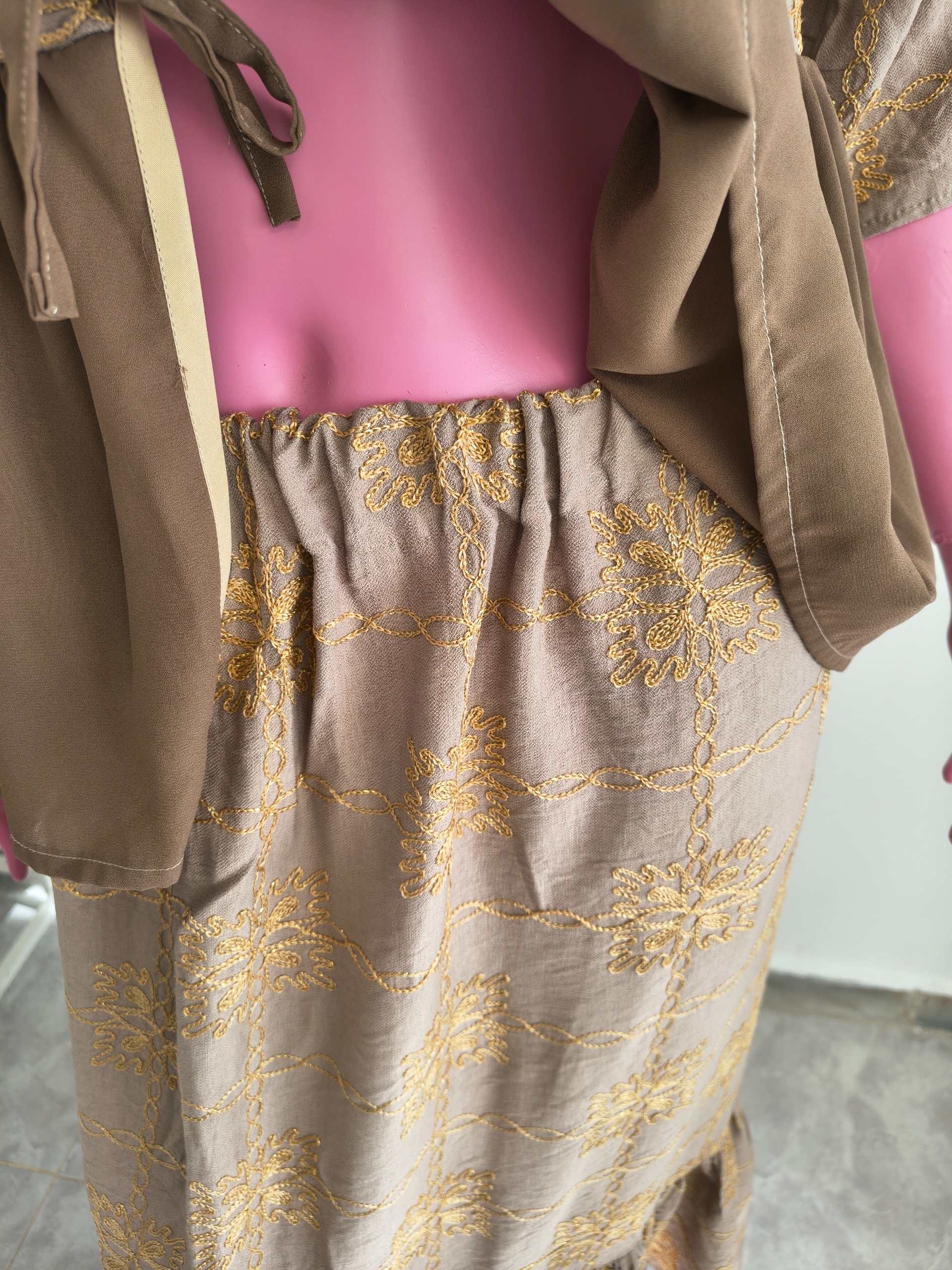 کت در قسمت جلو با سه جفت بندیلک بسته میشود. جنس کت، ترکیبی خامه دوزی و کرپ است.
