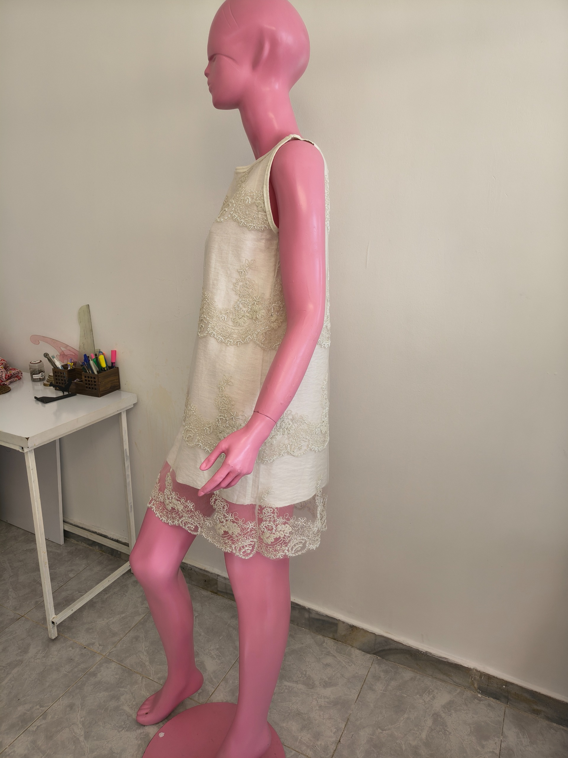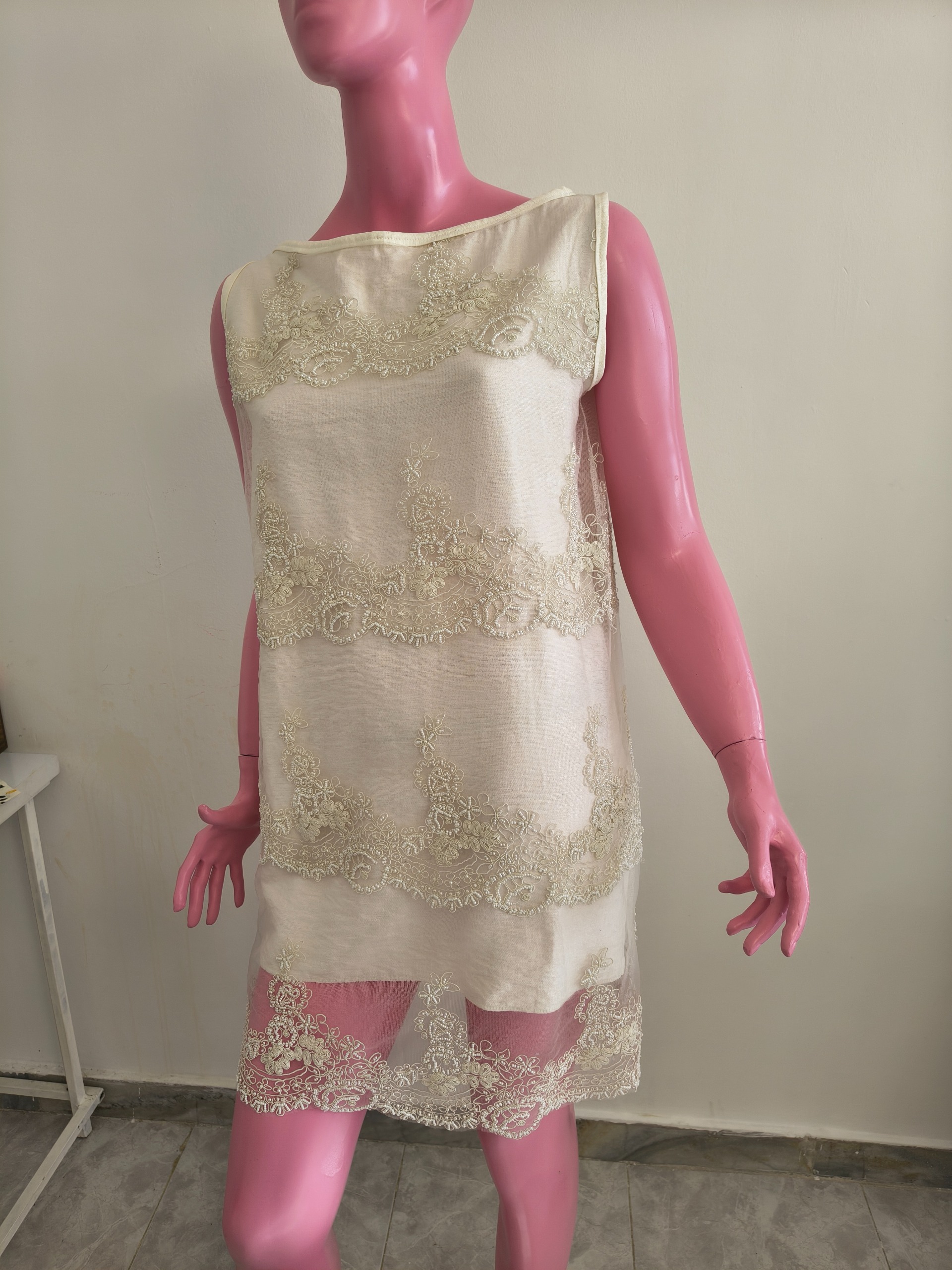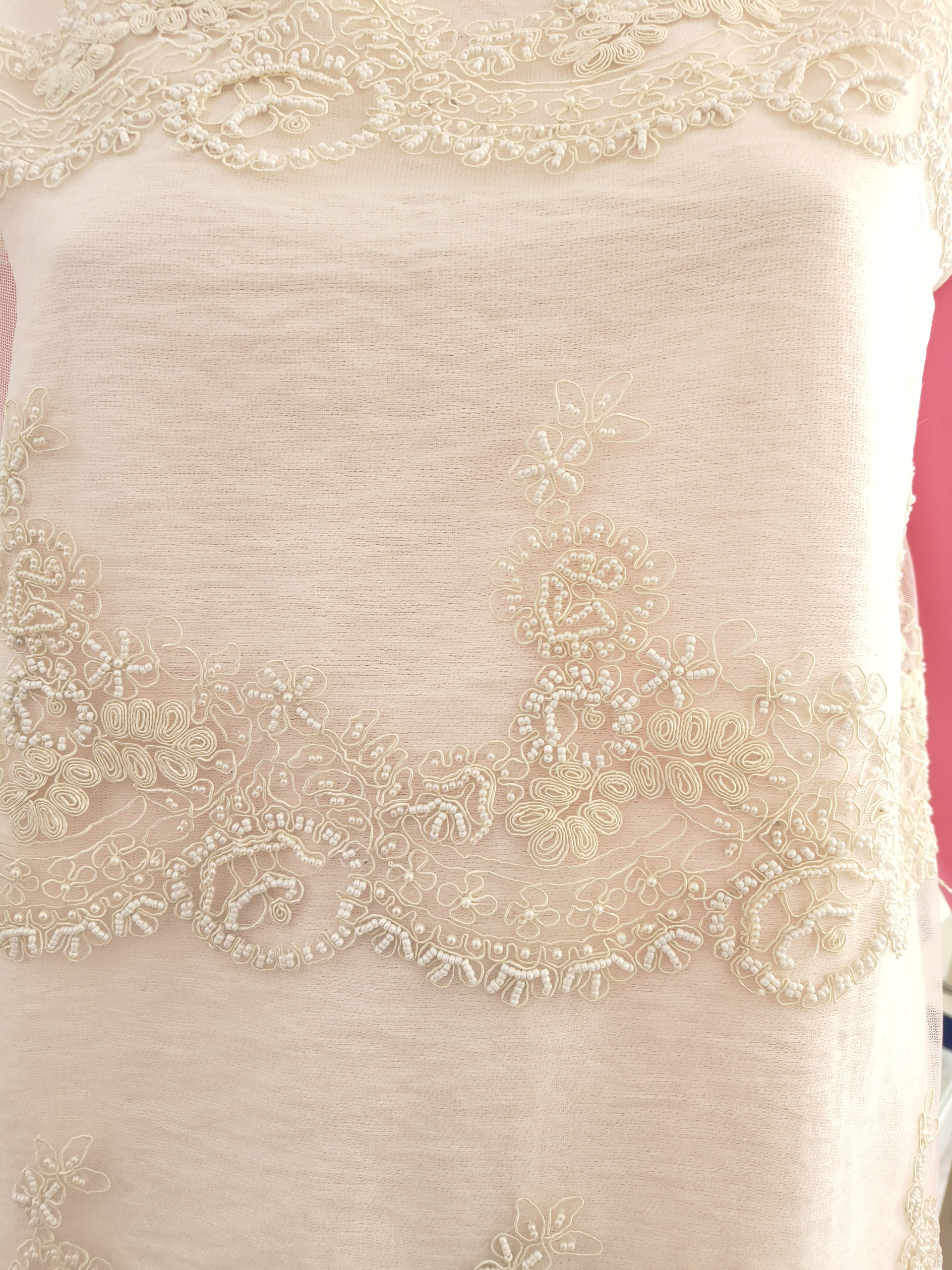 جنس پارچه رویی دانتل فرانسه خامه دوزی و منجوق دوزی است، پارچه ریزی (آستر) لینن لمه دار است