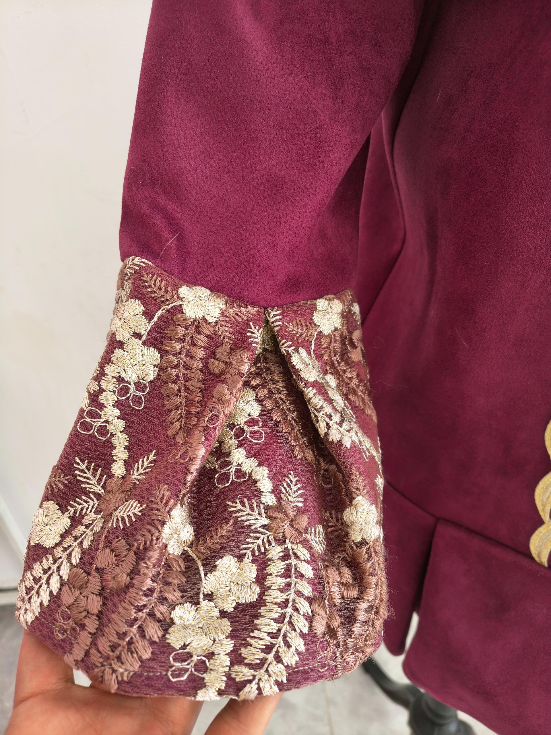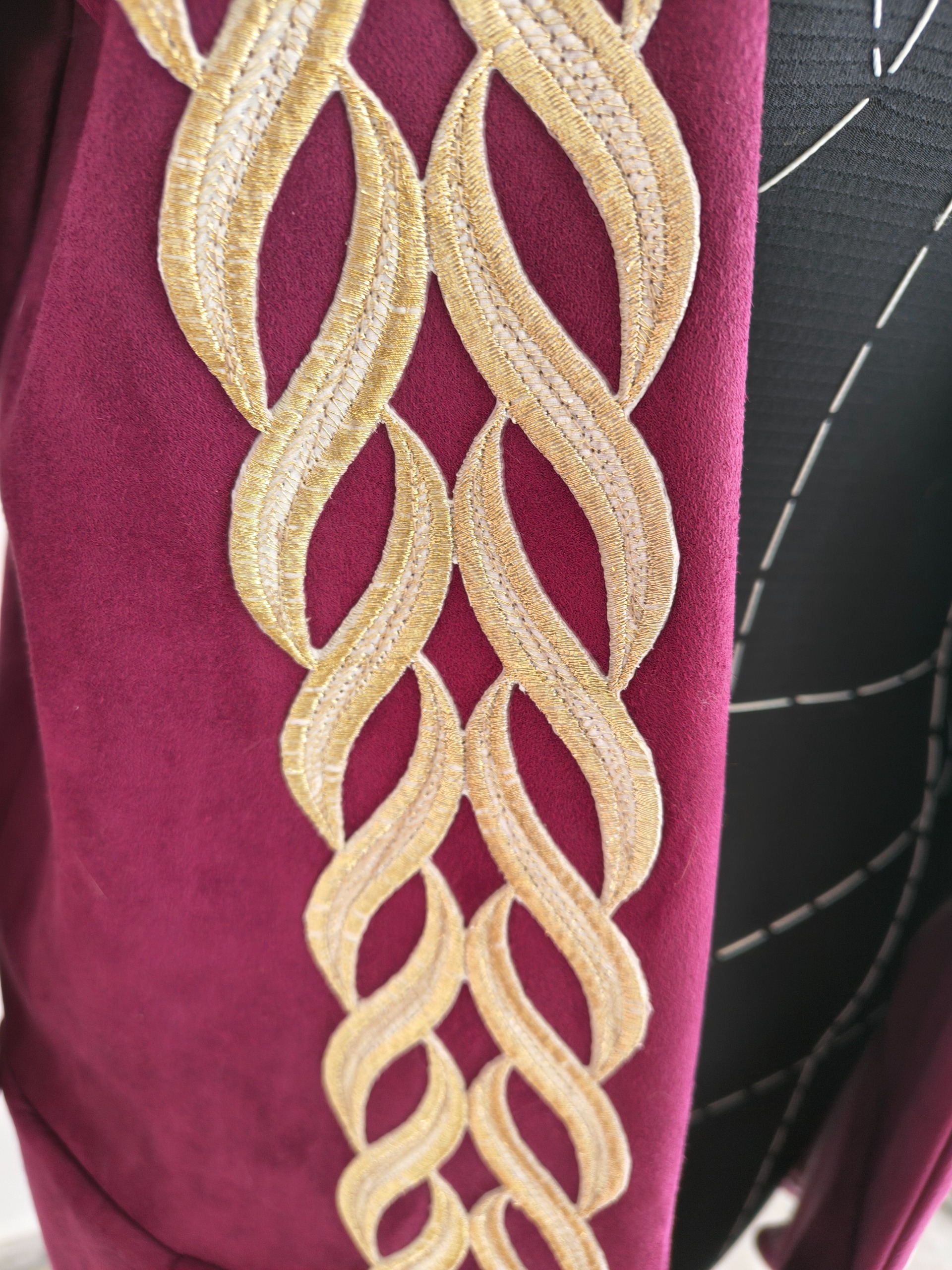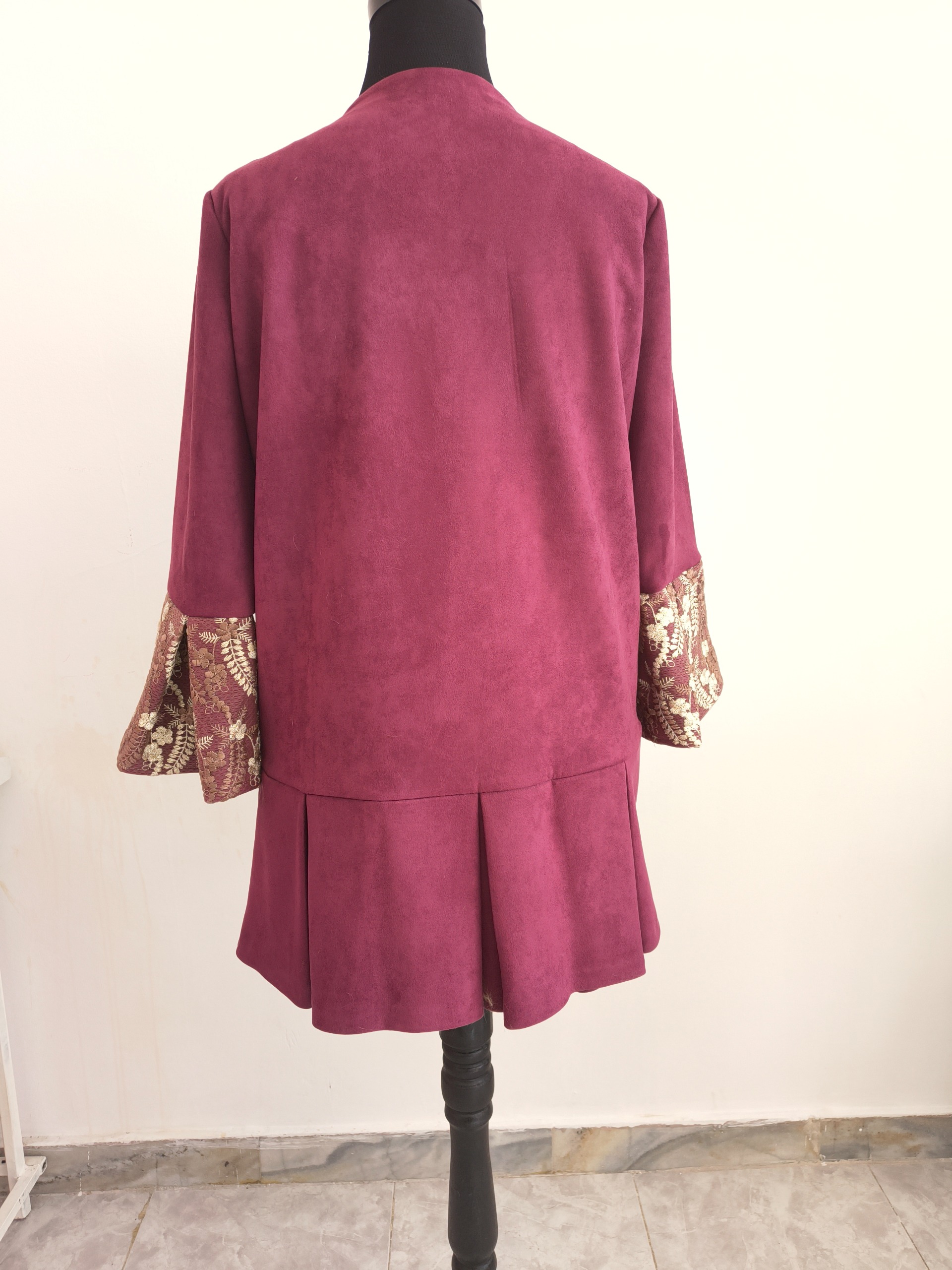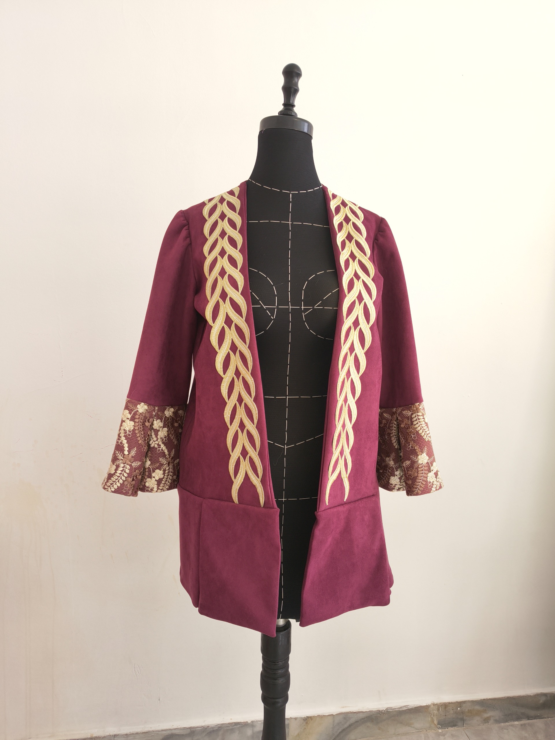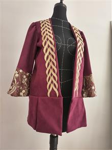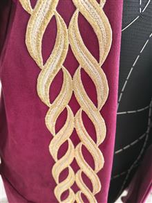 در قسمت جلو نوار کار شده و در سرآستینها از دانتل فرانسه استفاده شده