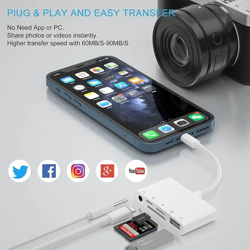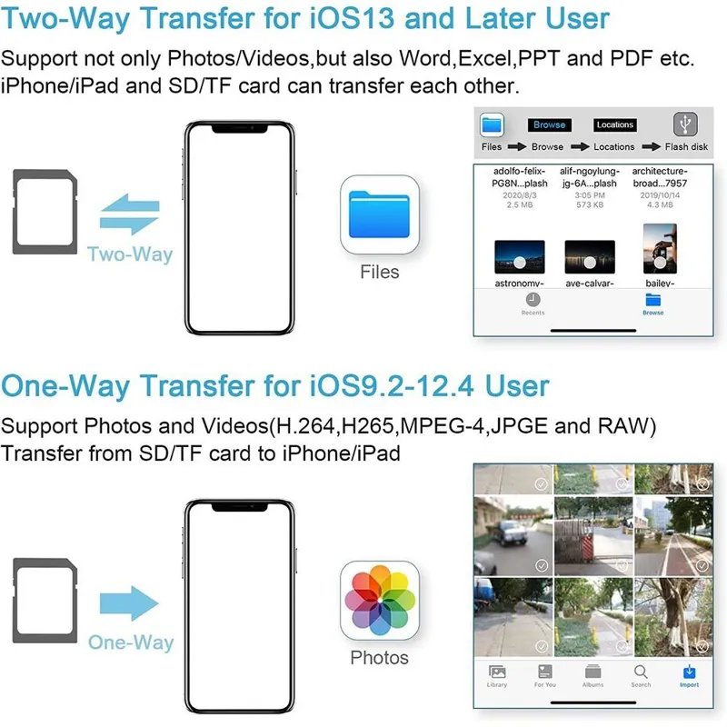 کارت SD/TF می تواند فیلم ها و عکس ها را از دوربین یا کارت حافظه به آیفون / آی پد شما با سرعت 14 مگابایت تا 16 مگابایت بر ثانیه منتقل کند و تا 512 گیگابایت کارت SD/TF را پشتیبانی می کند