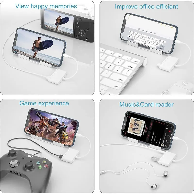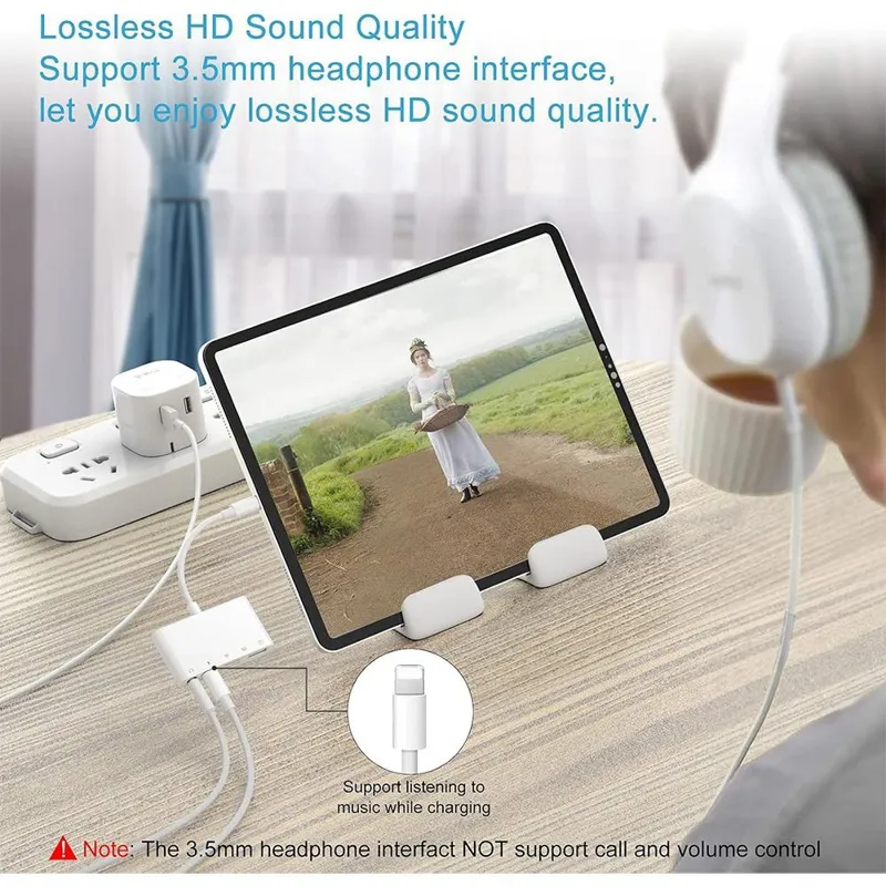این آداپتور کارت دوربین USB صوتی 5 در 1 Lighting از رابط تلفن در یک خروجی صوتی 3.5 میلی متری پشتیبانی می کند و همزمان از شارژ و استفاده از آهنگ پشتیبانی می کند