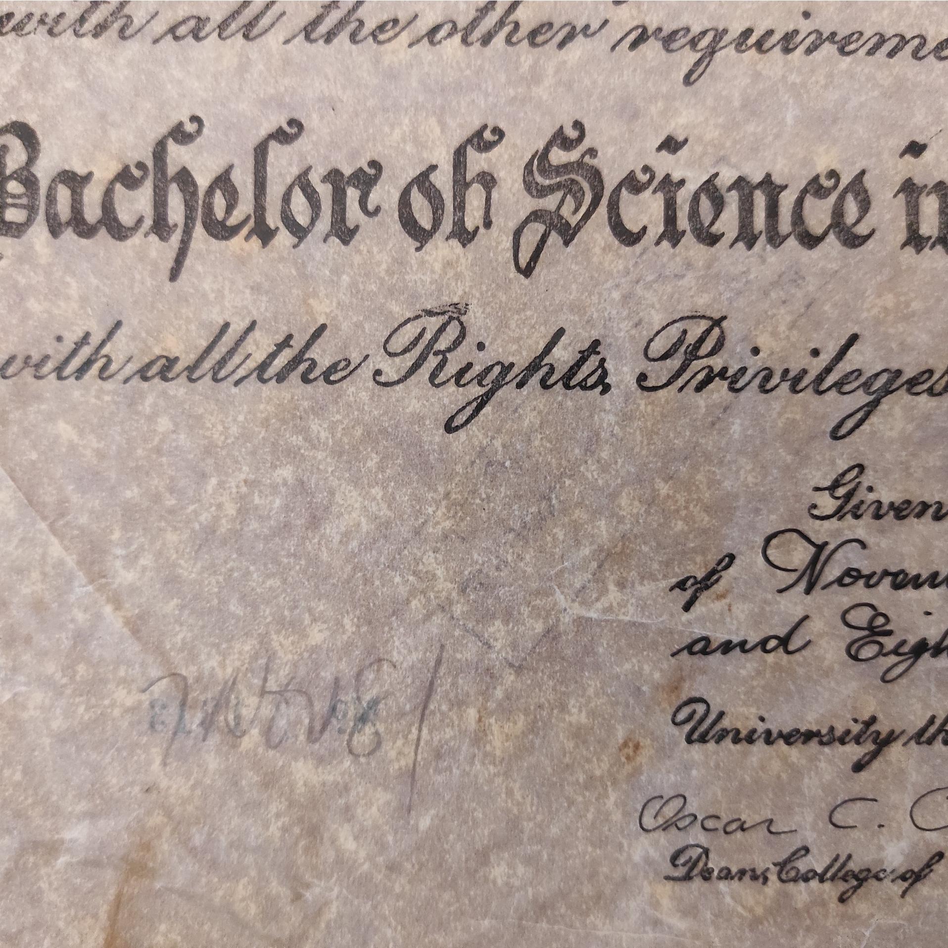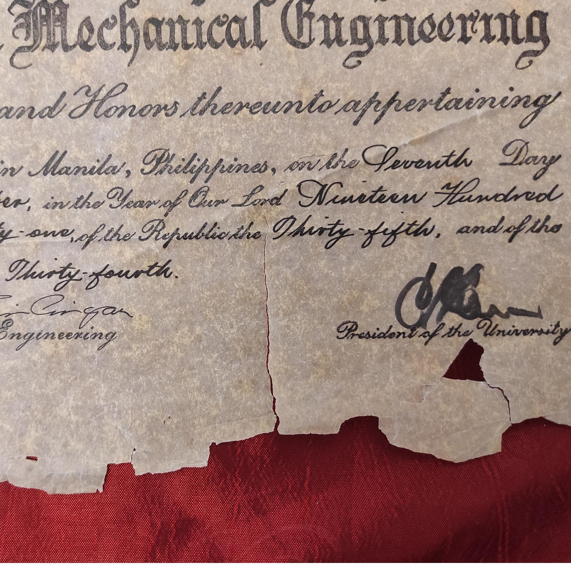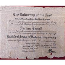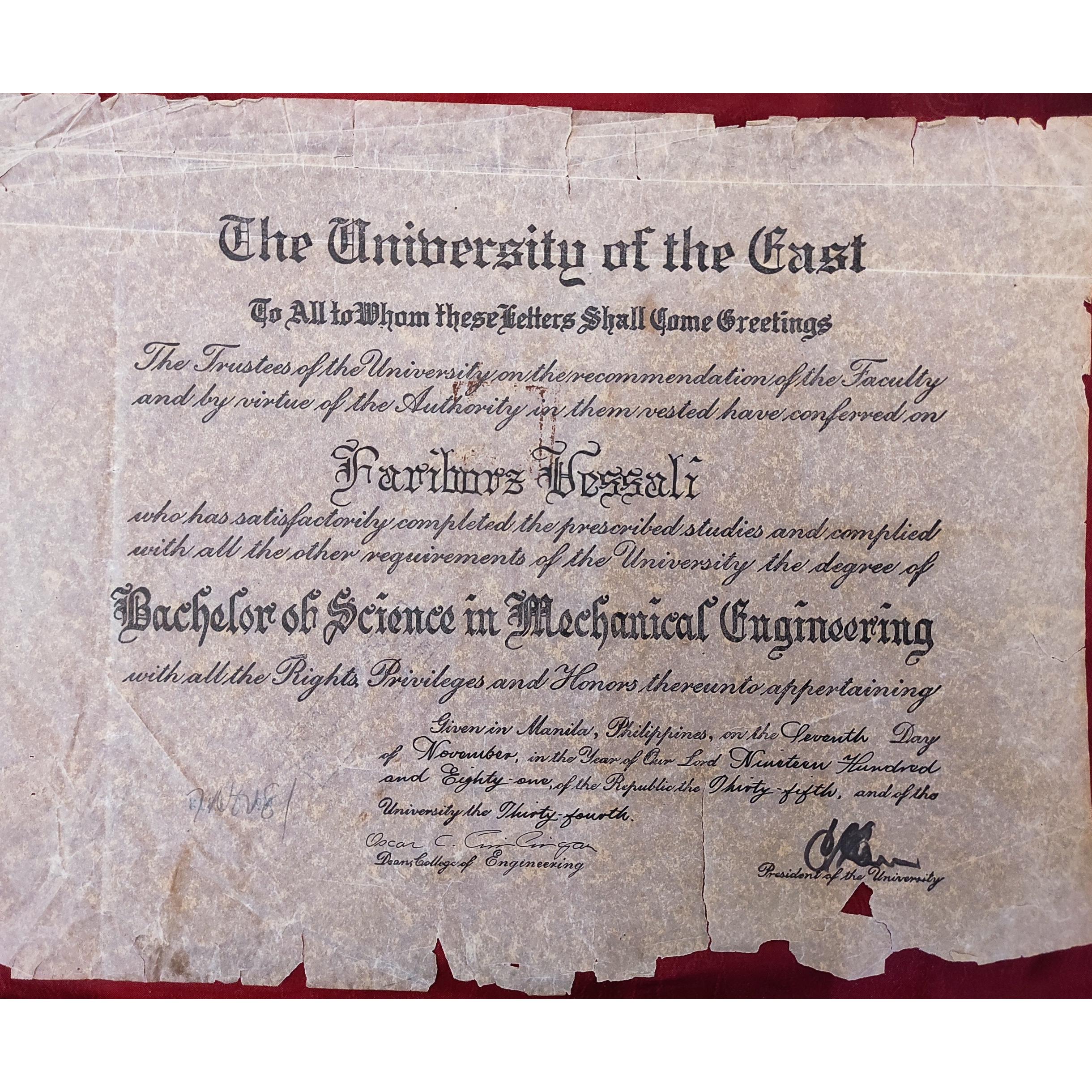 مدرک لیسانس علوم در مهندسی مکانیک از دانشگاه با تمام حقوق و امتیازات مربوط با امضای رییس دانشگاه (دانشگاه شرق_فیلیپبن) مربوط به سال 1981