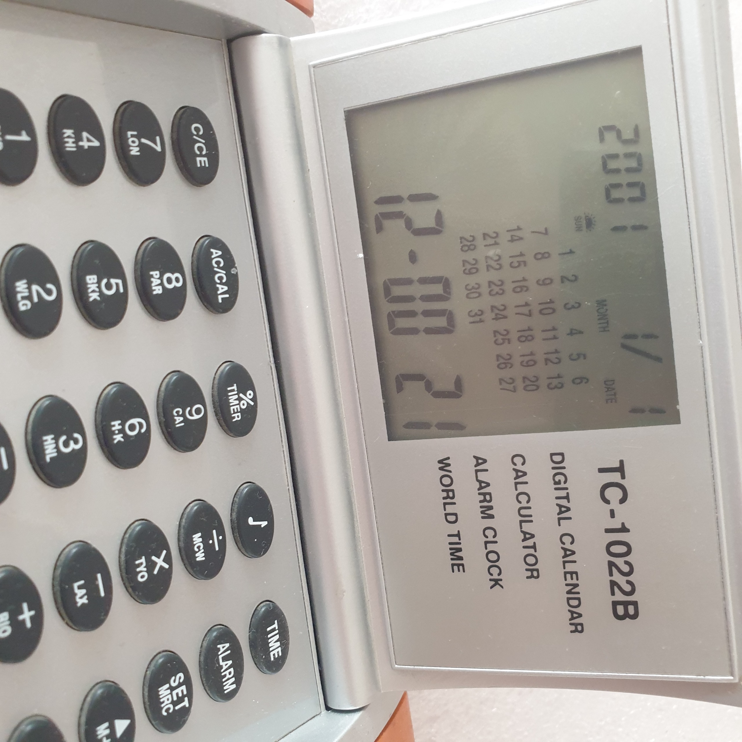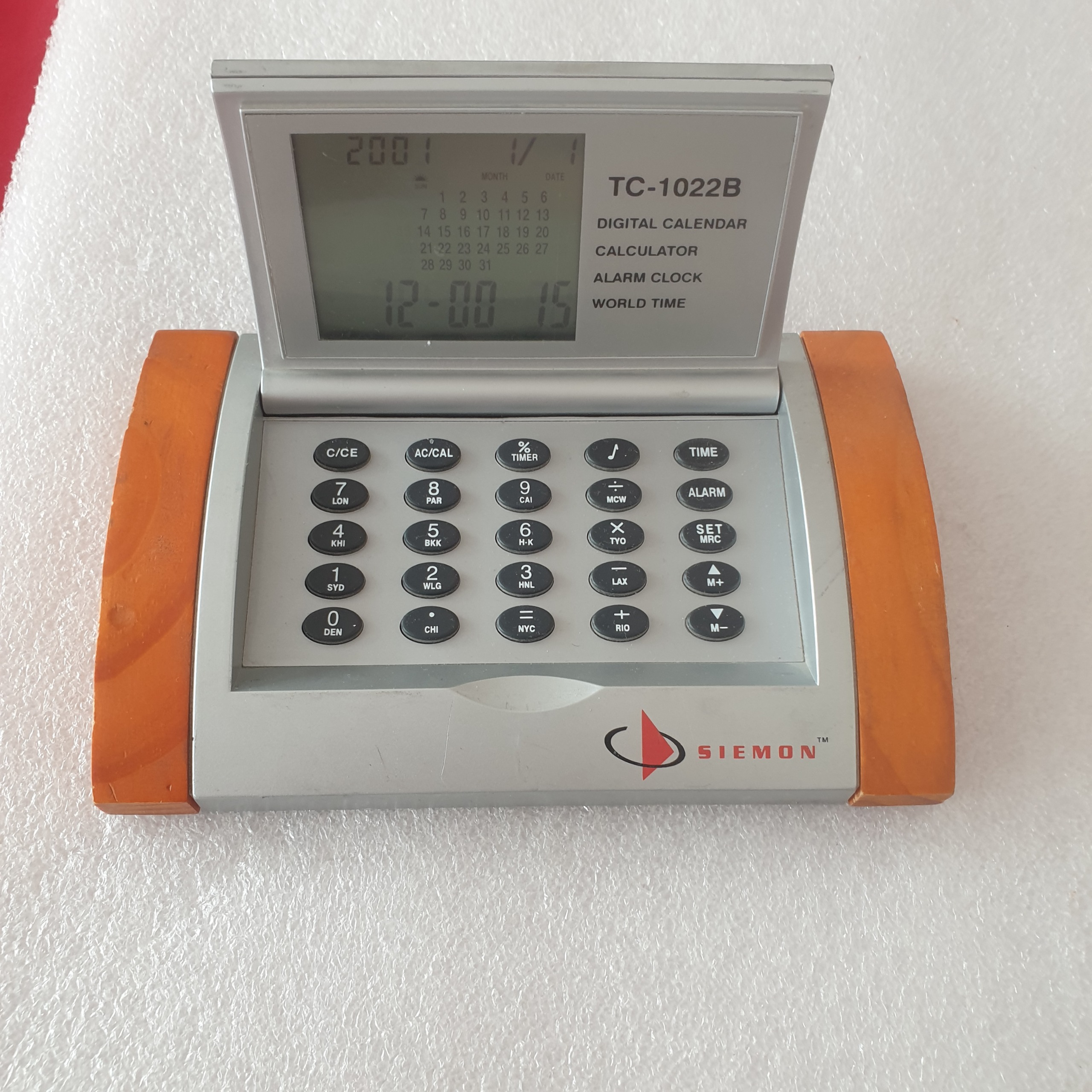 ماشین حساب siemon مدل TC-1022B ساعت دار آلارم دار و ساعت جهانی بغل ها چوبی فقط کیفیا مطابق تصاویر درب باتری ندارد و یک باتری سکه ای می خوره