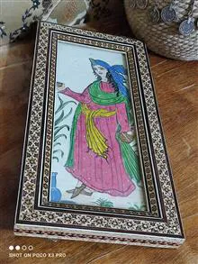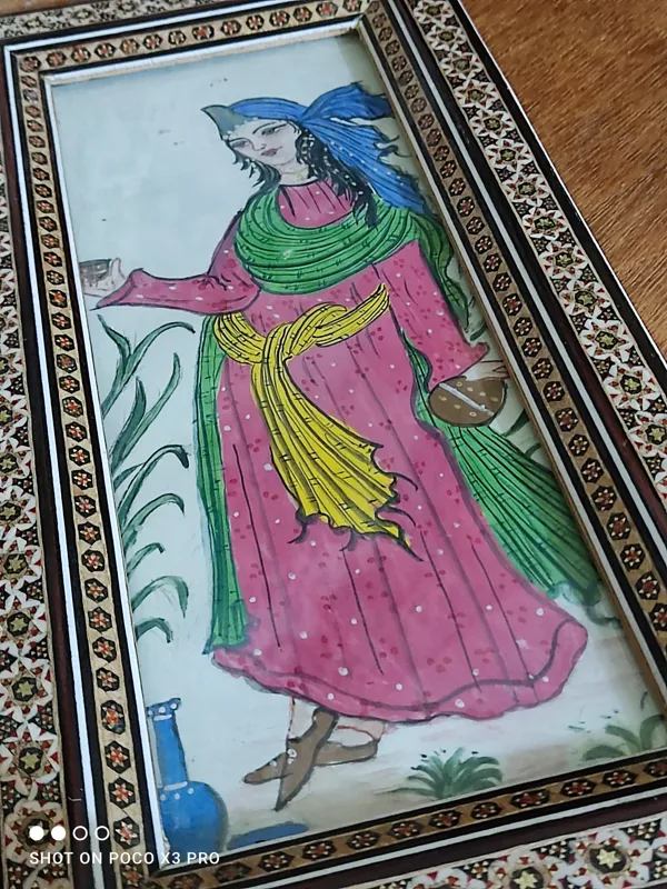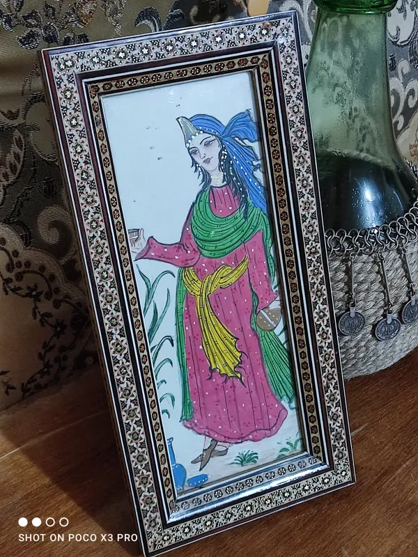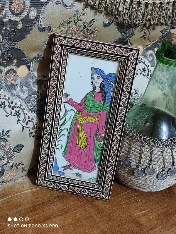 یک عدد قاب عکس قدیمی خاتمکاری شده خاتم شیراز نو نو مونده این قاب خاتم یکار واقعا کمیاب و زیباییه نقاشه داخل قاب از صفر تا صد هنر دسته خود قاب کاملا دستسازه قطعه قطعه با دست کنار هم گذاشتن که شده این قاب تقریبا 30 سانتی ارتفاع داره عرضشم تقریبا 15 سانته بدون عیب یه شاهکار هنری هم عکس هم قاب