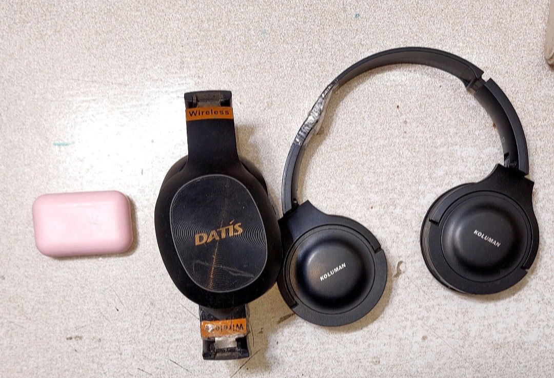 یک عدد هدفون مدل داتیس این هدفون روشن نمیشه ولی وقتی به شارژ میزنی چراغ قرمز روشن میشه شکستگی هم داره که داخل عکس ها مشخص کردهام و دور شکستگی ها خط آبی کشیدم