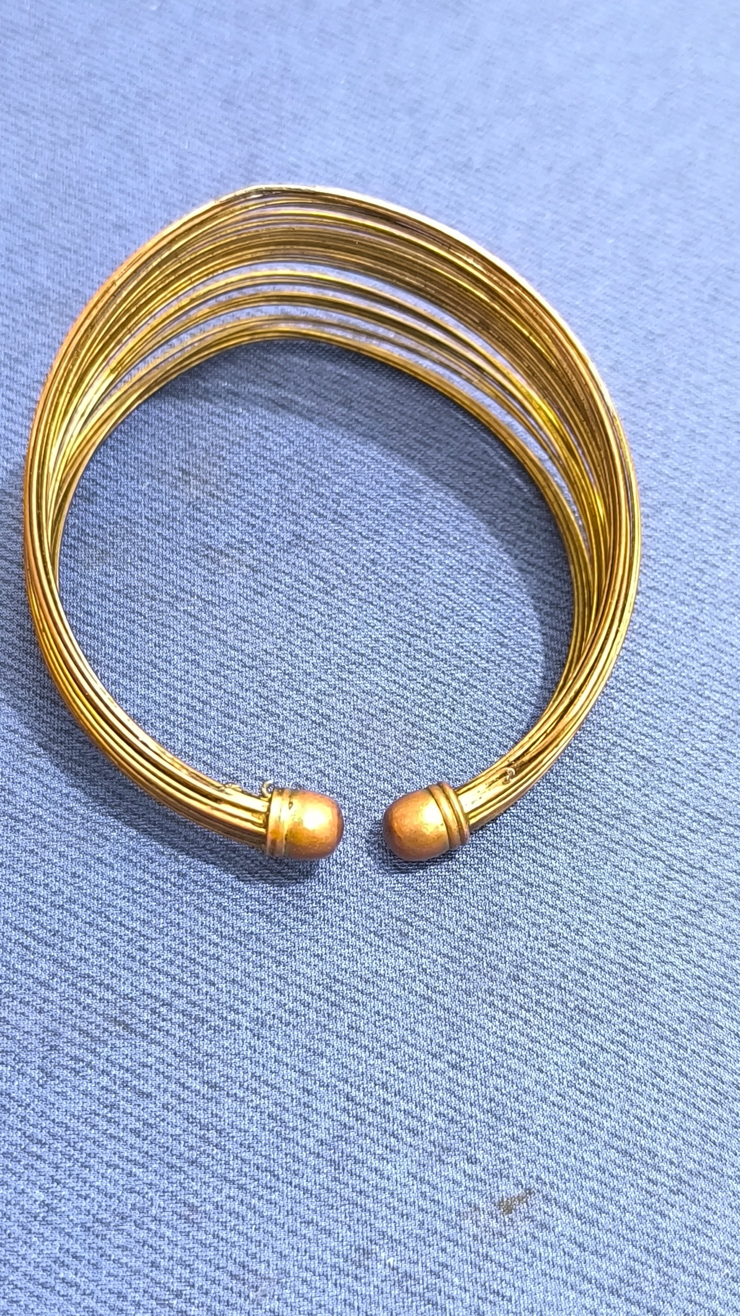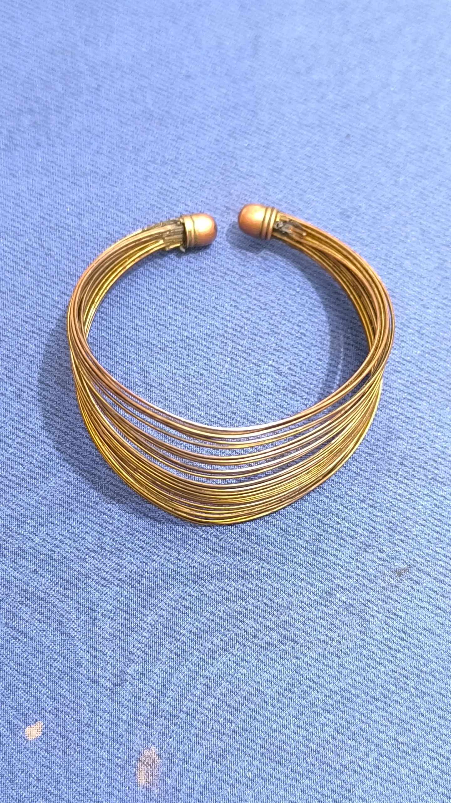 دستبند زنانه قجری قدیمی جنسش از مس مفرق برنج قاطی هست اون موقع زن ها این جور زیورآلات رو دست میکردن دیگه حقیقت خودتون نگاه کنید کارشناسی کنید حوصله ندارم بخرید ببرید بگید بهمون انداختی فلان بیسار من کارشناس باستان شناسی نیستم وقتی از کسی چیزی میخرم به قسم ایه طرف که واقعی هست حقیقت داره فلان میخرم خودم نمیسازم که بدونم چی هست و نیست ماشاالله مردم همیشه در صحنه این جور مواقع براشون جنس رو هم بفرستی میگن آشغالها ولی خودشون اشغال داشته باشن اون طلا هست آشغال نیست که