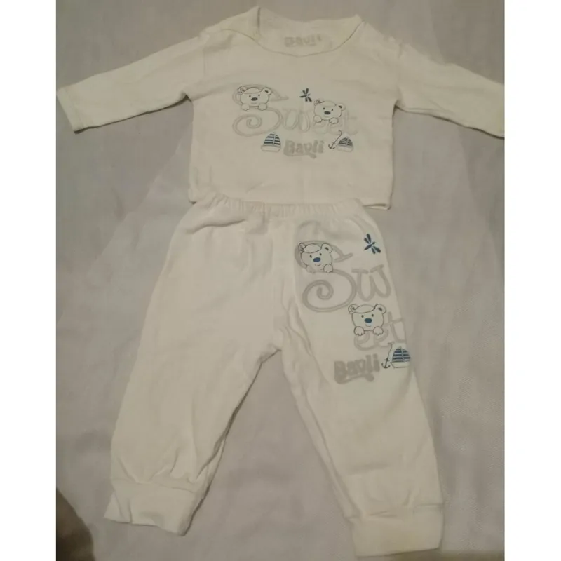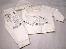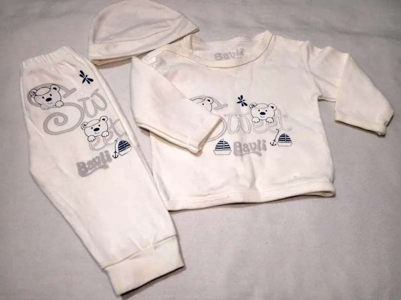 ست بلوز و شلوار و کلاه جنس نرم و لطیف خامه ای رنگ سفید مارک sweet Bavli قد شلوار 30 سانت و قد پیراهن 24 سانت و اندازه سرشانه لباس 20 سانت  با پارچه درجه یک