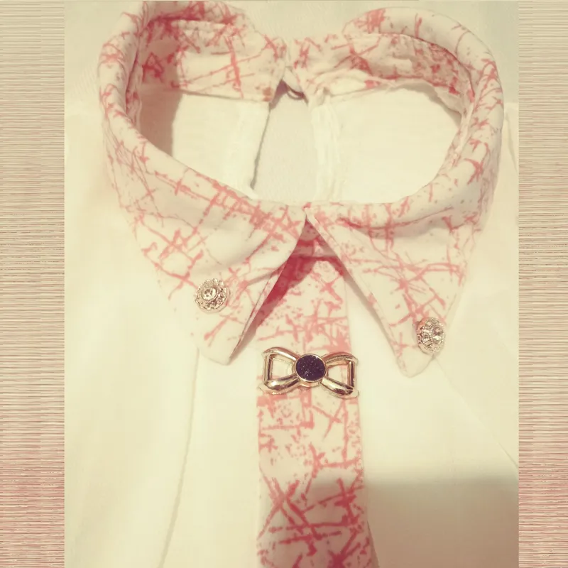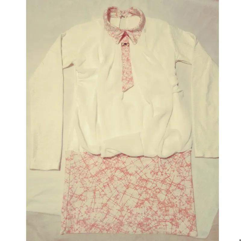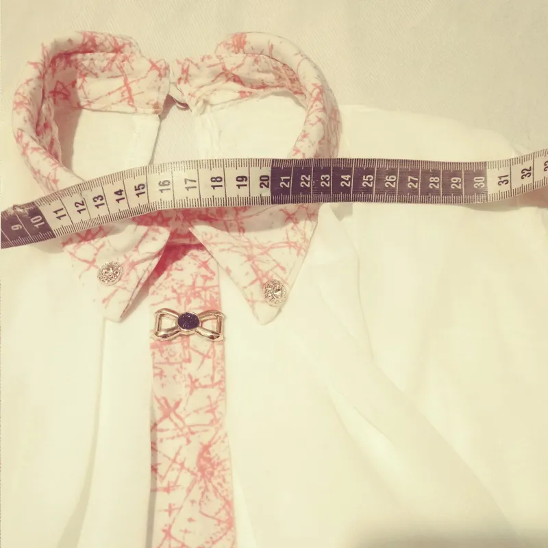 اندازه عرض شانه 33 سانت و اندازه قد پیراهن 73 هست که 50 سانت برای پیراهن و 23 سانت به عنوان دامن است..با دکمه ها و پاپیون زیبا و کروات خوشرنگ با طرح پارچه حریر دولایه جلوی لباس