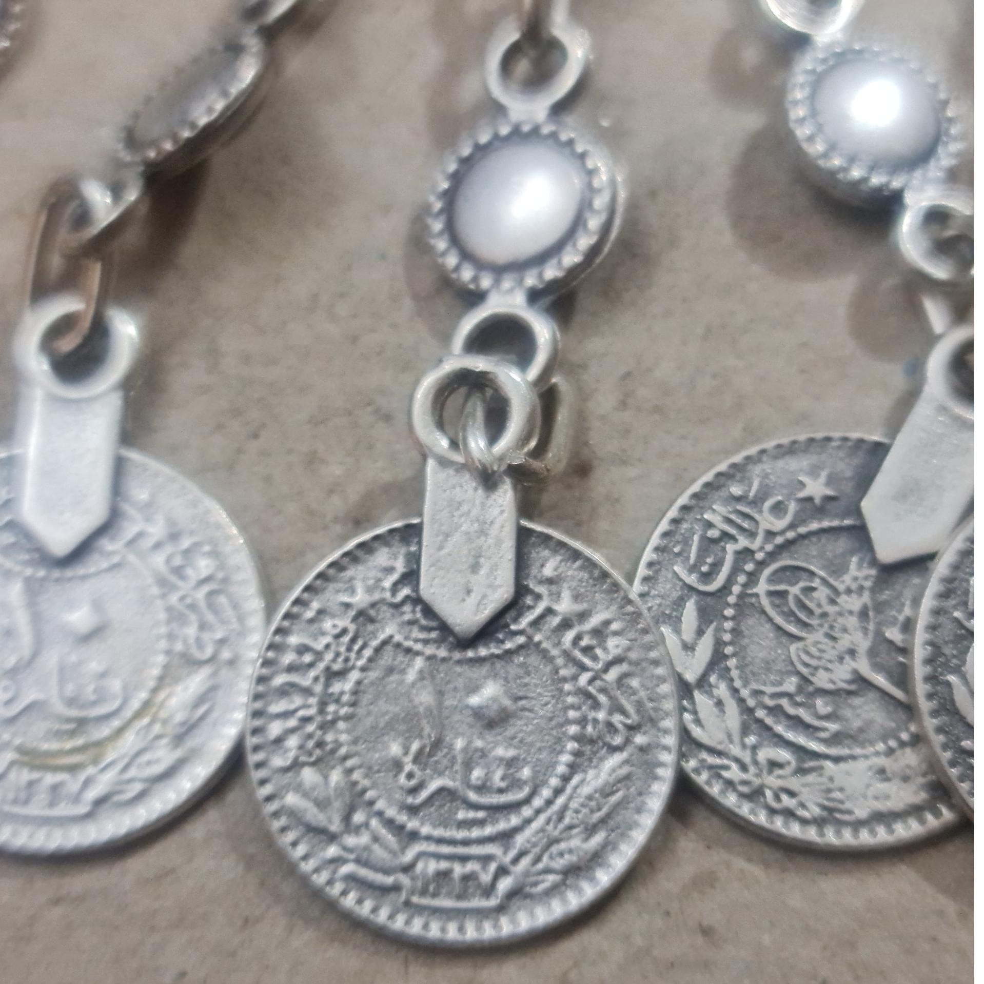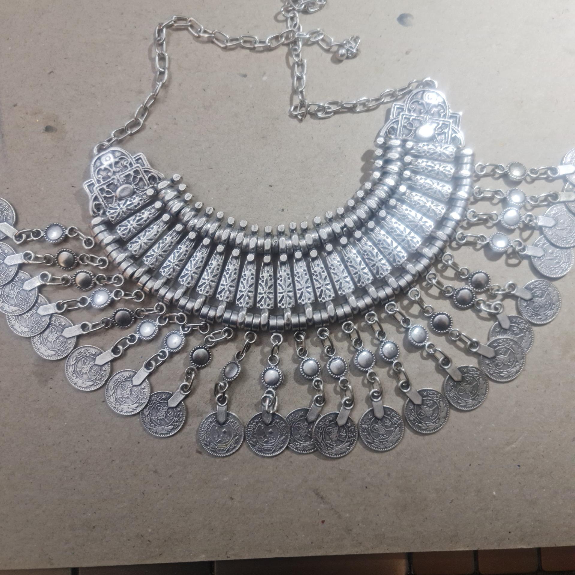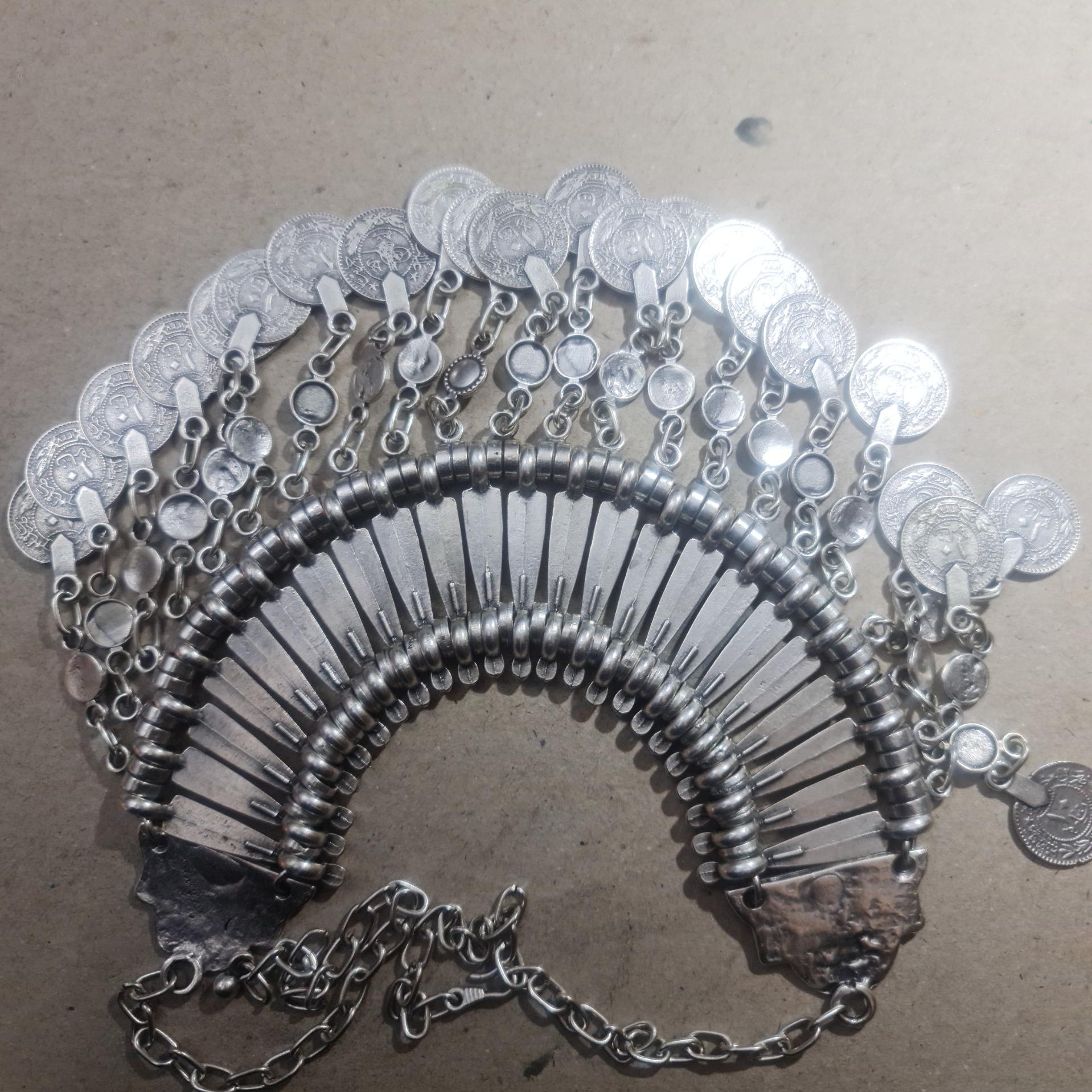 یک قطعه گردن آویز قدیمی 1327 دست ساز وزن حدود 600 گرم جنس ورشو  روکش کروم زنجیر نقره عیار پائین  در تصاویر همه زوایای آن مشخص است