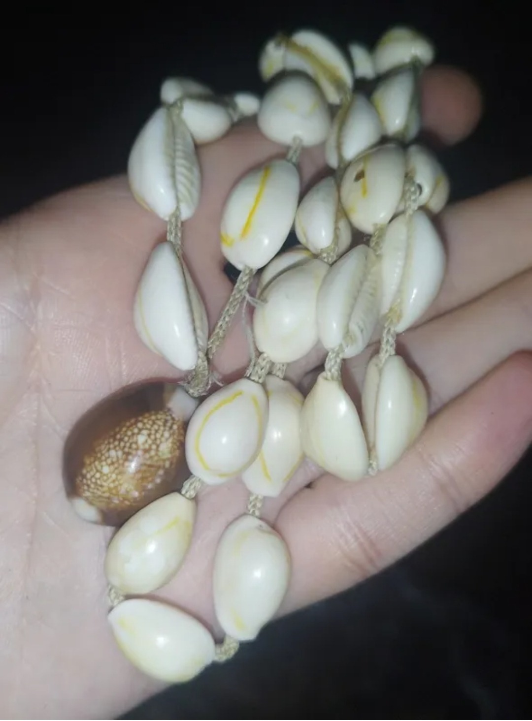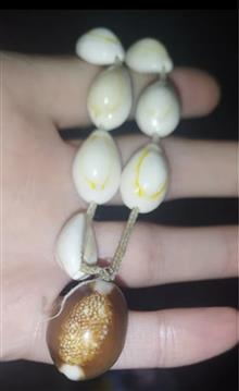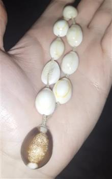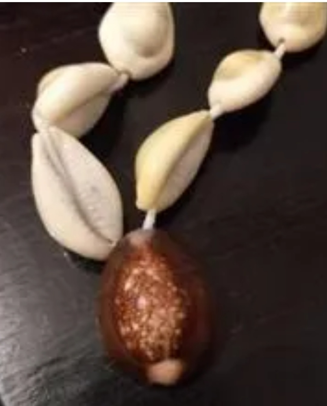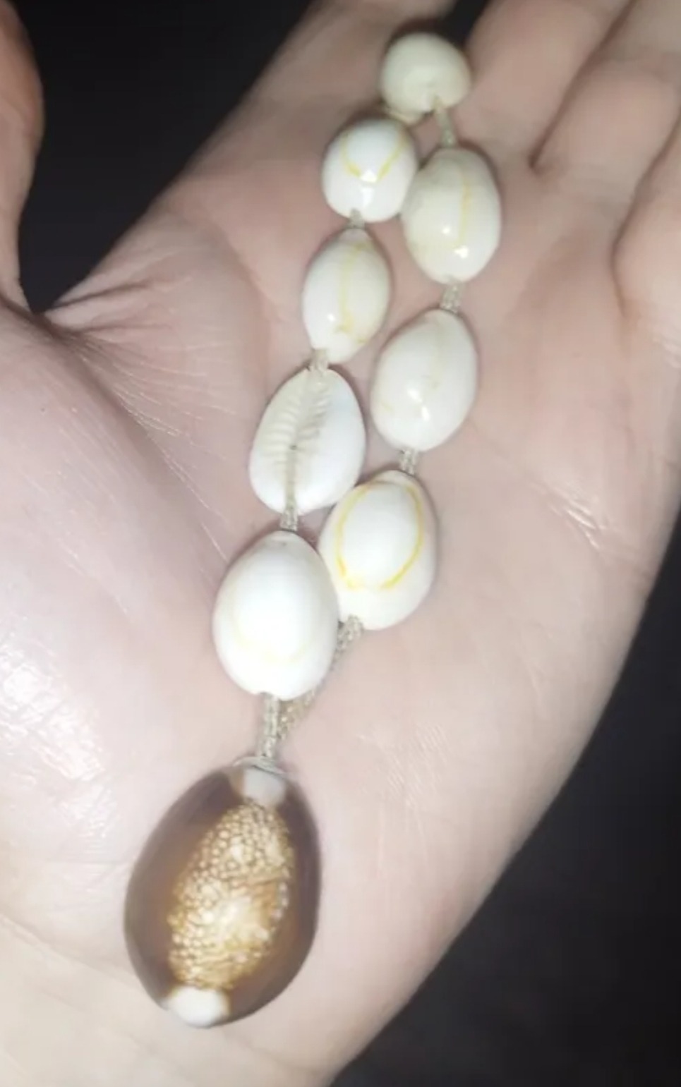 این گردنبند یک صدف قهوه ای رنگ تیره وسطش به قول کسایی که داشتد میگن دعا داخلش هست دقیق اطلاع ندارم چون گردنبند نو هستش