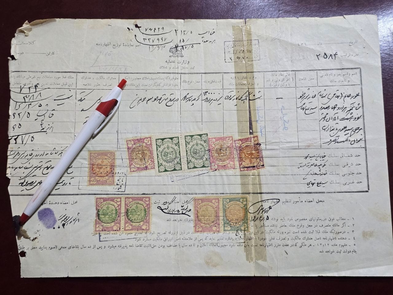 اظهارنامه دوره رضاشاه با تمبرهای بسیار ارزشمند 3 تومان سبز وزارت مالیه