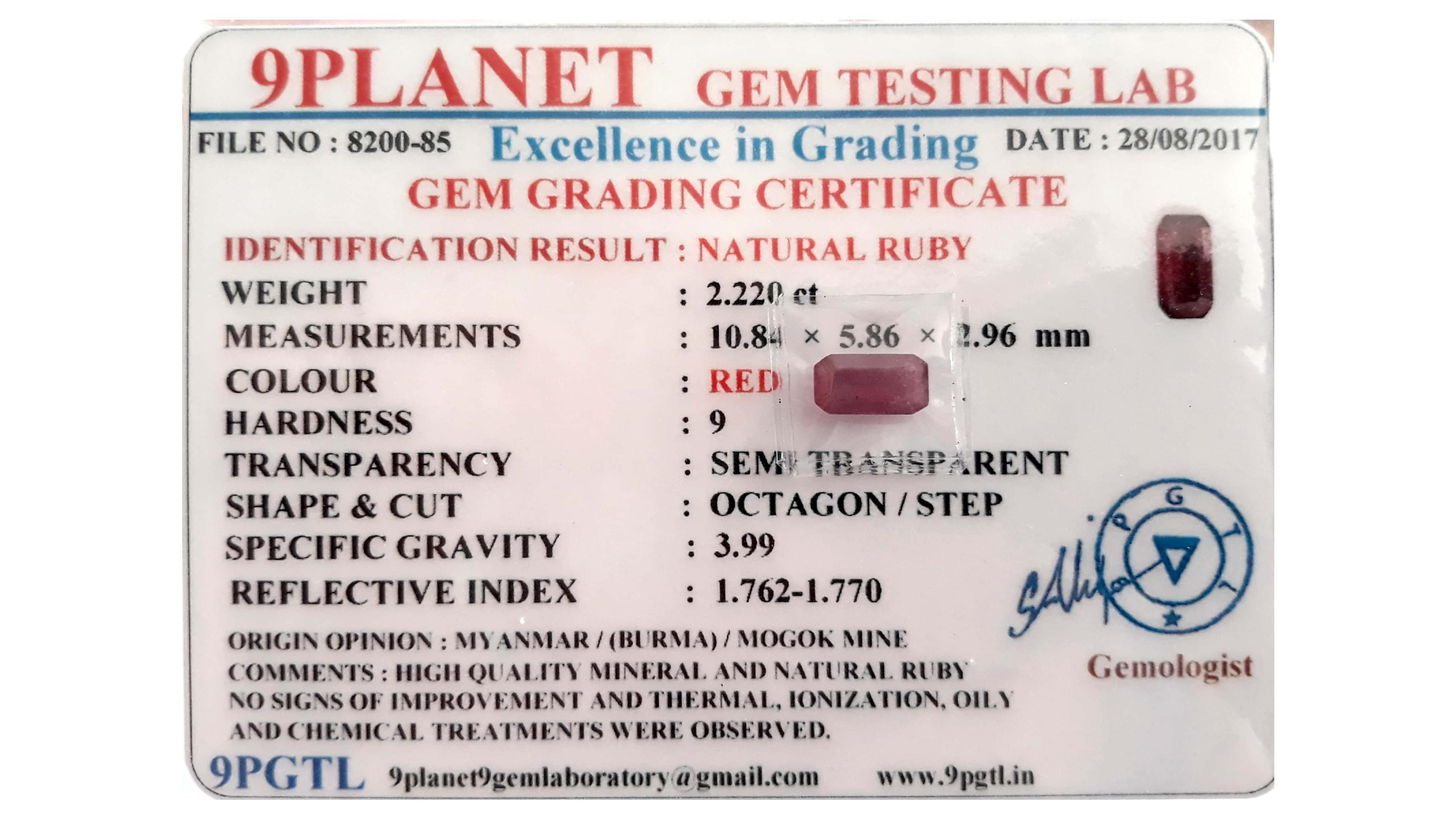 یاقوت برمه اصیل و بکر با شناسنامه بین المللی فوق تخصصی بسیار دقیق با ذکر ویژگیهای فوق تخصصی همچون رنگ ، وزن با دقت سه صفر ، ابعاد با دقت دو صفر ، شفافیت ، نوع برش و تراش ، وزن مخصوص ، سختی ، ضریب شکست نور ، با ذکر دقیق خاستگاه سنگ و نام کشور و معدن جواهر و توضیح کامل در مورد بررسی عدم هرگونه بهسازی حرارتی ، روغنی و شیمیایی و غیره !!!!