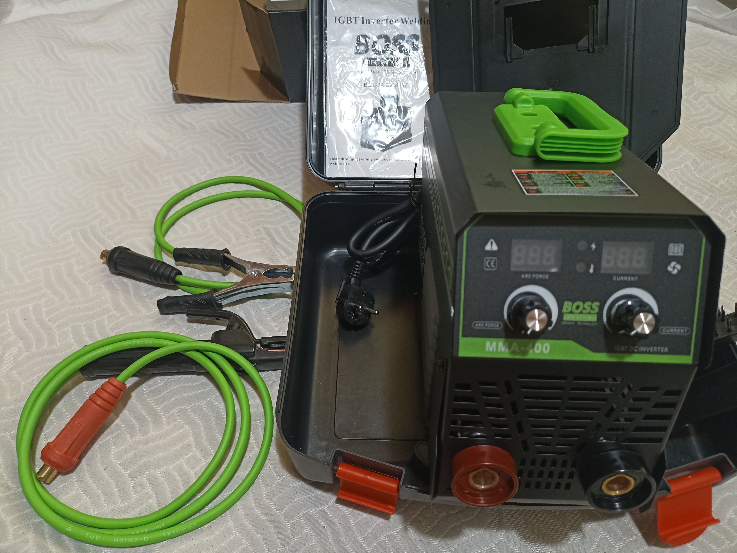 اینورتر 400 آمپر BOSS مناسب جوشکاری درب و پنجره و غیره توانایی ذوب الکترود 2 و 3 مقطعی و 4 خال جوش دارای کابل انبر جوش و اتصال ماسک و فرچه کیف درجه یک