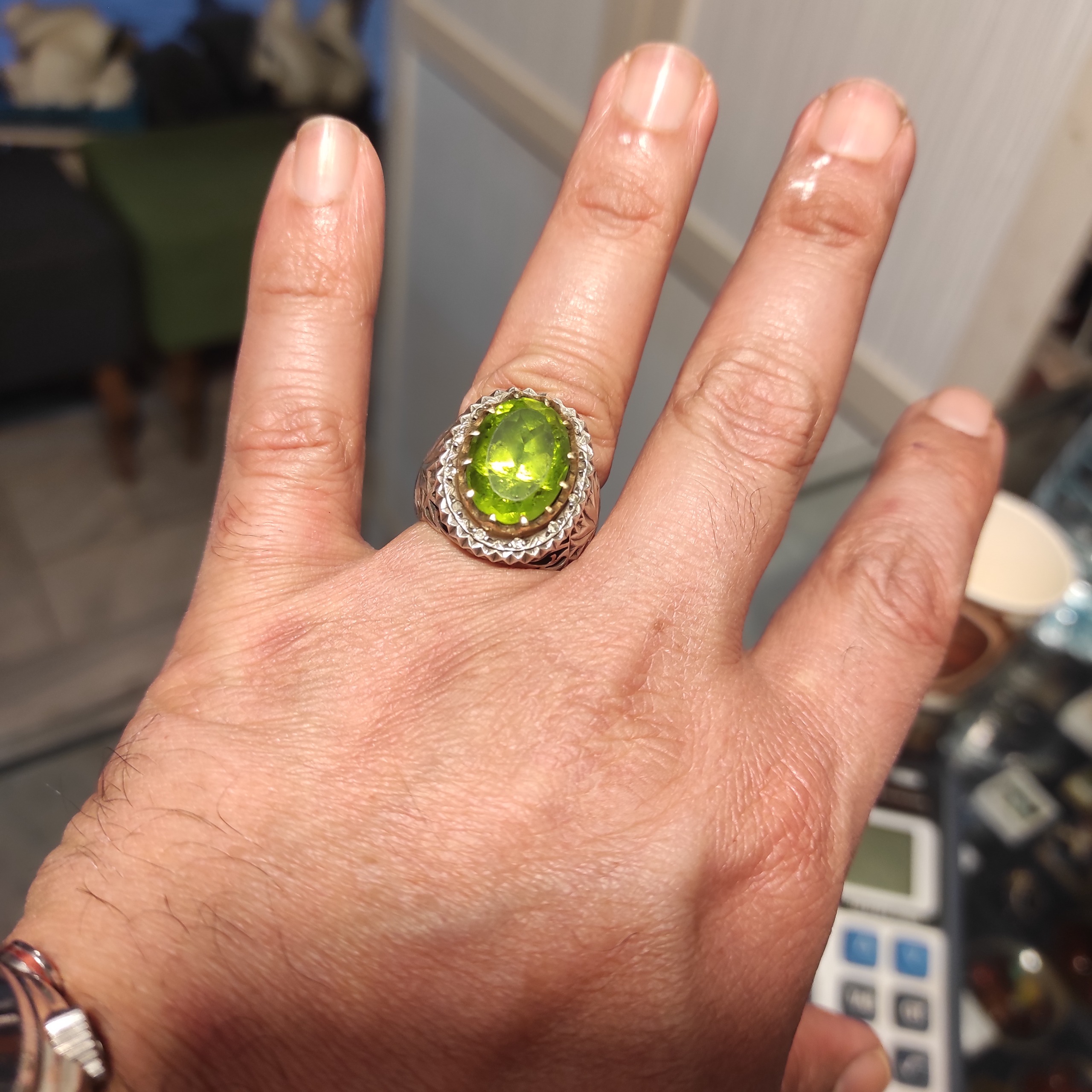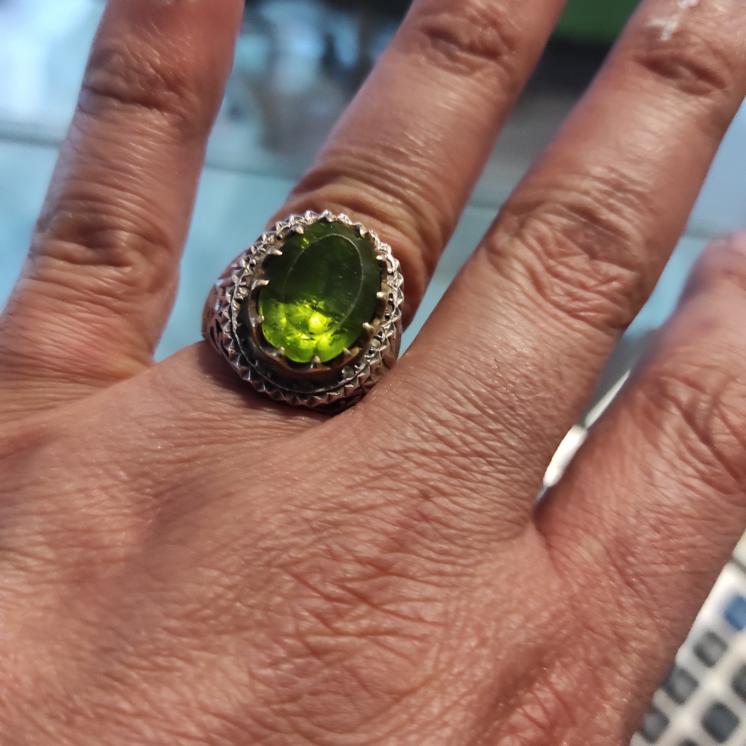 انگشتر زبرجد معدنی رکاب دست ساز دور نگین تمام برلیان اصلی وکنار نگین قلم مینیاتوری با دستگاه کنار بازو قلم دست و اره کاری