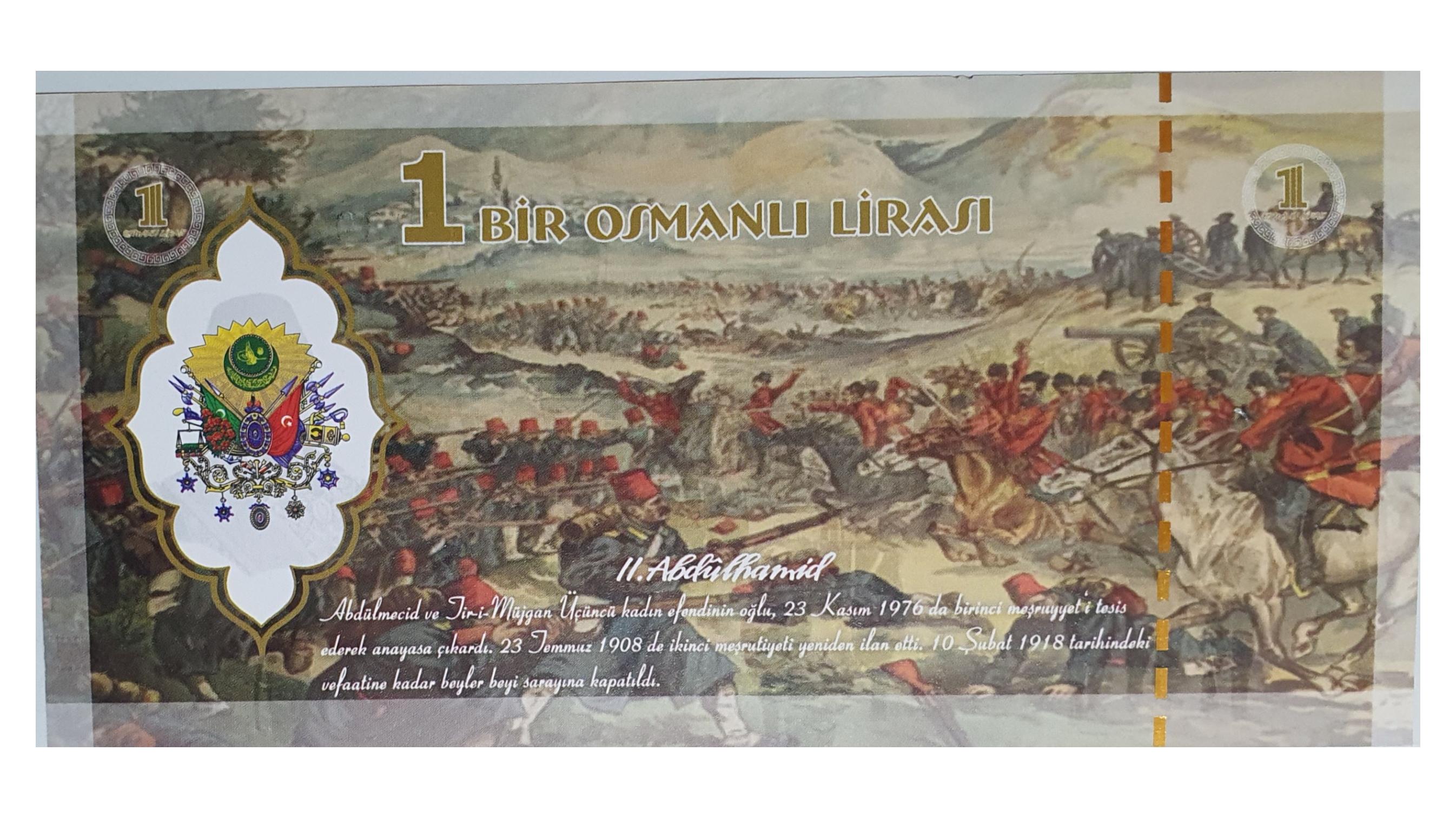 این اسکناس نایاب یادبود و کلکسیونی جذاب مزین به تصویر سلاطین عثمانی با طرح های امنیتی تزئینی و کیفیت چاپ براق ، رنگی و نشان سلطنتی عثمانی در پشت اسکناس می باشد .