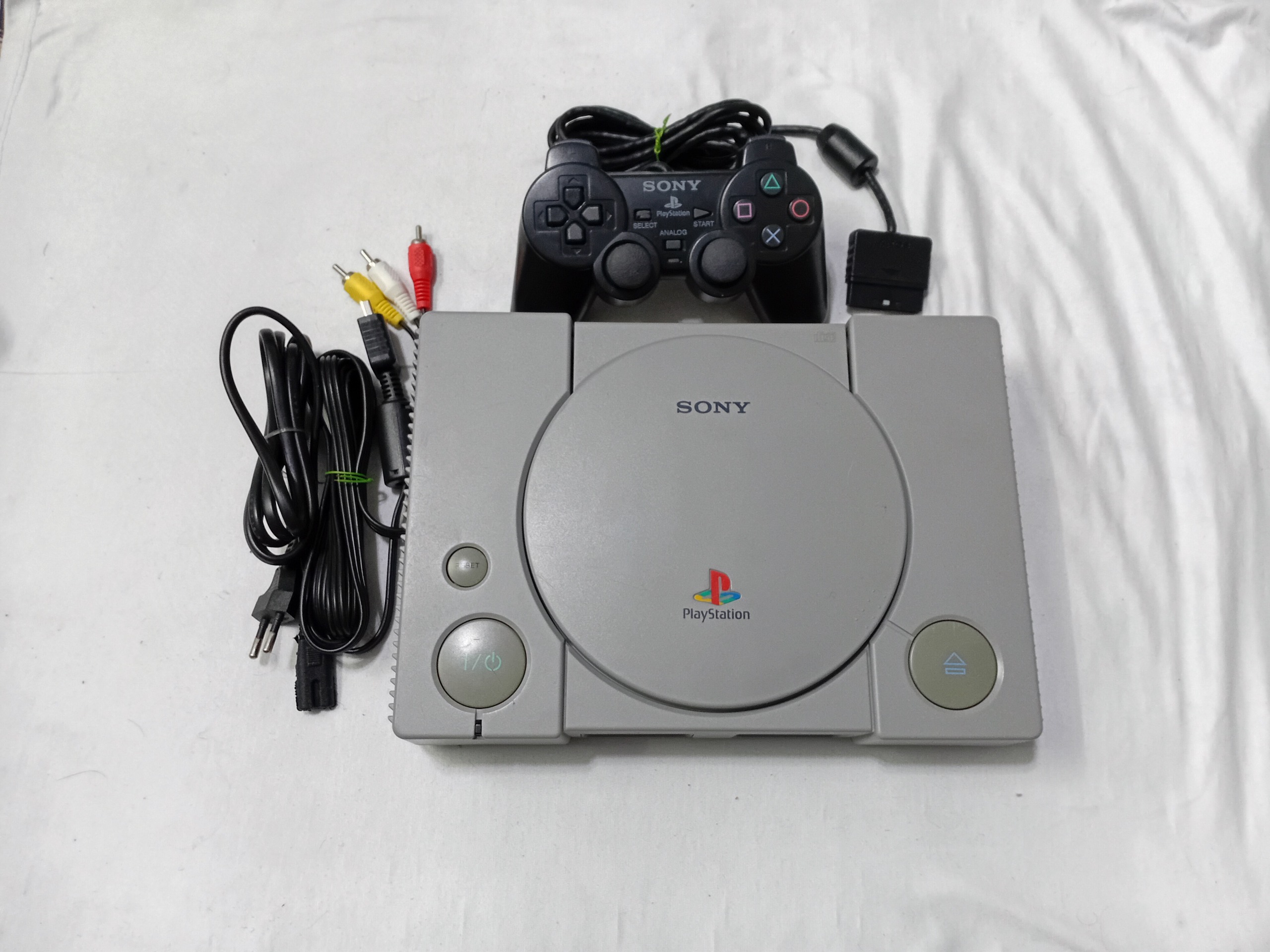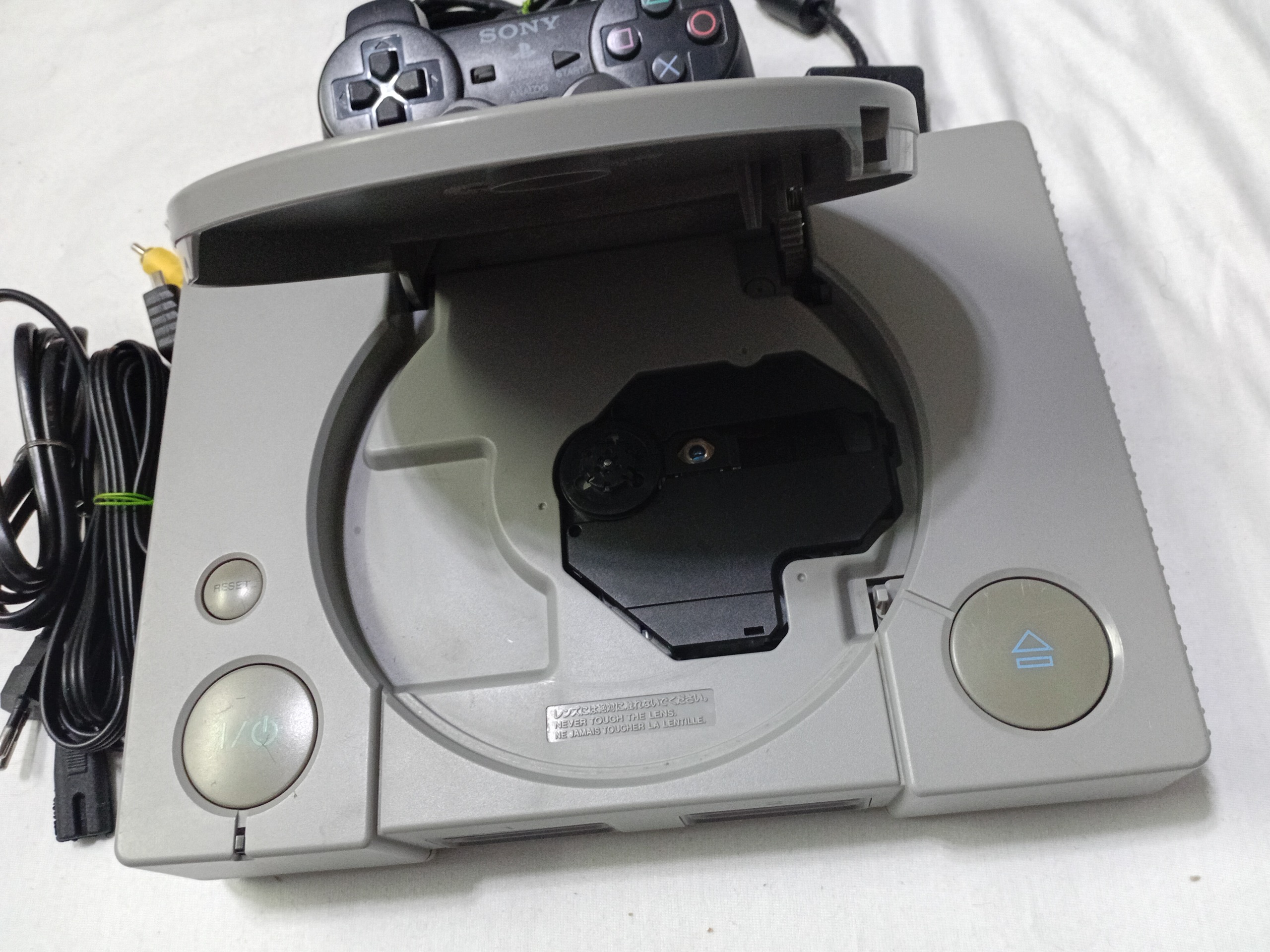 سونی پی اس وان . مدل فت ژاپنی سالم . لنز اصلی سالم . فیش تصویر و کابل برق دارد . یک عدد دسته دارد . دسته مقداری کهنه آنالوگ لقب ولی برای استفاده عادی مشکلی ندارد .یکی  دو  عدد دیسک بازی جهت تست دستگاه ارسال می شود . لنز نسبتا قوی و اصل