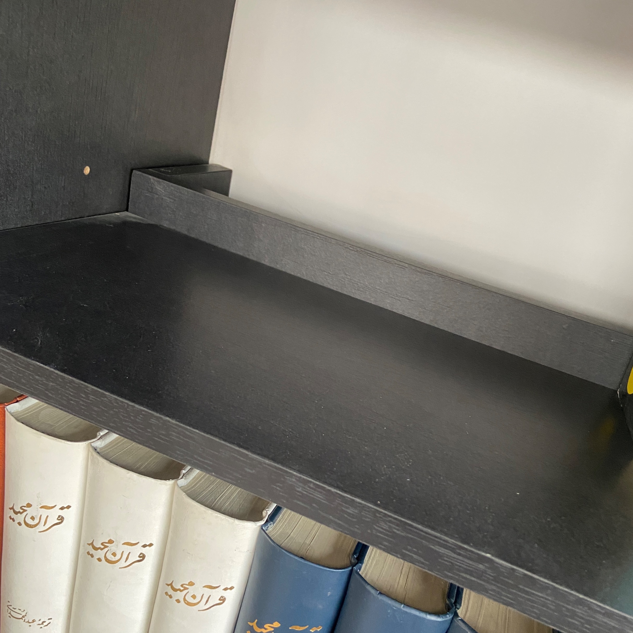 کتابخانه MDF مشکی، دارای نور داخلی و ایجاد فاصله از ته کمد تا کتابها مرتب و جلو قرار بگیرمد.