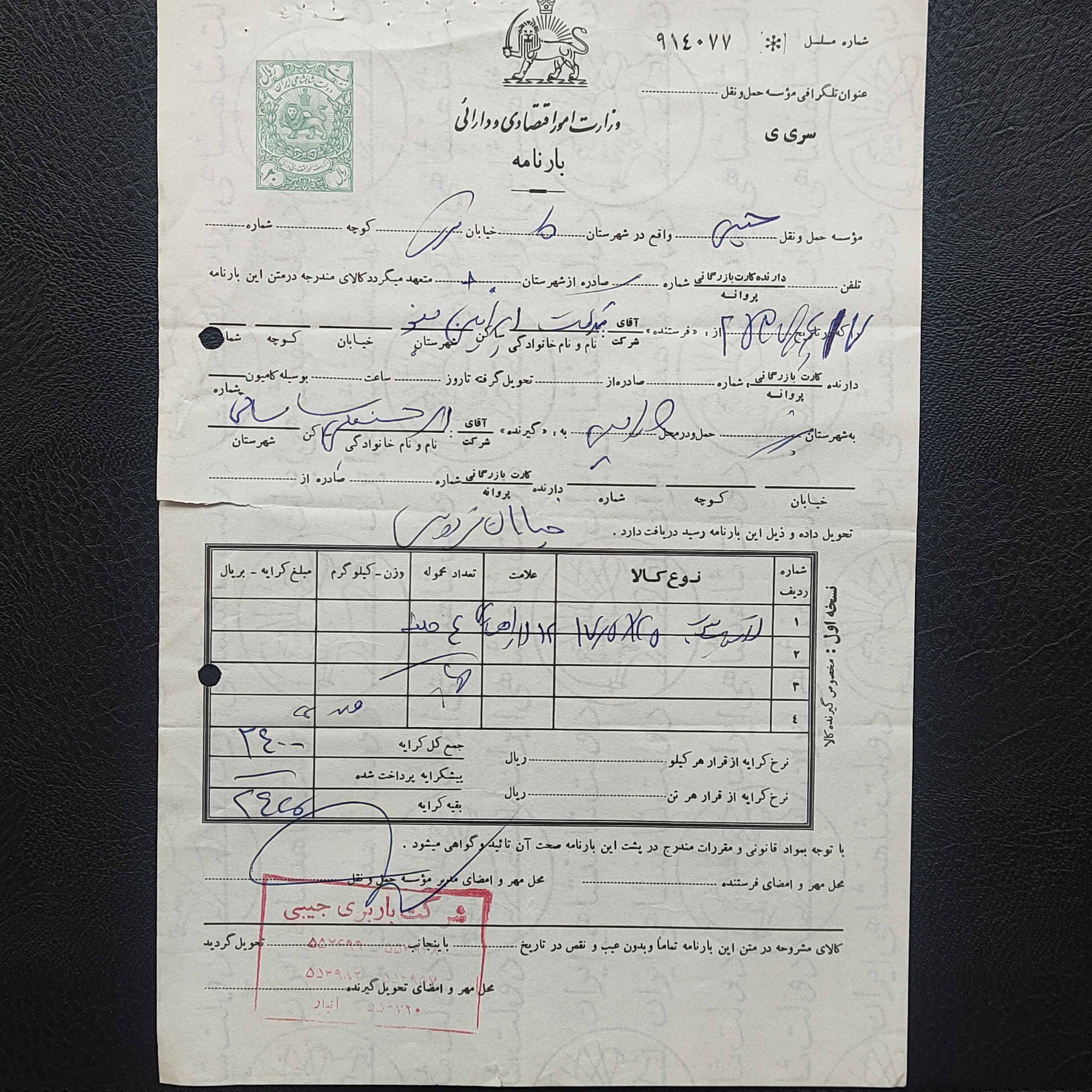یک برگ بارنامه فیلیگران خاص