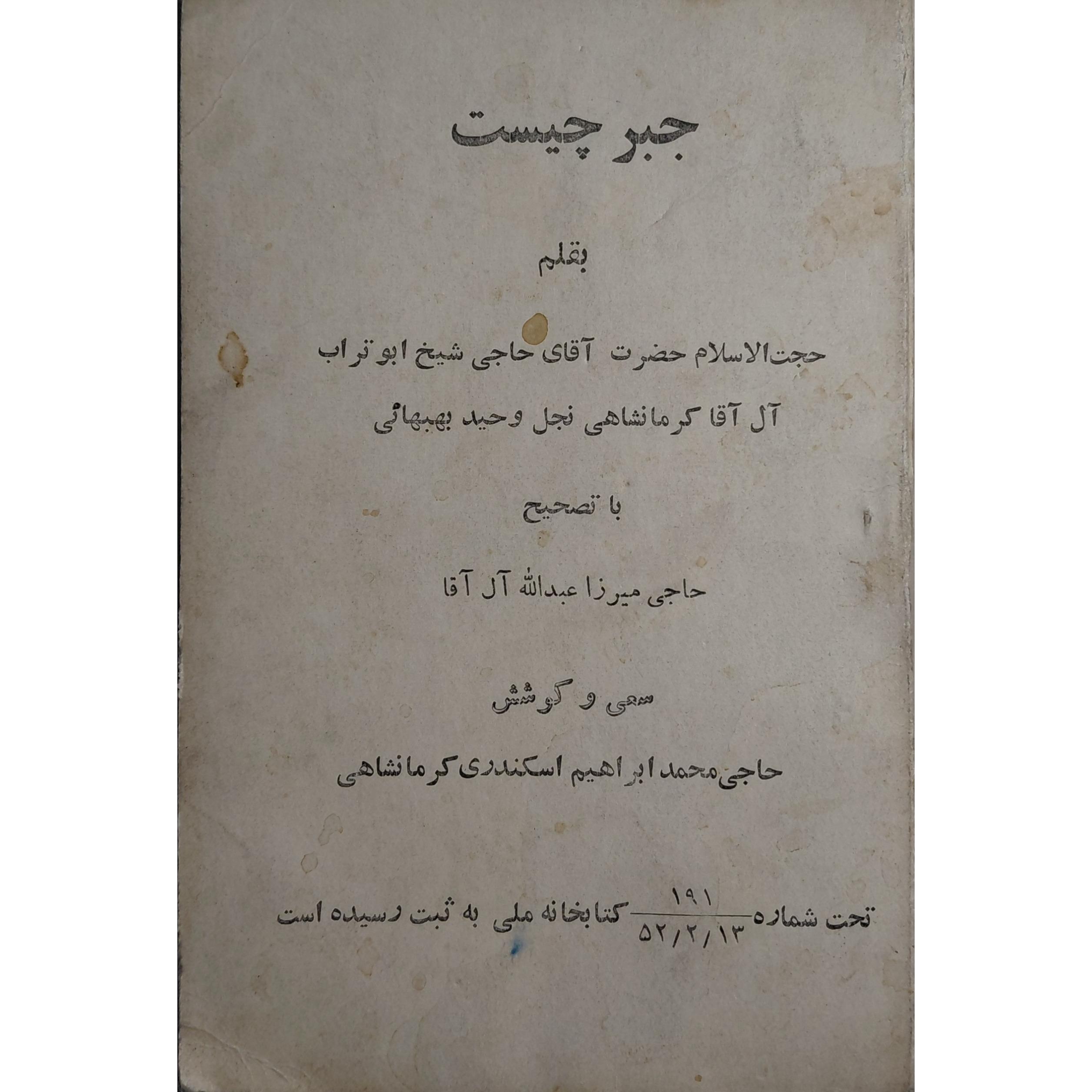 کتابچه ای در موضوع جبر و قضا با عنوان "جبر چیست؟" تالیف شیخ ابوتراب آل آقا کرمانشاهی، چاپ 1352، قطع جیبی در 112 صفحه