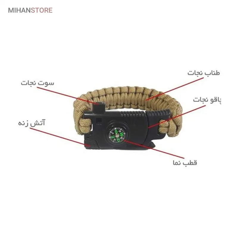 دارای: چاقو، قطب نما، آتش زنه، طناب، سوت نجات