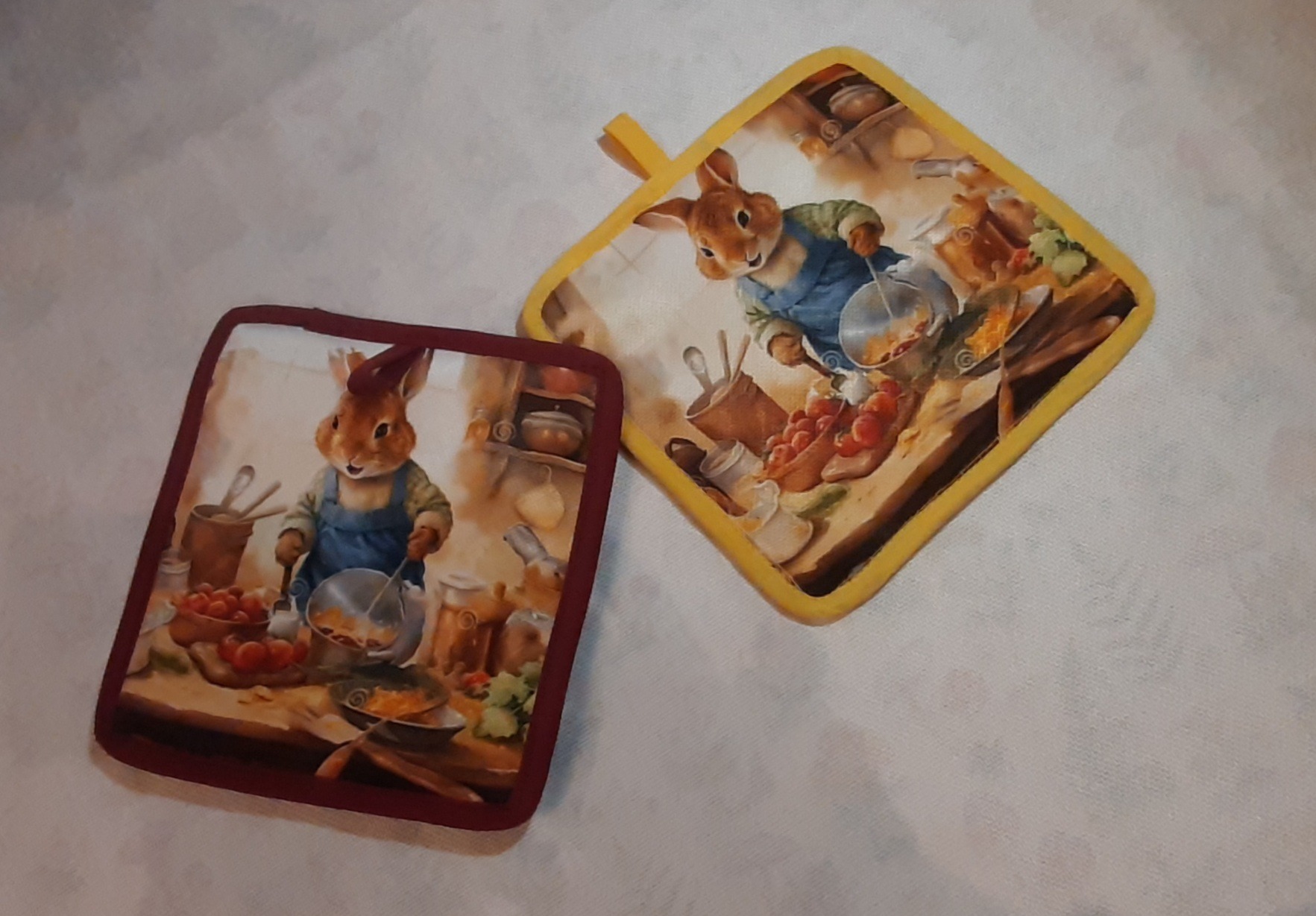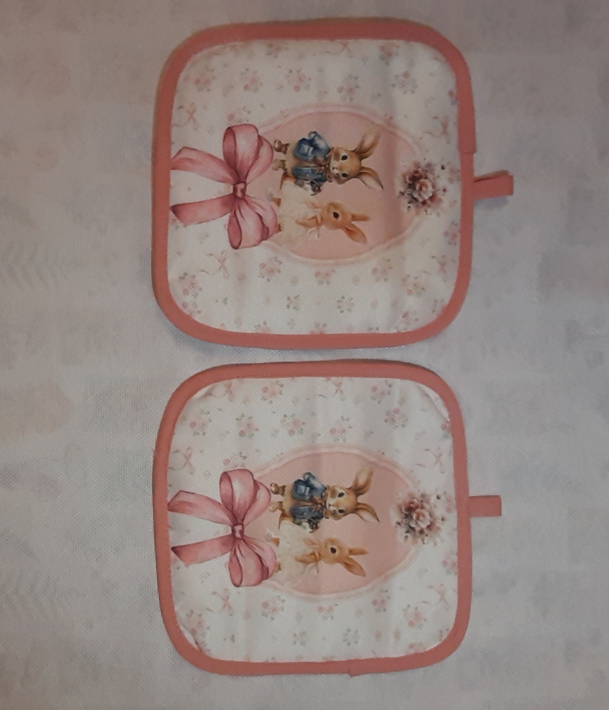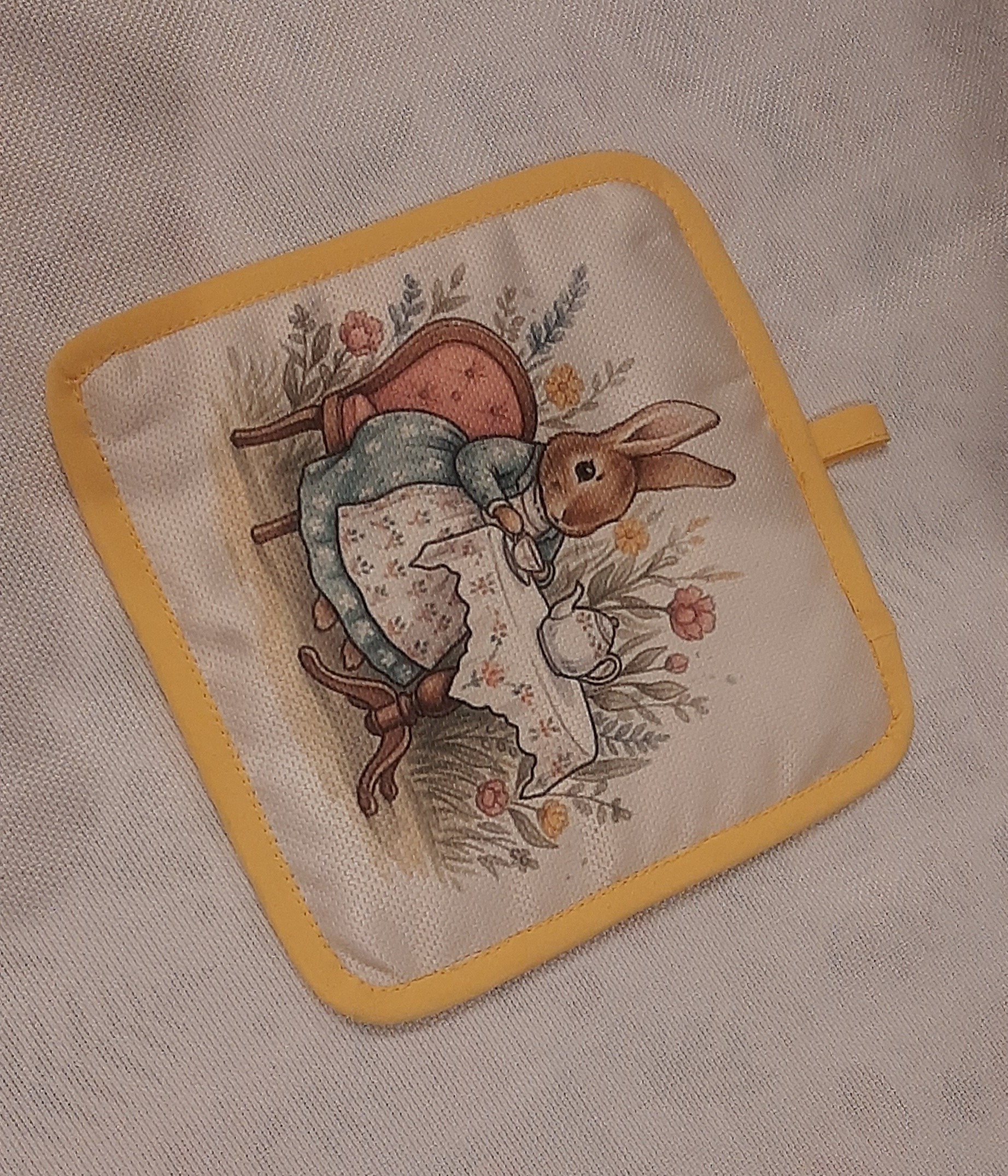 دستگیره نسوز پنلی باطرح عروسکی دور نوار دوزی کتان.پشت کار پارچه کتان .ابعاد 17×17