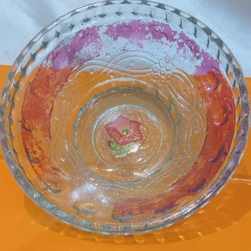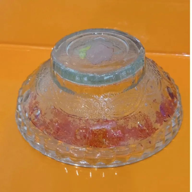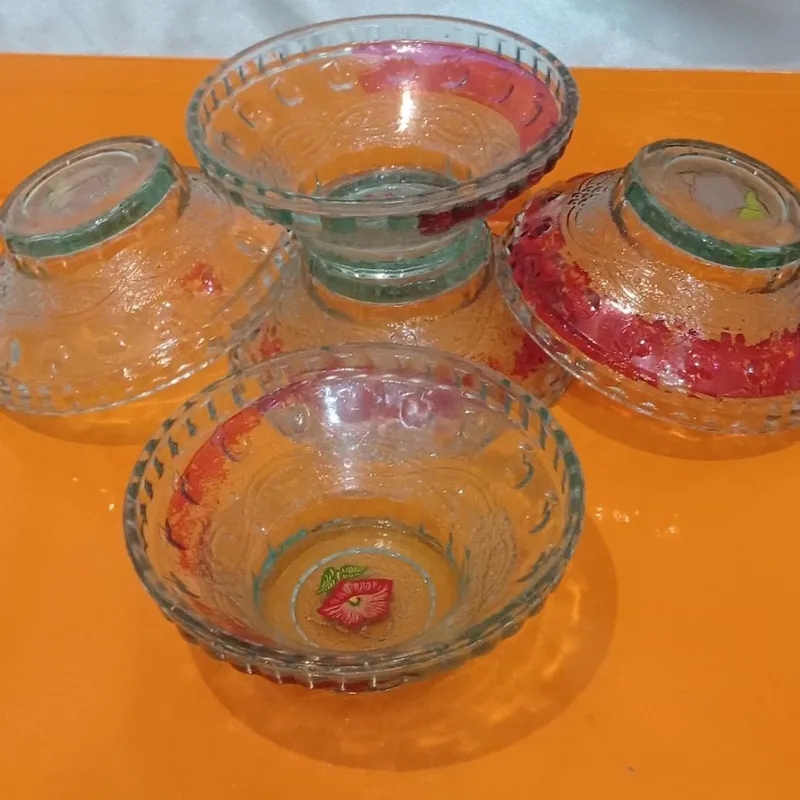 نوار قرمز دور پیاله کمرنگ شده است ، تعداد پنج عدد ، قطر بزرگ 13 سانت ، قطر کوچک 6/5 سانت