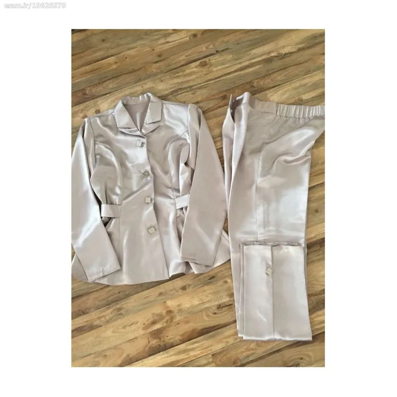 کت و شلوار ساتن نقره ای سایز 38 نو زنانه