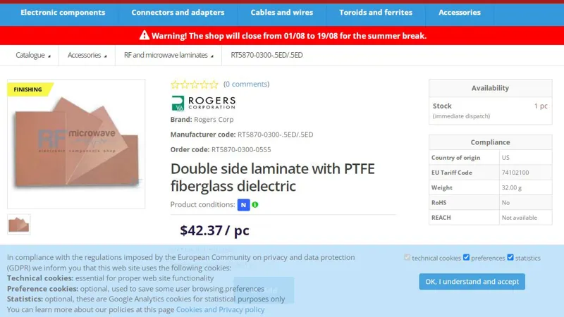 فیبر مدار چاپی Rogers فرکانس بالا تفلون RT5870