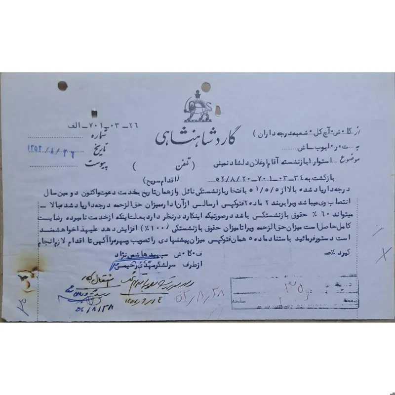 نامه با امضا سرلشکر مهدی رحیمی اخرین فرماندار نظامی تهران که در 26 بهمن 1357 با حکم خلخالی تیرباران گردید