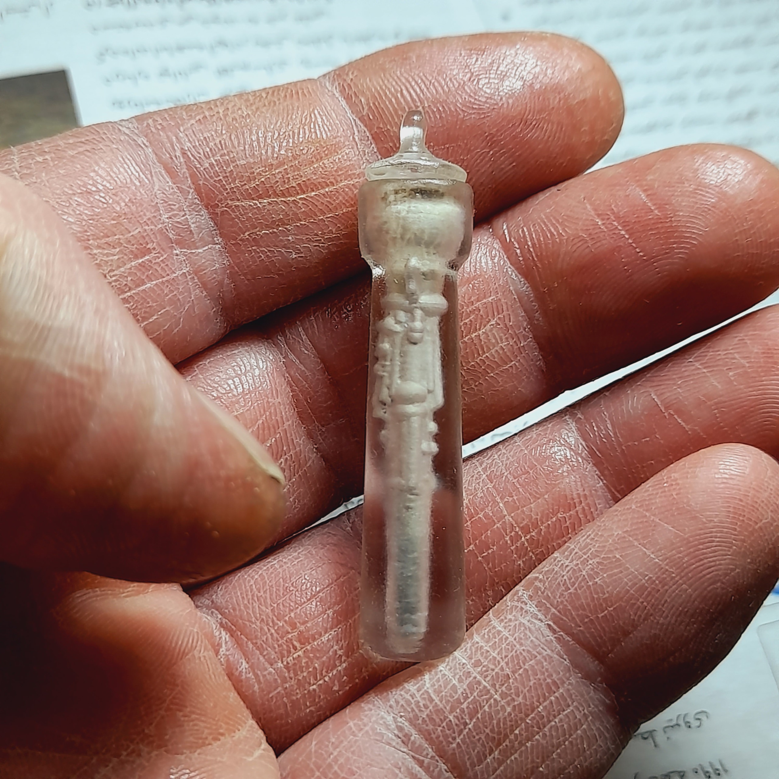 مهره شیشه ای که یک دیو داخلش زندانی شده ...دوستان نقش این دیو به صورت بسیار ماهرانه داخل سوراخ باریک از داخل حکاکی شده ..که کار هرکسی نیست خیلی کار مشکلی هست که از داخل حکاکی بشه و این شکل در بیاد... ممکن هست جنسش  شیشه نباشه و سنگ   در (نجف) باشه  دقیق نمیدونم .ولی کلا کار زیبا و خاصی هست