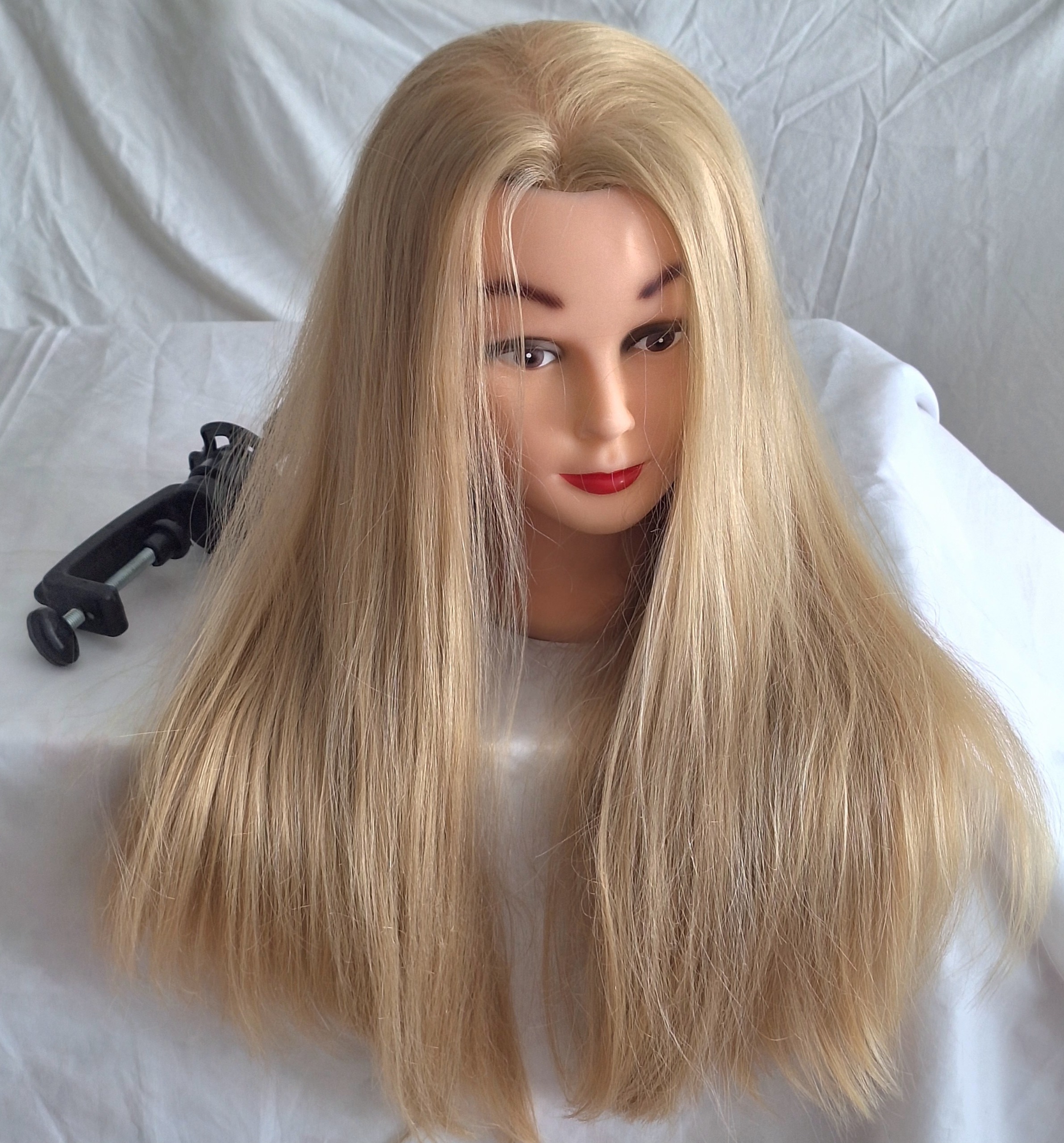 کله مانکن همراه با پایه نگهدارنده در حد نو مطابق تصاویر بالا با موی پرپشت مخصوص تمرین کوتاهی با قد موی حدود 50 سانت موجود می باشد. فقط یکبار در حدود 2 سانت کوتاهی کلوش روی کله مانکن انجام شده است.