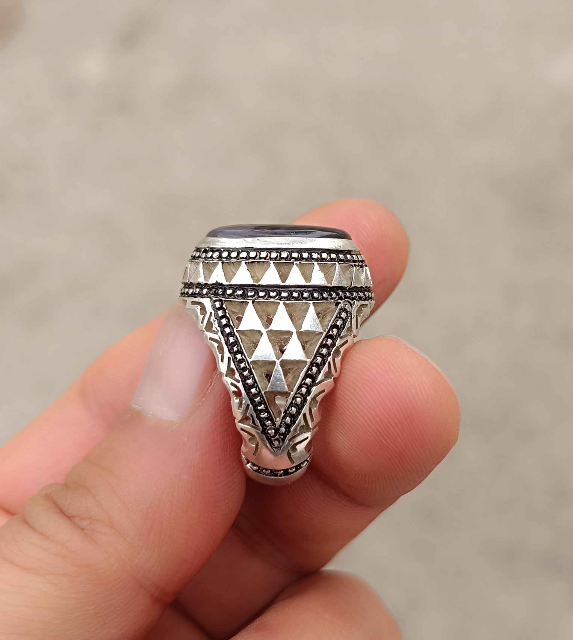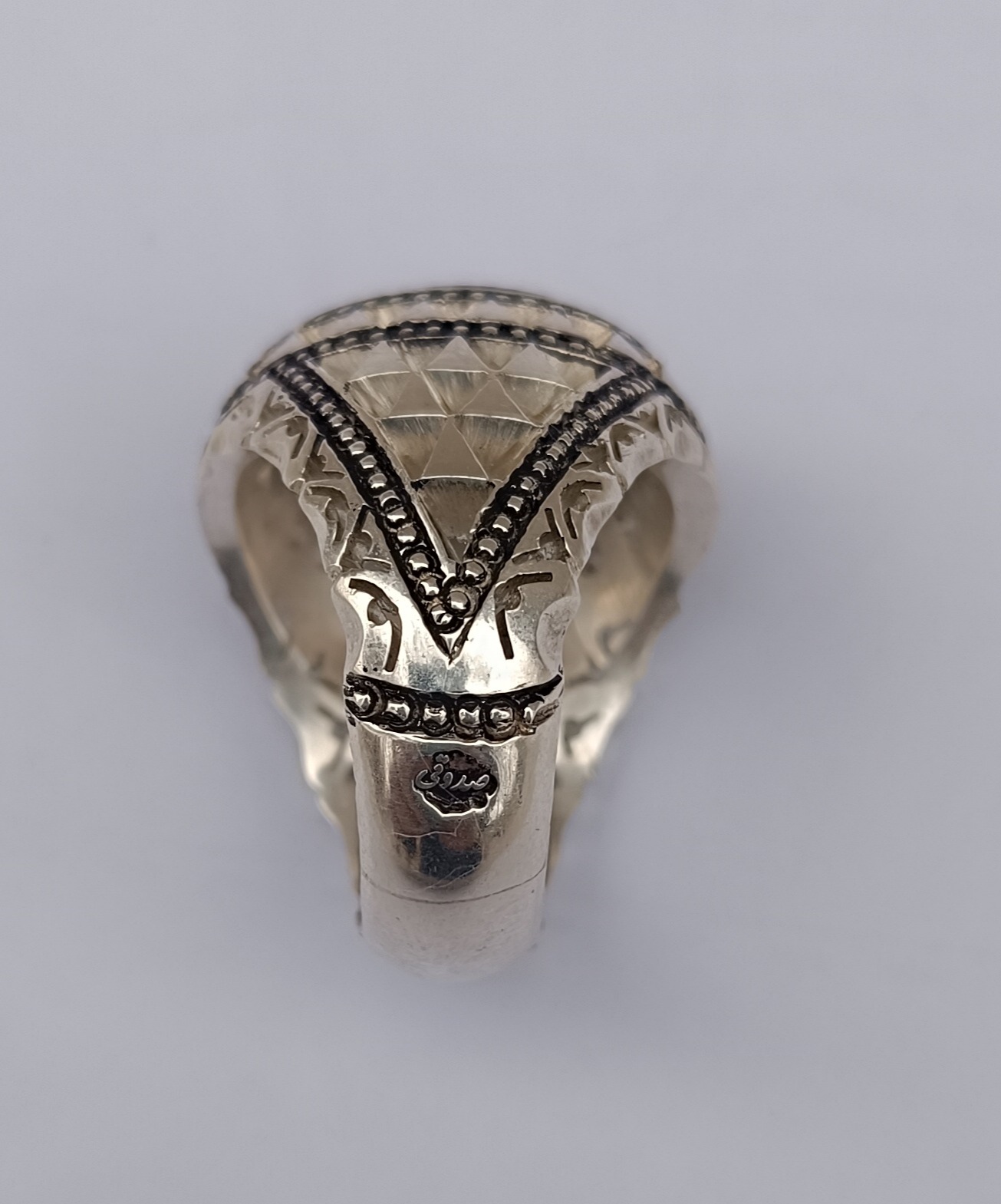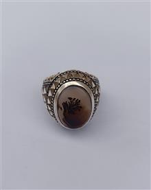 انگشتر نقره دستساز عقیق شجر طبیعی زمینه دار شیشه ای سوار بر رکاب دستساز در کار اره کاری گوارسه زنی با مهر استاد صدوقی
