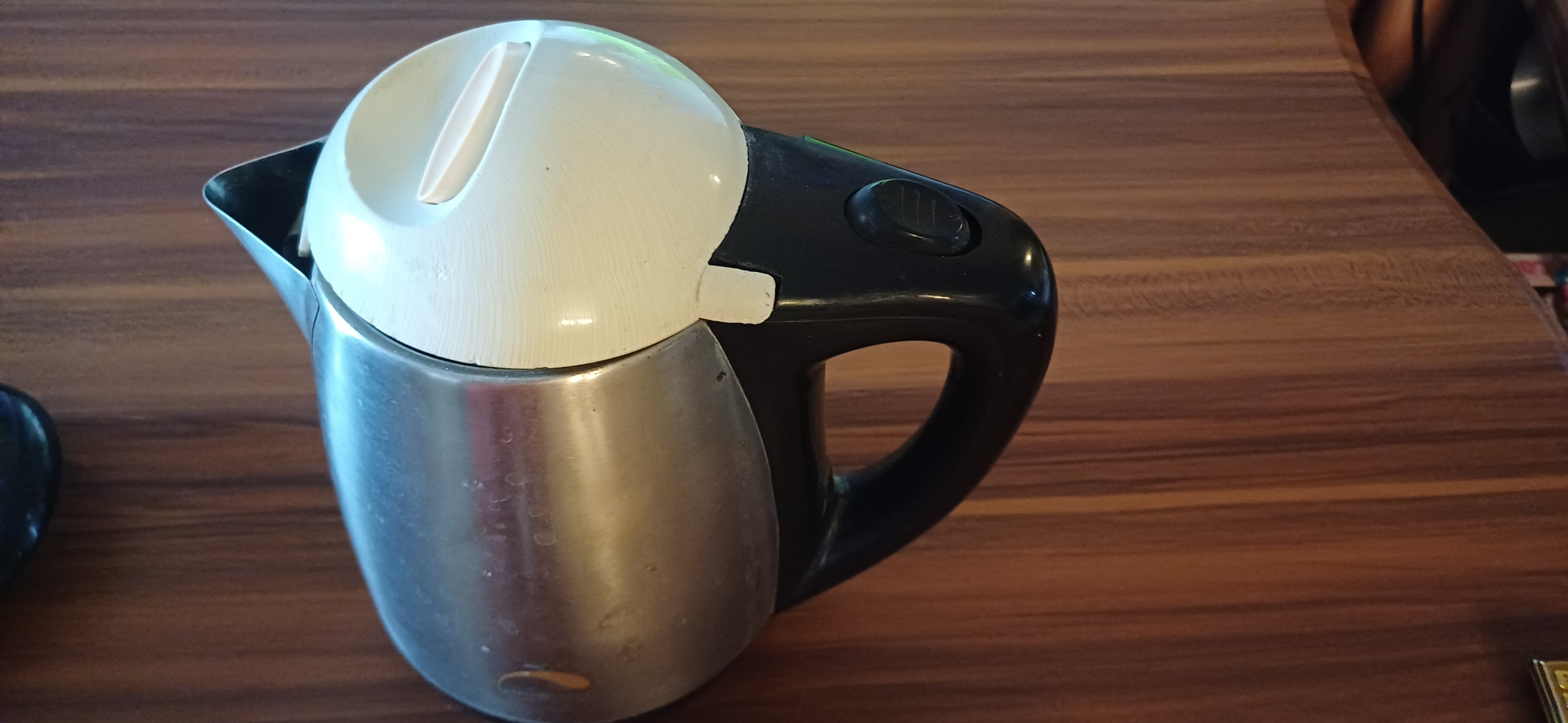 یکی اینکه کتری نشتی آب داره، بلید چسبیده شود. و یه مورد که لولای درب روی کتری شکسته که داخل عکس مشخصه. ولی پایه برقی کاملا سالمه و خوب و سریع داغ میشه و میجوشونه، برابر شکل ها.