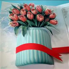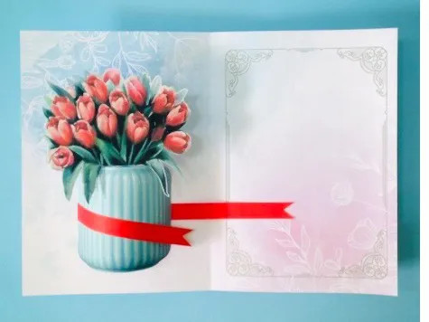 کارت پستال های سه بعدی همیشه یکی از هیجان انگیزترین هدیه هایی هستند که می توان در مناسبت های مختلف و حتی بدون مناسبت خاصی برای عرض احترام و نشان دادن عشق و دوستی به عزیزان هدیه داد، مخصوصا زمانی که این کارت ها ساختاری کاملا ویژه و متفاوت و منحصر به فرد داشته باشند. کارت پستال سه بعدی طرح عشق در حالت عادی یعنی زمانی که درون پاکت قرار دارد دقیقا به شکل یک کارت پستال معمولی است، اما زمانی که کارت باز می شود درون آن یک گلدان با گل های لاله به صورت برجسته و نزدیک به گُل طبیعی مخصوصاً از فاصله ی دور و سه بعدی شکل میگیرد. توجه داشته باشید که برای ایجاد حالات سه بعدی و برجسته، کارت باید به طور کامل (180 درجه) باز شود.