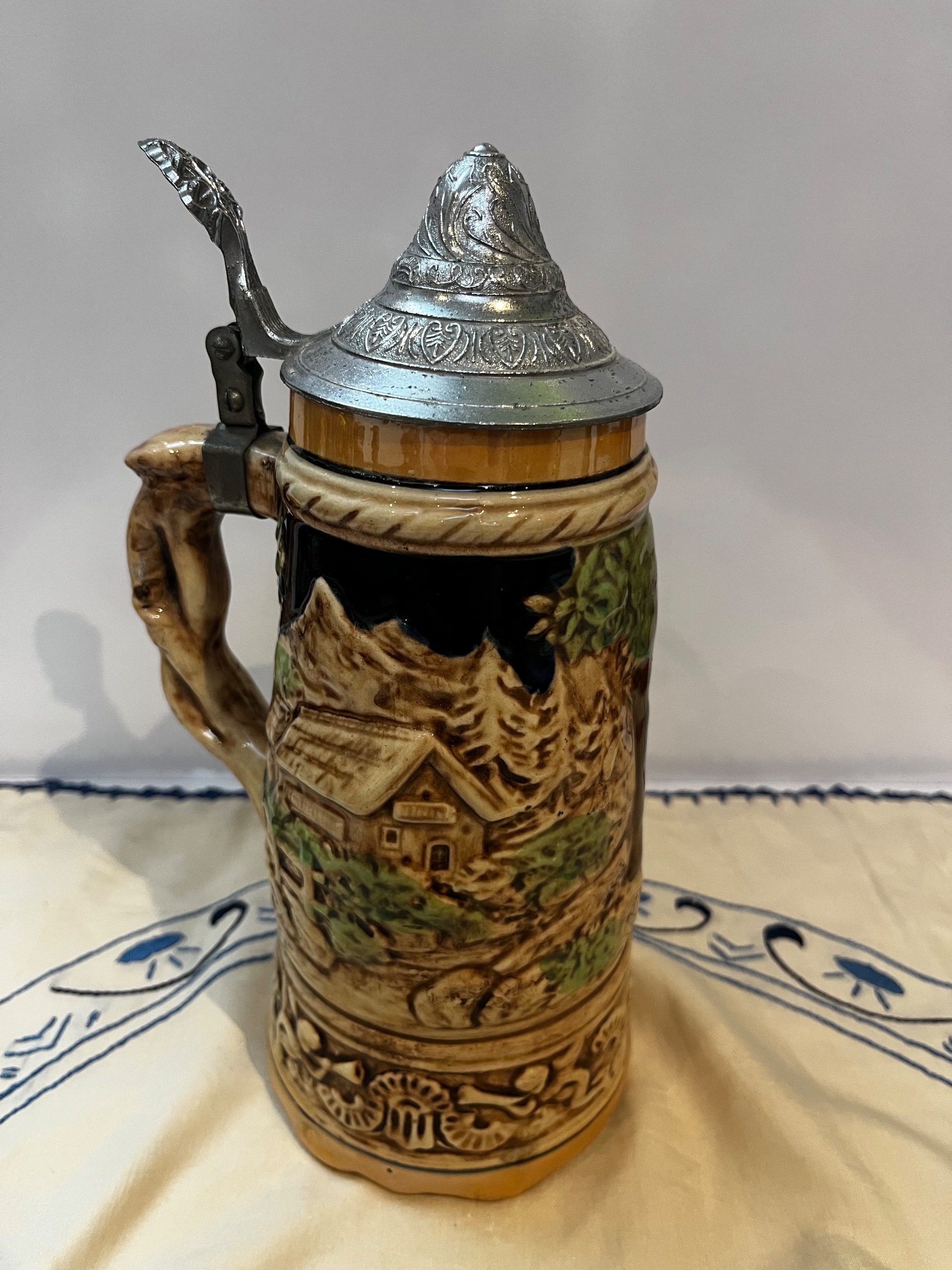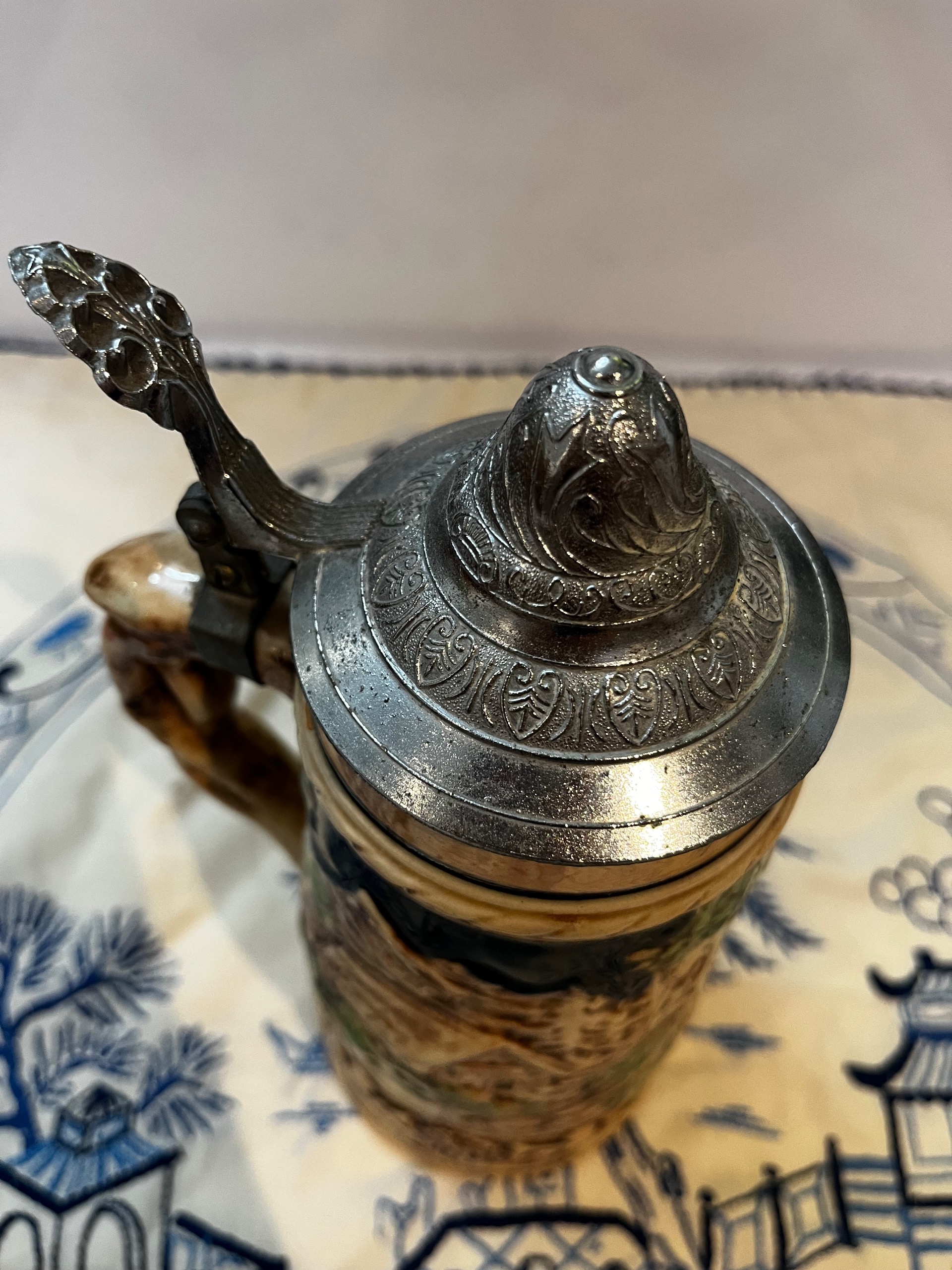 ماگ موزیکال قدیمی ساخت آلمان با درب پیوتر طرح برجسته نقاشی دست ارتفاع 26 سانت
