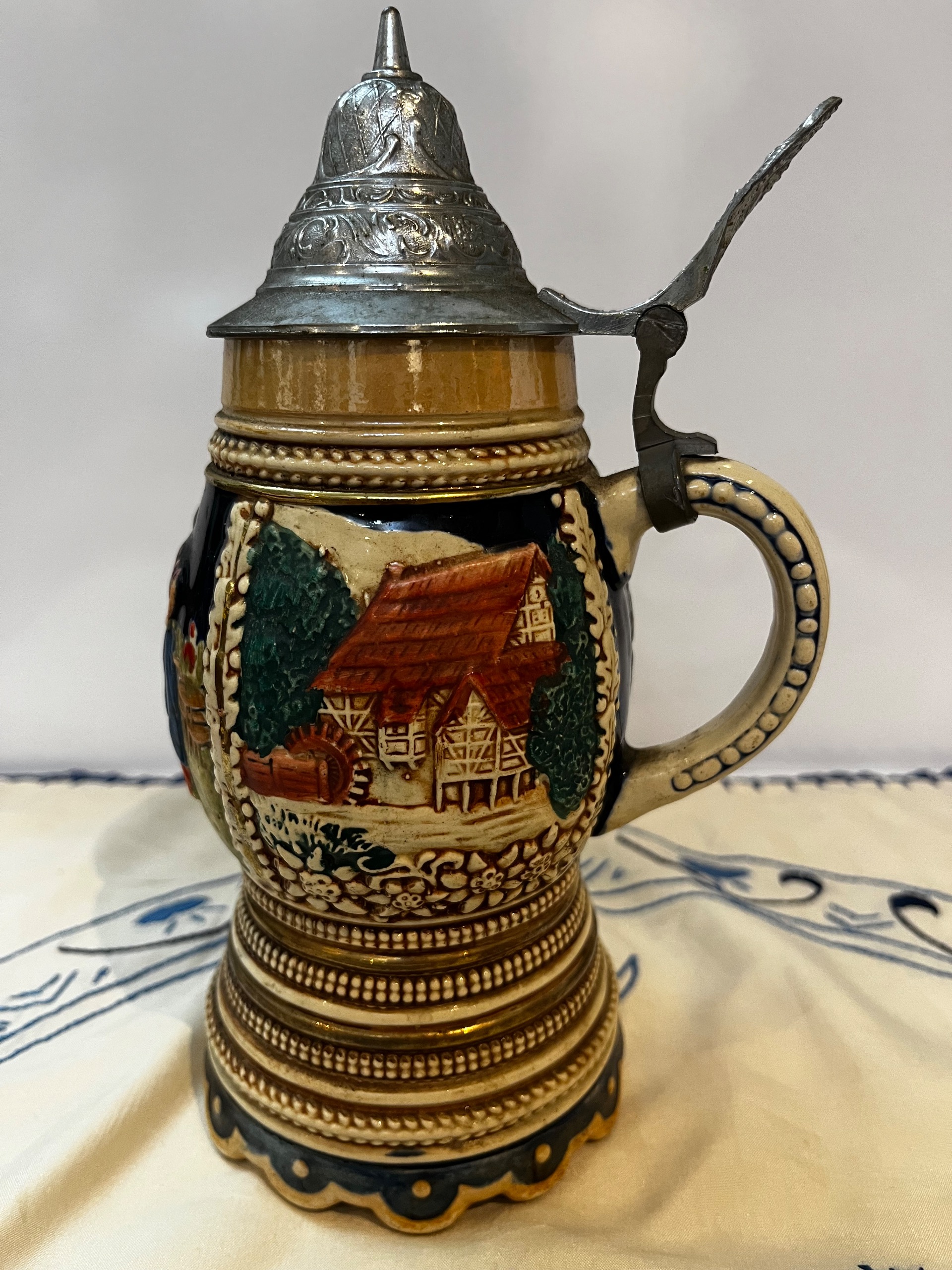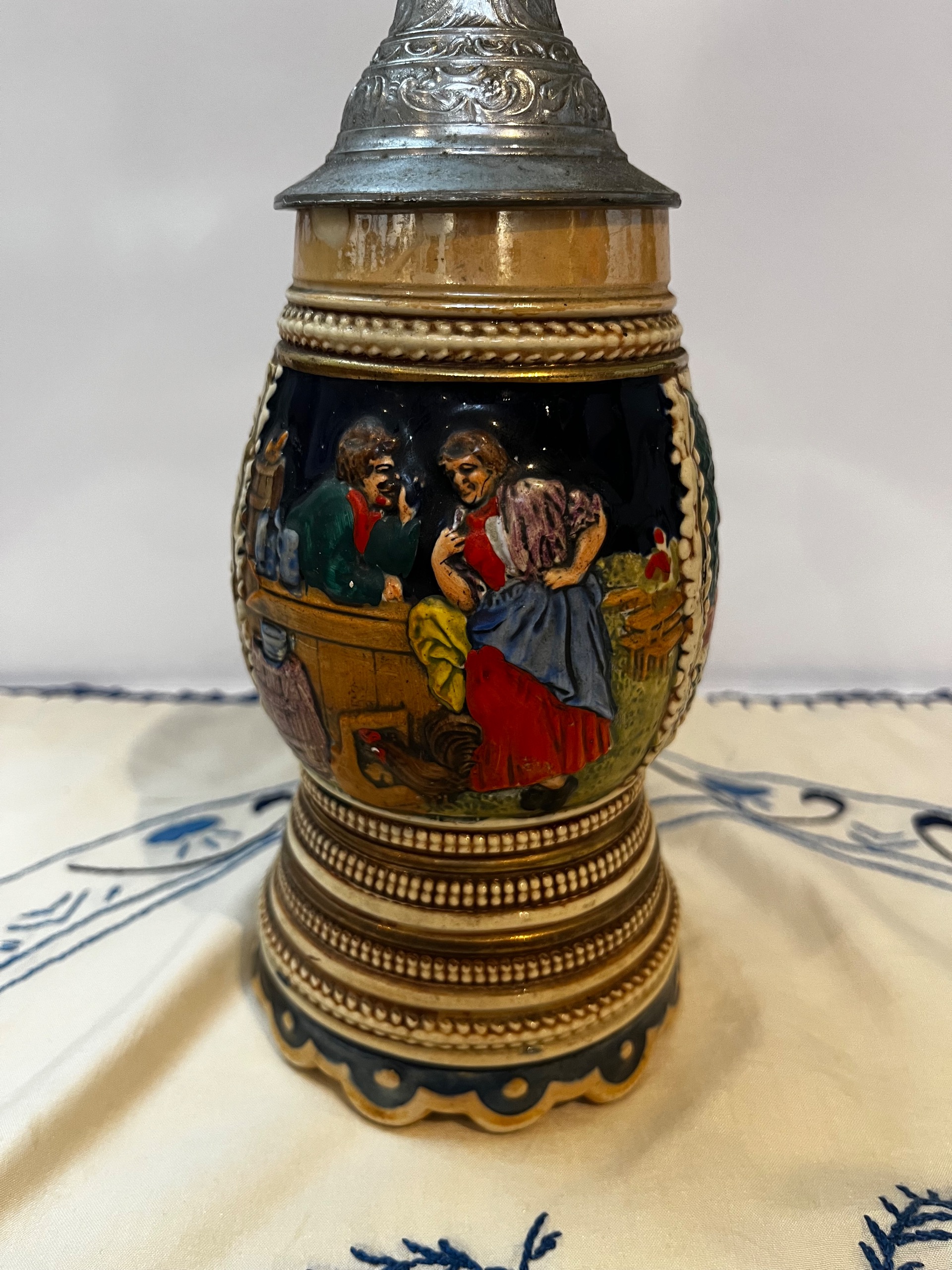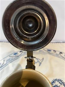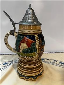 ماگموزیکال آلمانی نقاشی دست و طرحدار برجسته با درب پیوتر ،موزیکال سوئیسی ارتفاع 20 سانت و قطر دهنه6 سانت (قسمتی پریدگی دارد)