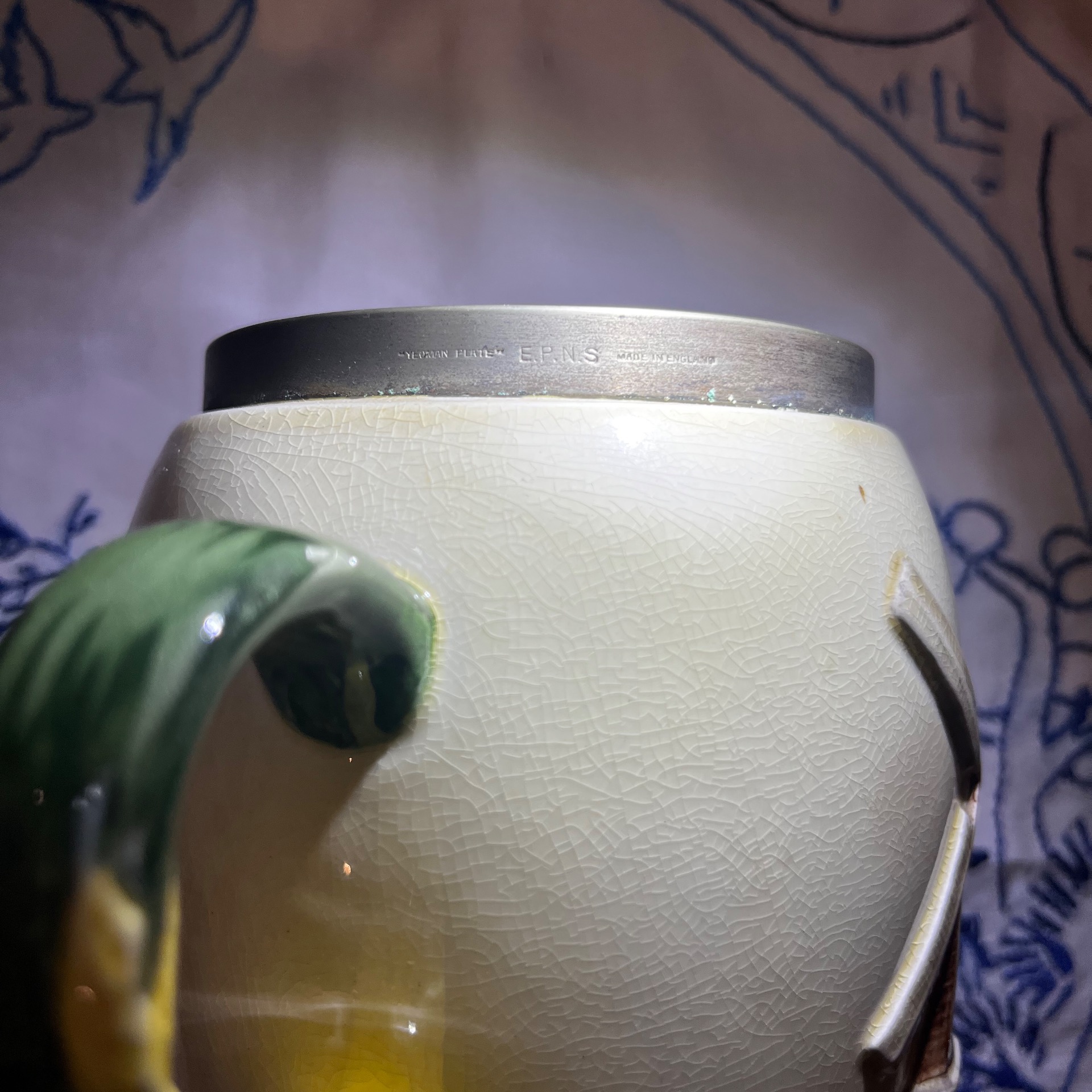 ماگ موزیکال انگلیسی قدیمی ایپنز(EPNS) و لبه ماگ از جنس پیوتر،مارکدار،نقاشی دست و طرح برجسته ارتفاع 14 سانت قطر 9 سانت