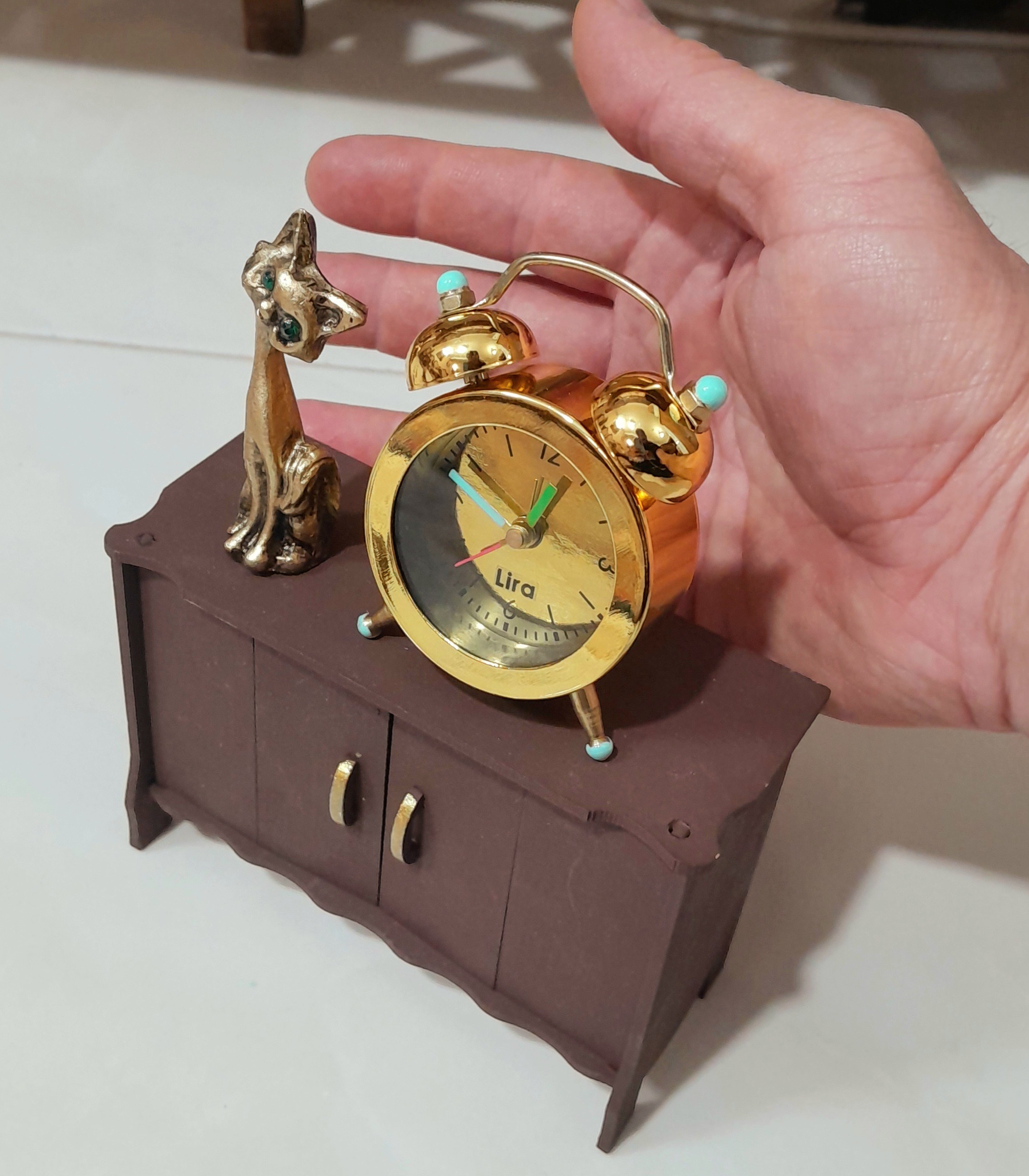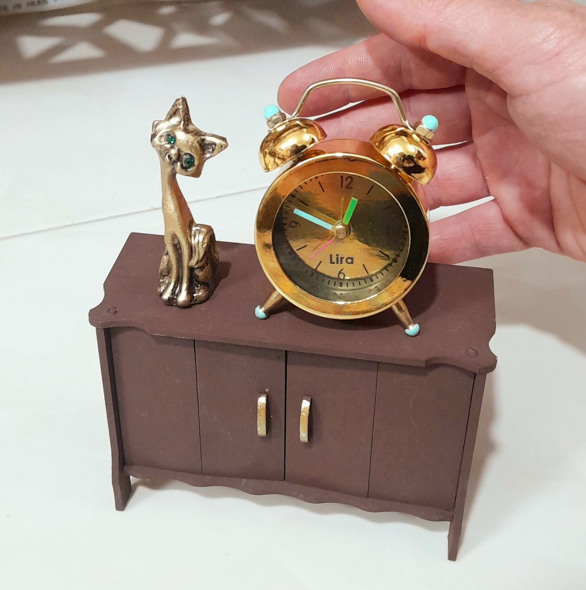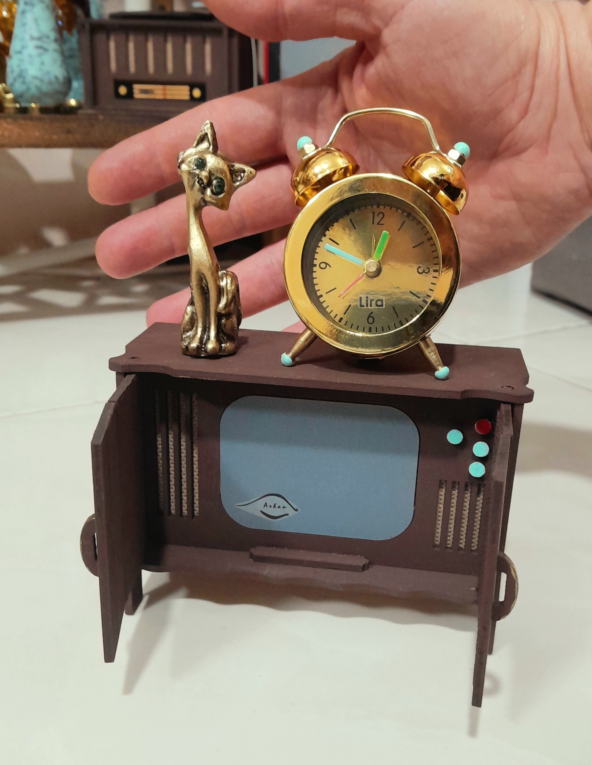 ماکت تلویزیون چوبی درب دار و ساعت رومیزی و مجسمه گربه