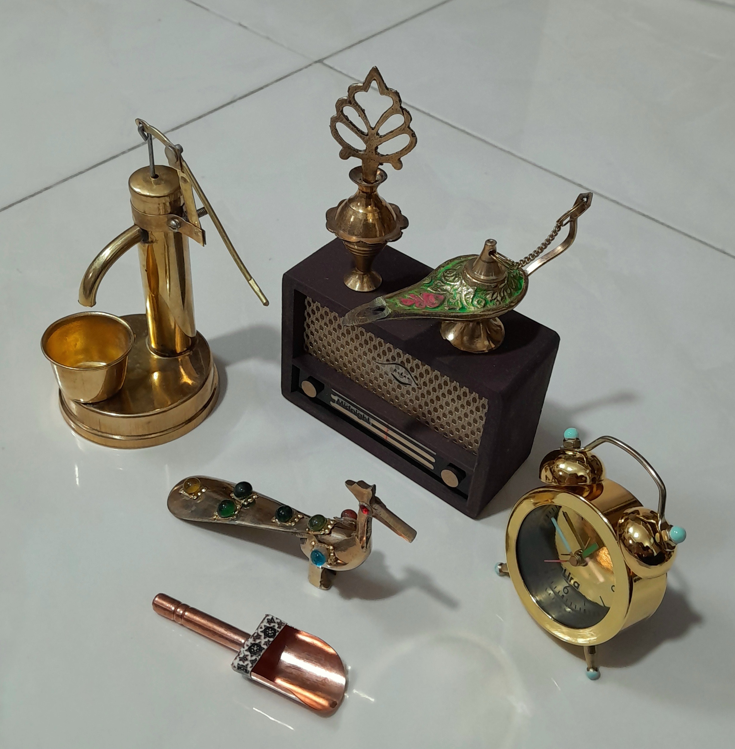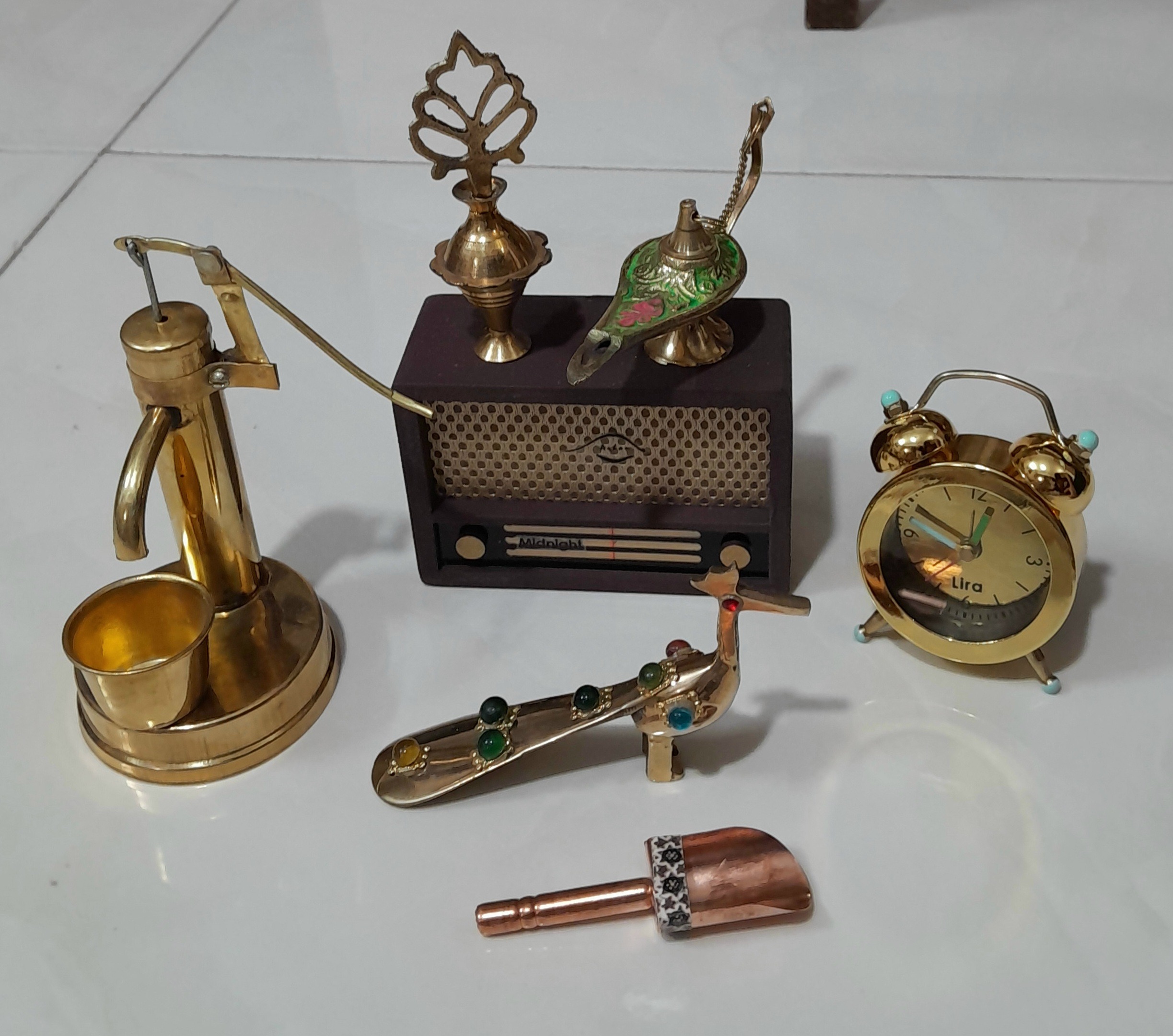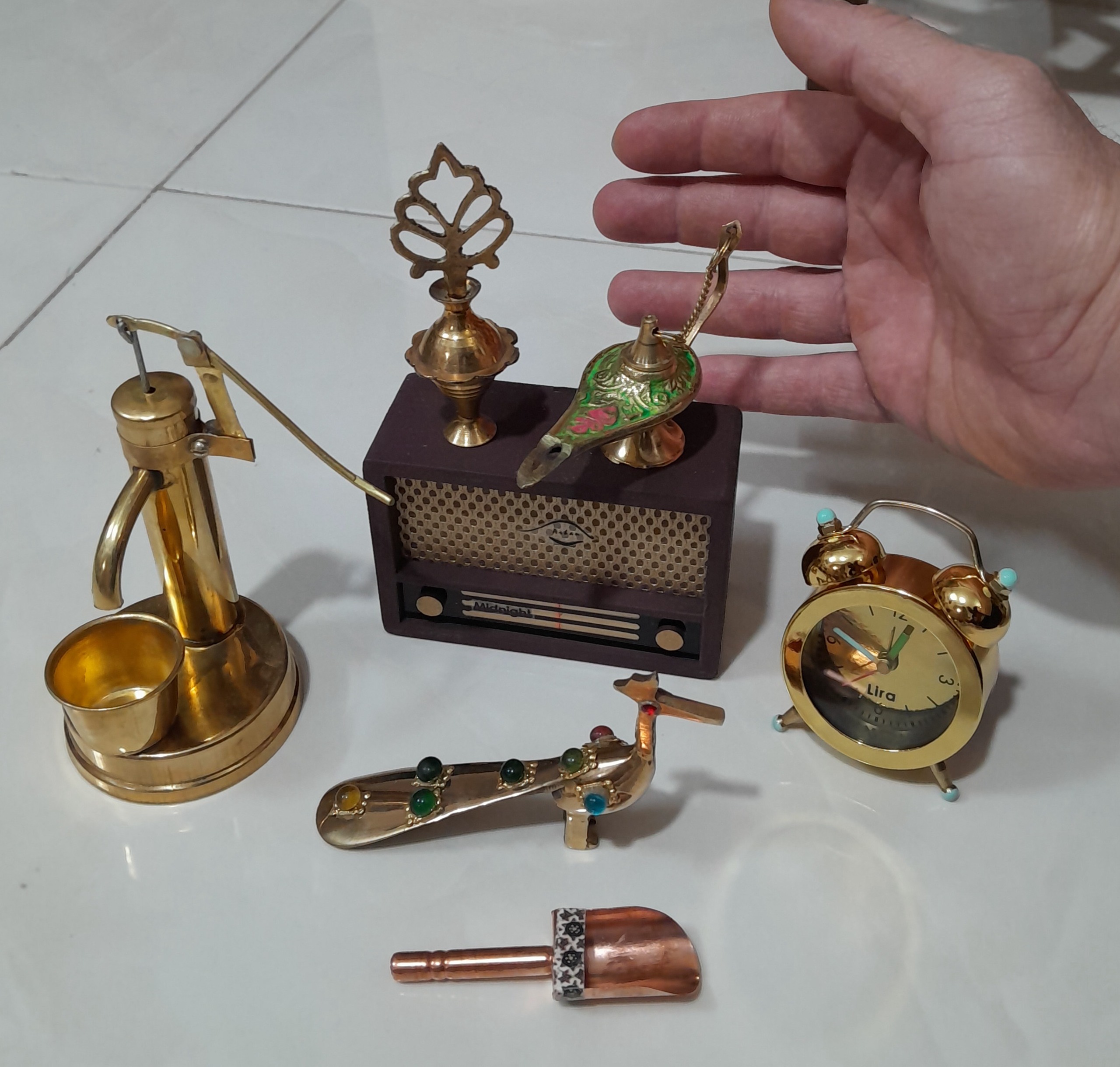 ماکت رادیو چوبی کوچک، تلمبه آب برنجی، چراغ جادو برنجی، سرمه دان برنجی، طاووس برنجی، سرتاس کوچک مسی، ساعت