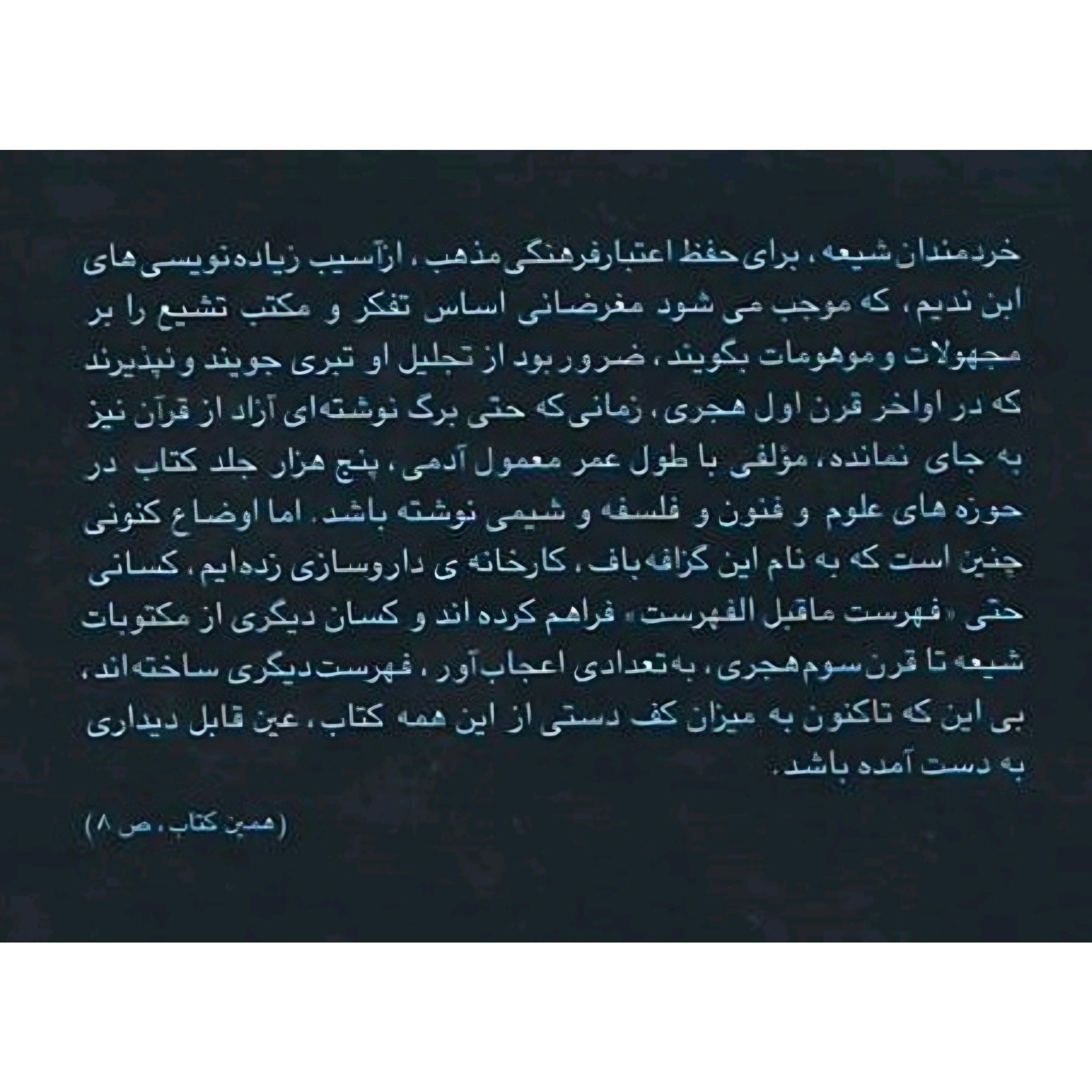 خردمندان شیعه، برای حفظ اعتبار فرهنگی مذهب، از آسیب زیاده نویسی های ابن ندیم که موجب میشود مغرضانی اساس تفکر و مکتب تشیع را بر مجهولات و موهومات بگویند ضرور بود از تجلیل او تبری جویند و نپذیرند که در اواخر قرن اول هجری، زمانی که حتی برگ نوشته ای آزاد از قرآن نیز به جای نمانده مؤلفی با طول عمر معمول آدمی ، پنج هزار جلد کتاب در حوزه های علوم و فنون و فلسفه و شیمی نوشته باشد. اما اوضاع کنونی چنین است که به نام این گزافه باف، کارخانه ی داروسازی زده ایم، کسانی حتی «فهرست ما قبل الفهرست فراهم کرده اند و کسان دیگری از مکتوبات شیعه تا قرن سوم هجری به تعدادی اعجاب آور، فهرست دیگری ساخته اند. بی این که تاکنون به میزان کف دستی از این همه کتاب، عین قابل دیداری به دست آمده باشد.