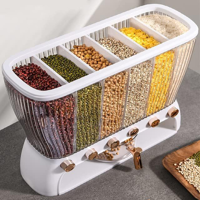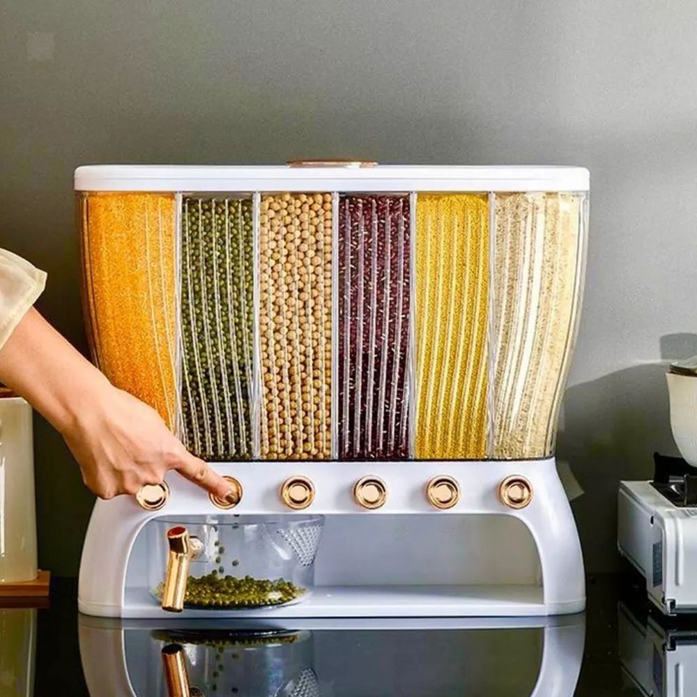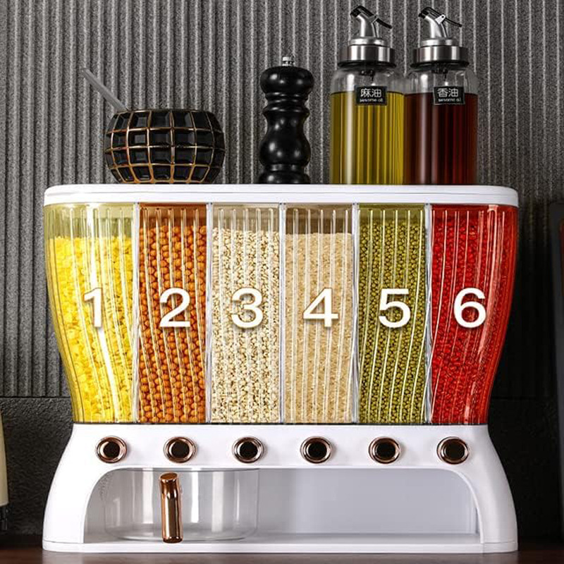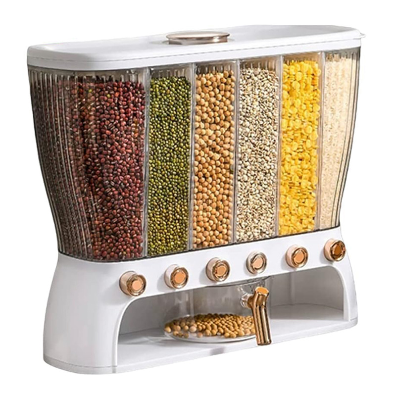 جا حبوباتی 6 خانه ، نمونه ای جدید با طراحی مدرن و بسیار زیبا که نمی توان به راحتی نگاه از آن برداشت . این کالا ار نوع رومیزی و تولید شده از جنس پلاستیک فشرده مقاوم و بسیار باکیفیت است . محفظه اصلی شفاف بوده به طوری که قابلیت مشاهده محتویات درون آن از بیرون وجود دارد ، بنابراین علاوه بر ایجاد زیبایی ظاهری بیشتر ، از نوع و میزان محتویات درون آن می توان به سادگی مطلع شد . فضای داخلی به 6 قسمت مجزا تقسیم شده که هر کدام خروجی اختصاصی مربوط به خود را در قسمت زیرین دارند ، بنابراین می توان حبوبات مختلف را به صورت یک جا و البته تفکیک شده از یکدیگر درون محفظه ها قرار داد تا همواره به سادگی در دسترس و قابل استفاده باشند . خروجی محفظه ها از نوع دکمه ای است ، نمونه ای که امکان برداشت حبوبات به میزان نیاز و البته ساده ترین حالت ممکن را برای کاربر فراهم می کند . به همراه جا حبوباتی شش خانه یک ظرف پیمانه نیز وجود دارد که کاملاً شفاف است و لبه آسان ریز آبکش دار دارد ، به طوری که می توانید حبوبات برداشته شده از داخل محفظه ها را به سادگی درون همان پیمانه شستشو و آبکشی نمایید بدون اینکه نیازی به ظرف دیگری داشته باشید . همه حبوبات را یکجا و در یک ظرف به صورت مجزا از هم در اختیار خواهید داشت بدون اینکه به ظروف حبوبات متعدد نیازمند باشید .