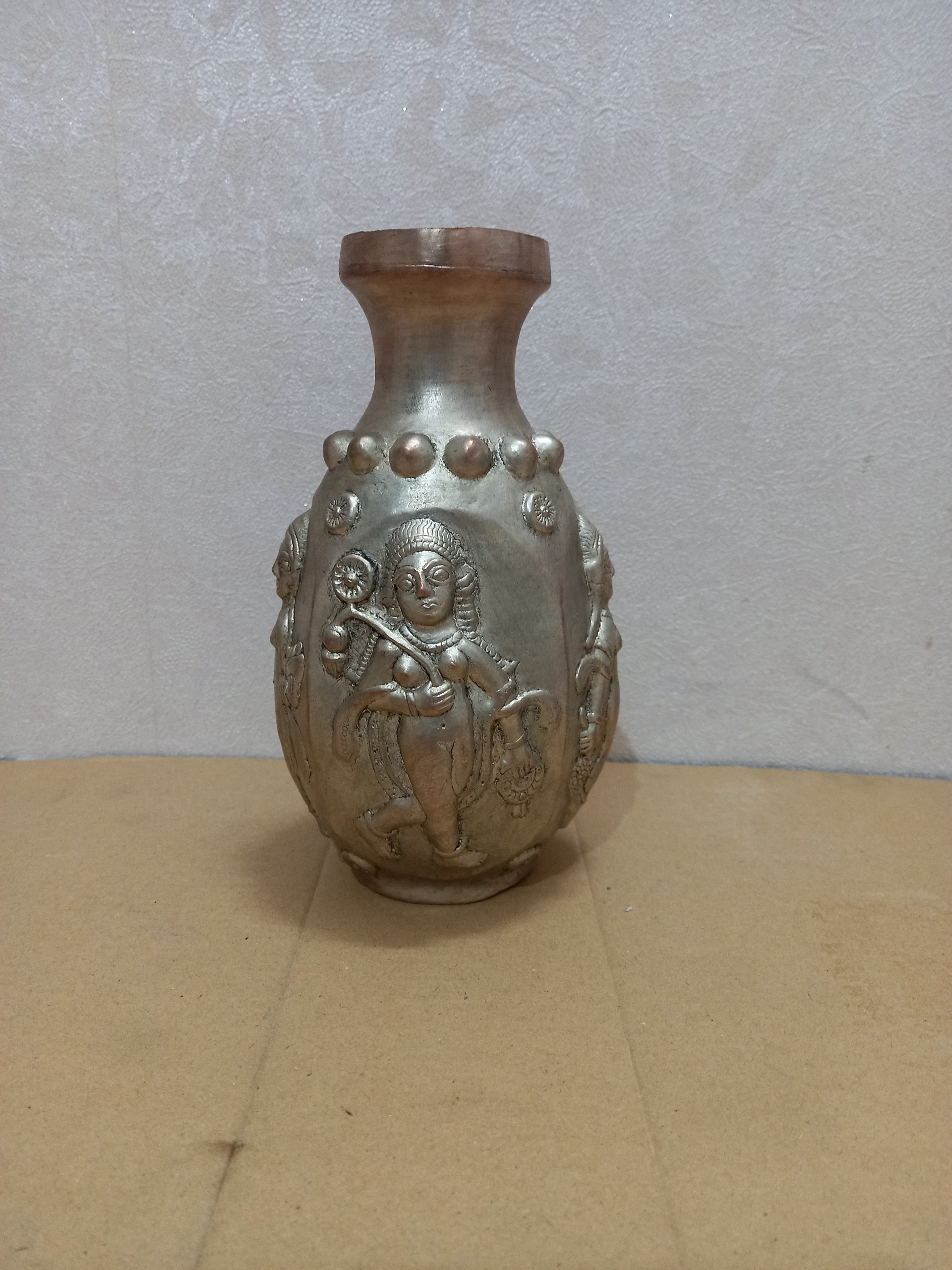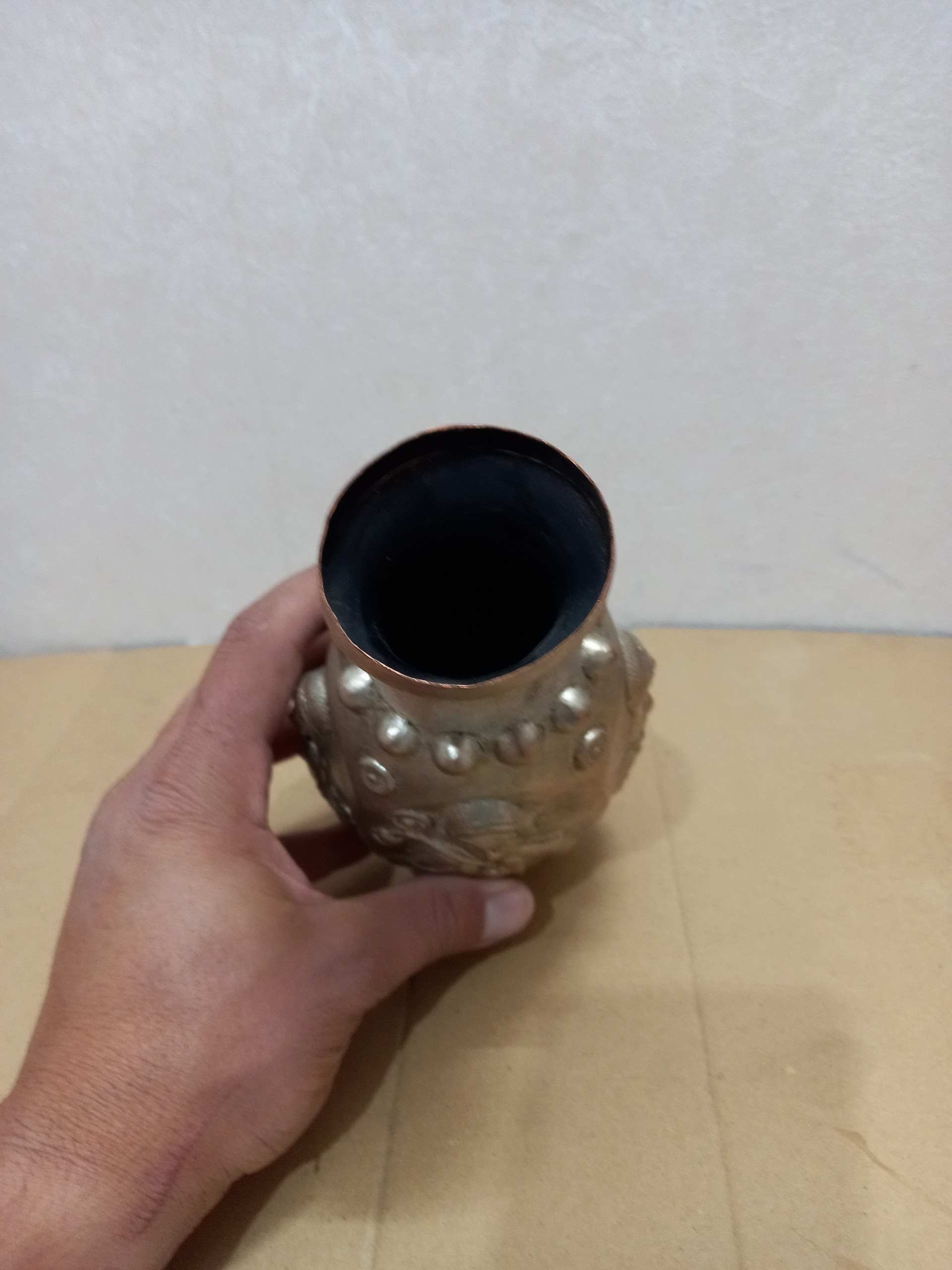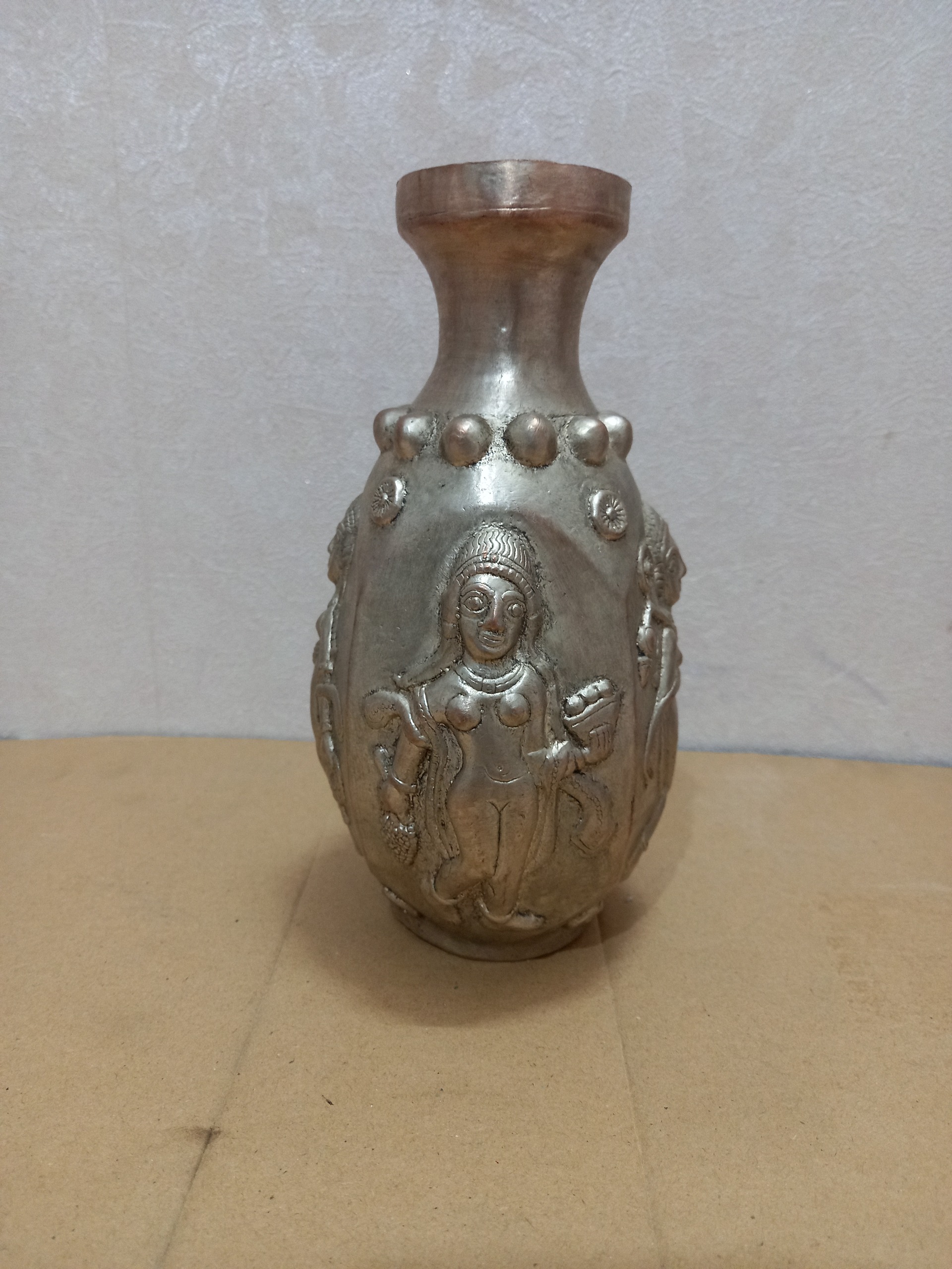 گلدان مسی ابکاری نقرهای باطراحی بینظیر ودرجه1 اندازه 18سانت نقش برجسته زن باستانی دکوری وکلکسیونی هدیه وکادوی ماندگار