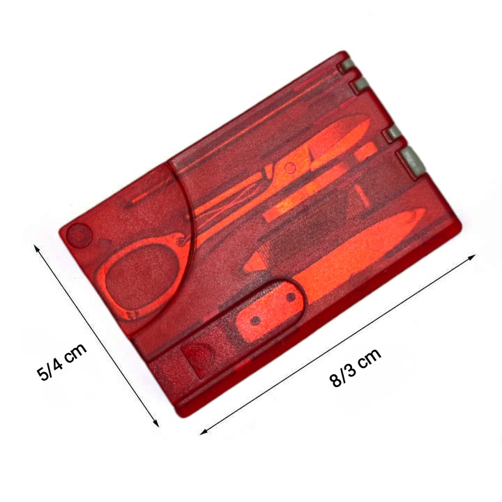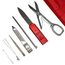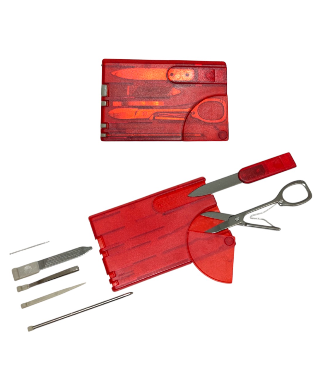 دارای ابزارهایی از جمله چاقو، قیچی، سوزن، سوهان، خودکار، موچین، خلال دندان و خط کش